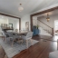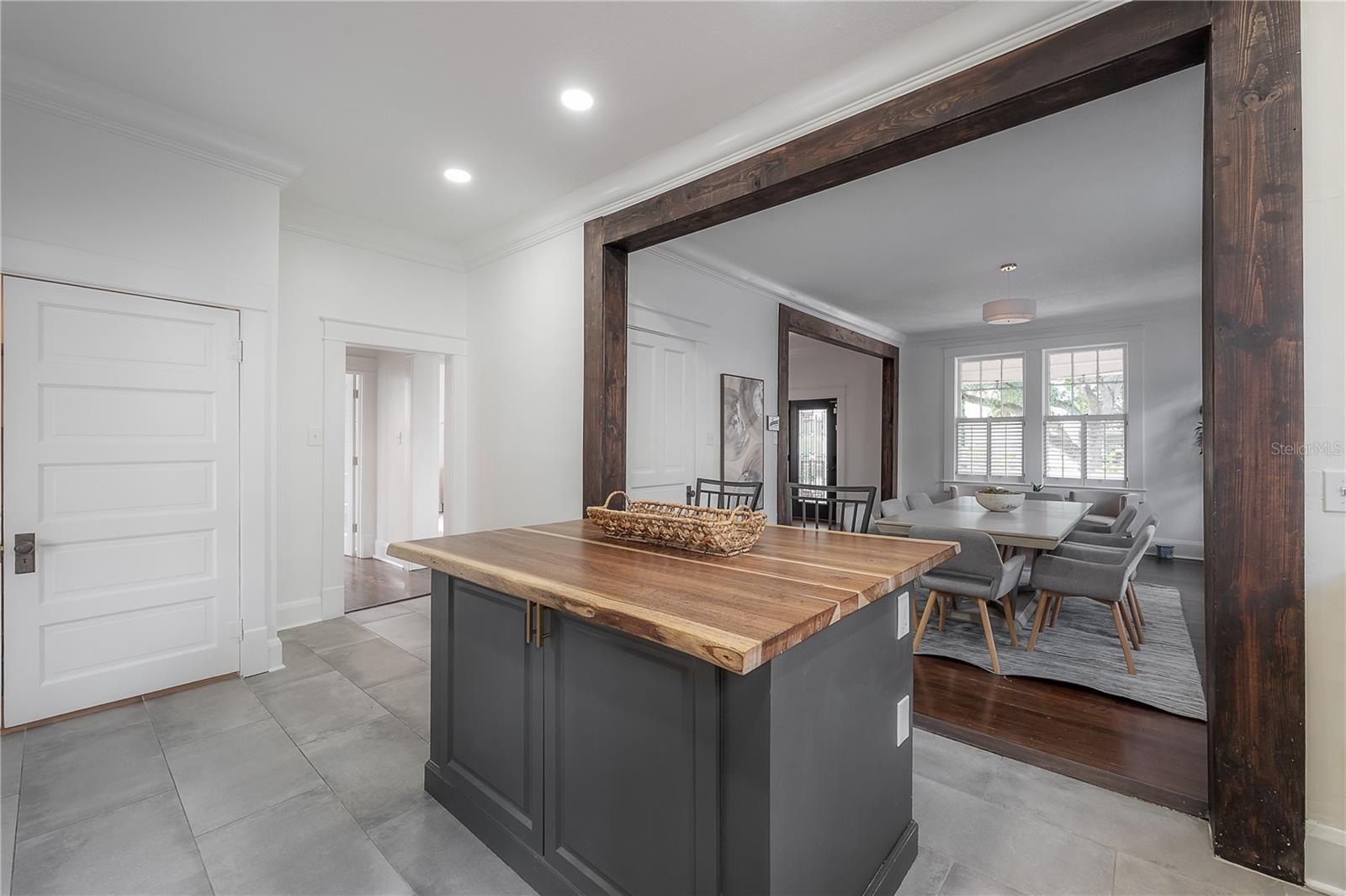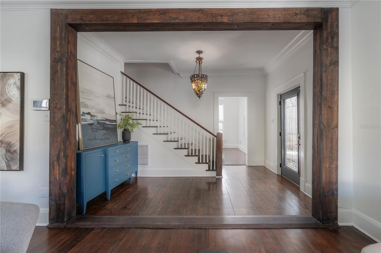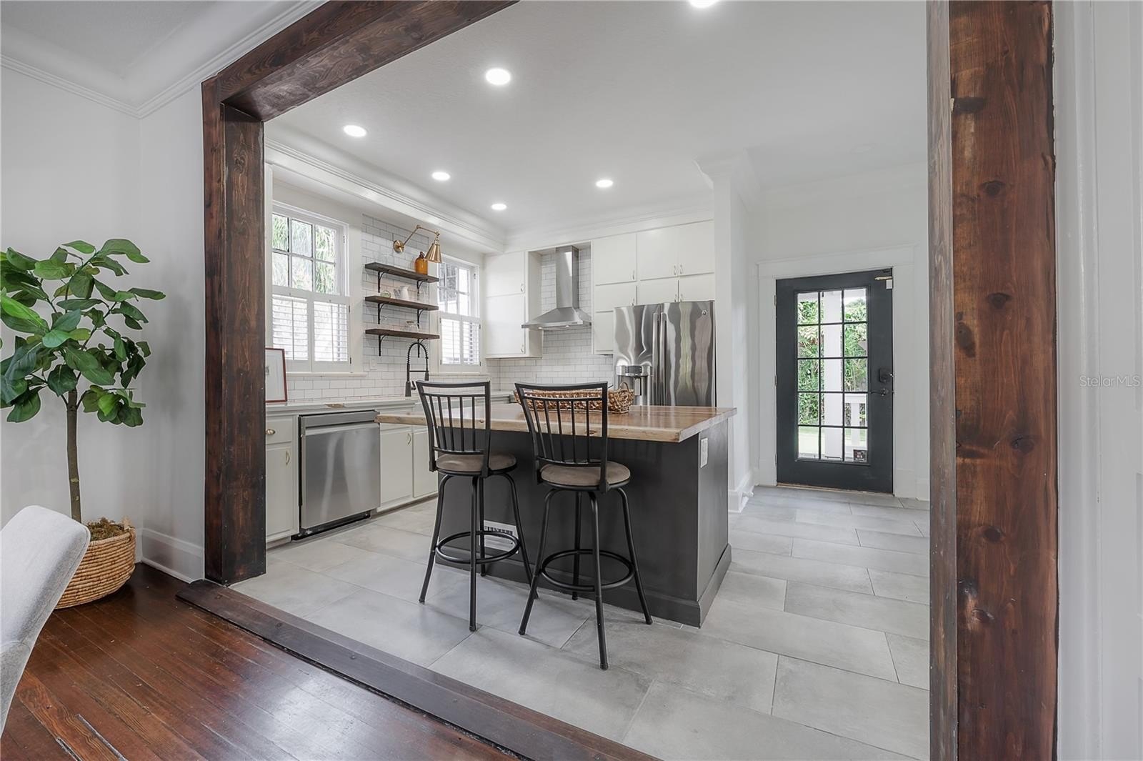 Inside, every detail tells a story. Refinished hardwood floors, a solid wood staircase, and vintage glass-paneled doors showcase timeless craftsmanship. High ceilings and classic millwork preserve the home’s history, while modern updates add a touch of luxury. The formal dining room flows seamlessly into the designer kitchen, featuring quartz countertops, a butcher block island, gas range, slate gray tile flooring, and stylish open shelving — a perfect balance of elegance and functionality.