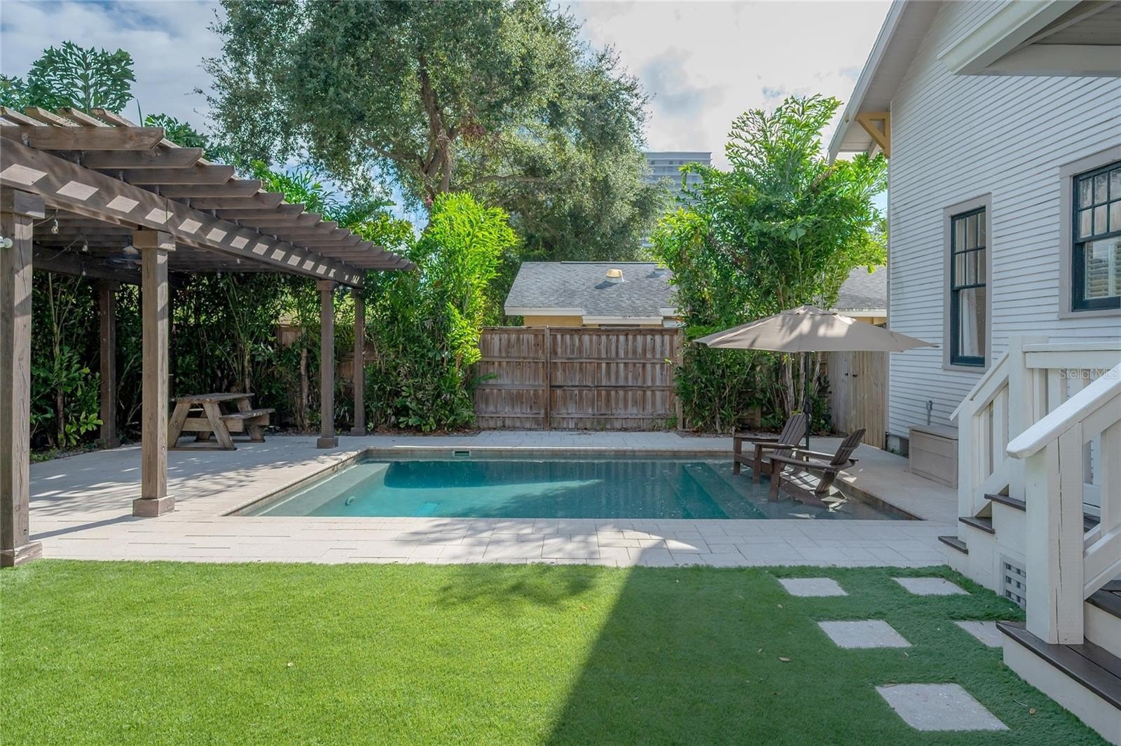 Step outside to your own private resort-style retreat — an entertainer’s dream with a PebbleTec pool, sun deck, and custom pergola perfect for relaxing, lounging, or dining al fresco. The expansive green space with a removable shade sail creates endless possibilities for outdoor living and weekend gatherings.