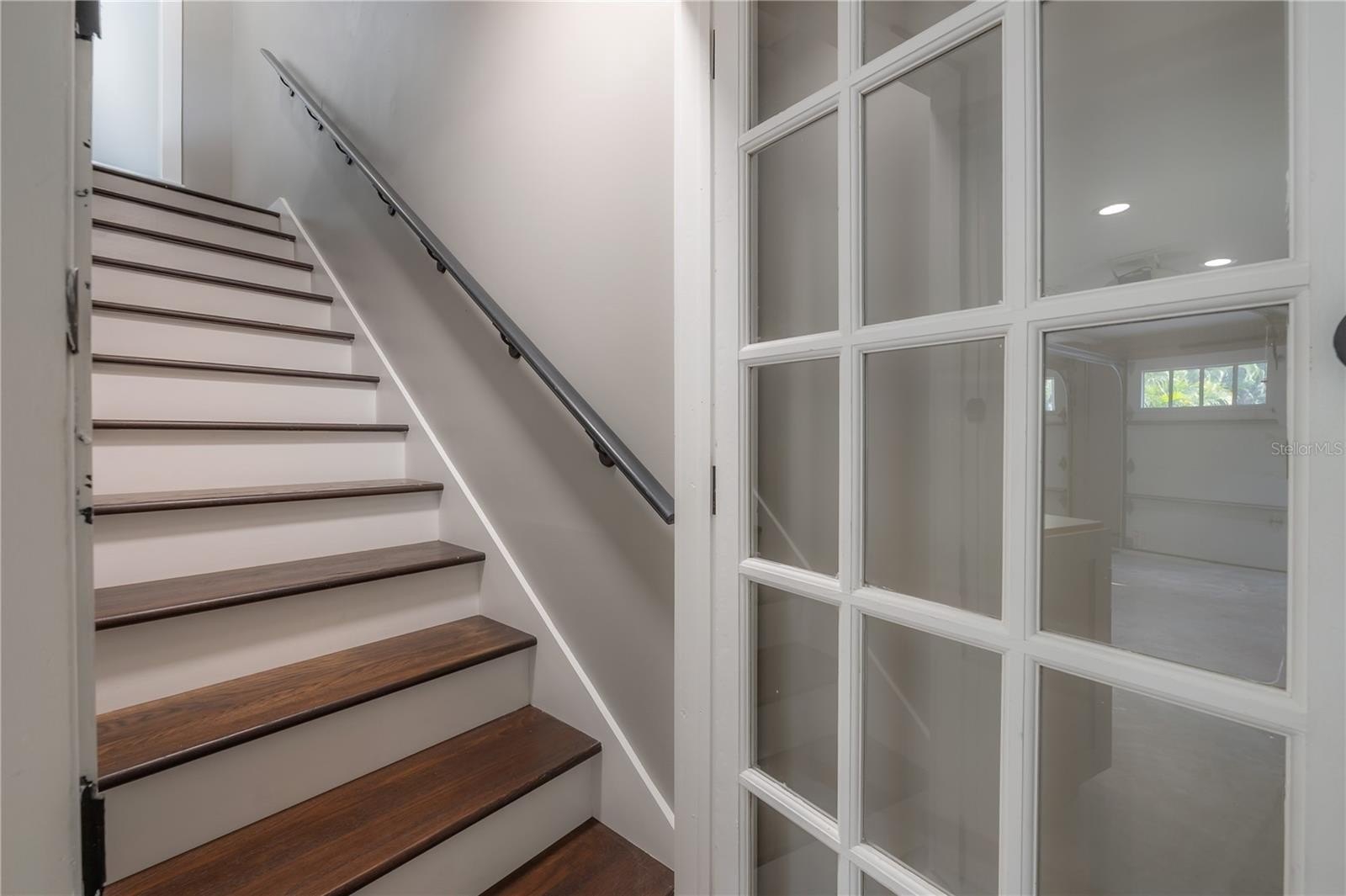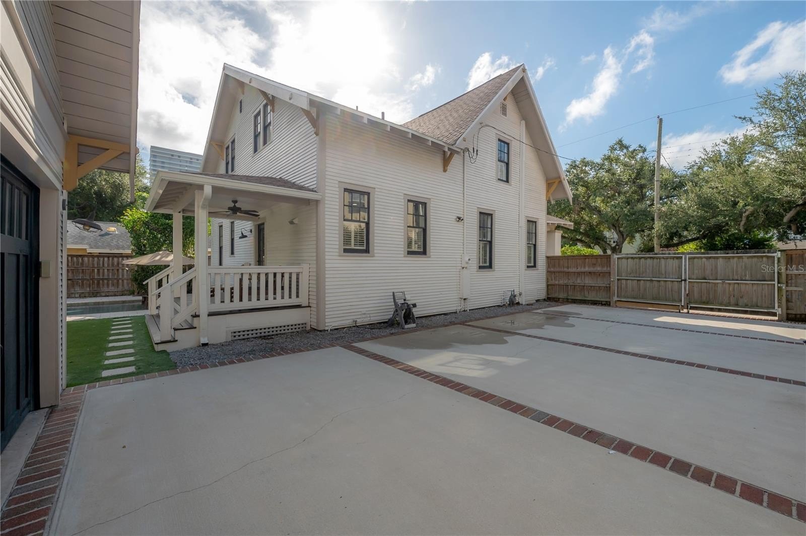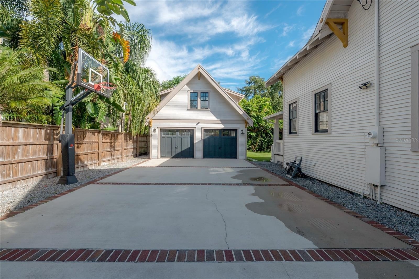 A brick-lined driveway leads to the newly constructed carriage house-style two-car garage, complete with a half pool bath, workshop, and an upstairs 525 sq ft finished bonus/media room featuring engineered hardwood floors, theater wiring, and a dedicated HVAC system — perfect for a private studio, guest suite, or creative workspace.
