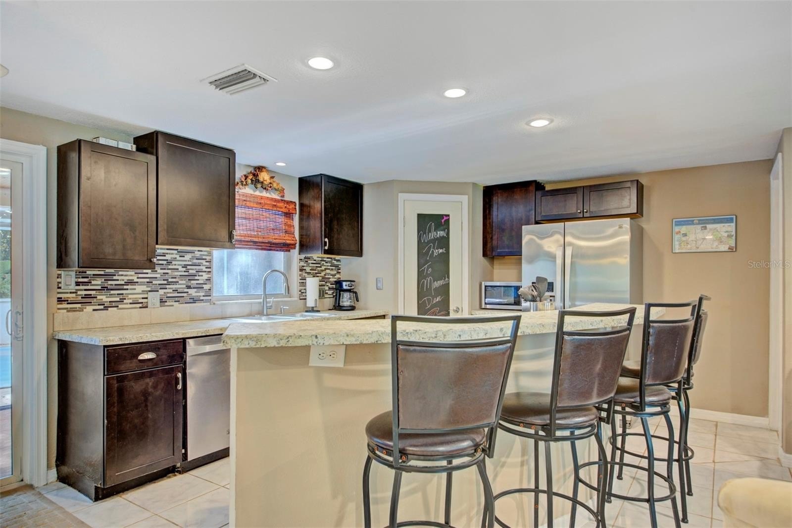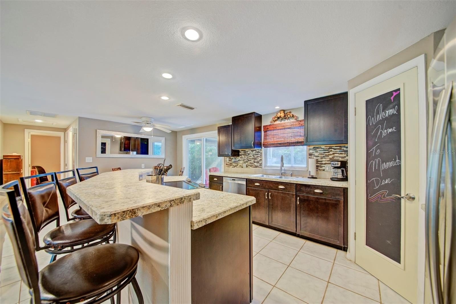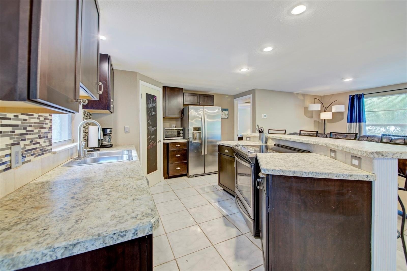 The open-concept living area is light, bright, and welcoming anchored by a tastefully updated kitchen with rich cabinetry, gleaming stainless steel appliances, and a breakfast bar perfect for entertaining. Tile flooring throughout creates a seamless flow, while recessed lighting adds a modern touch.