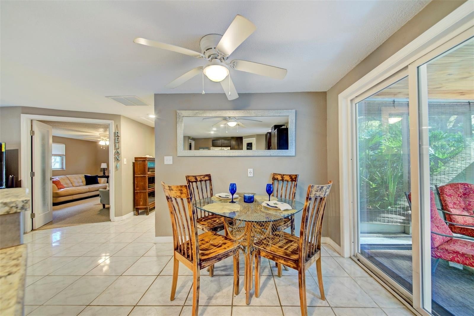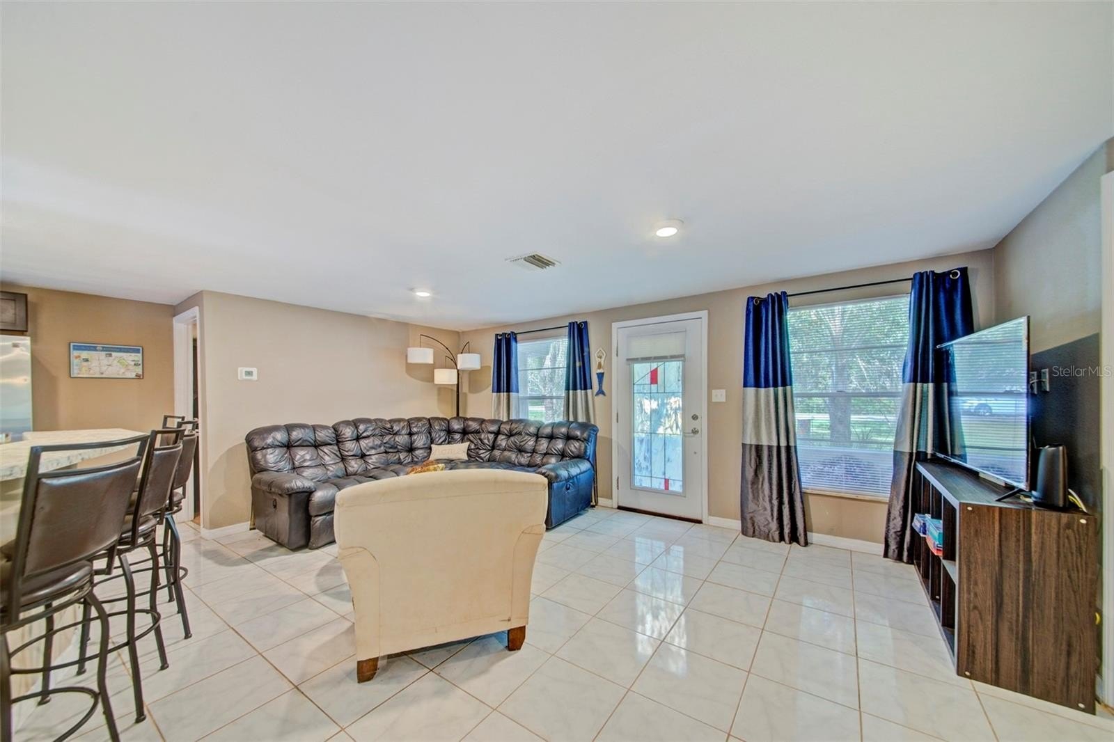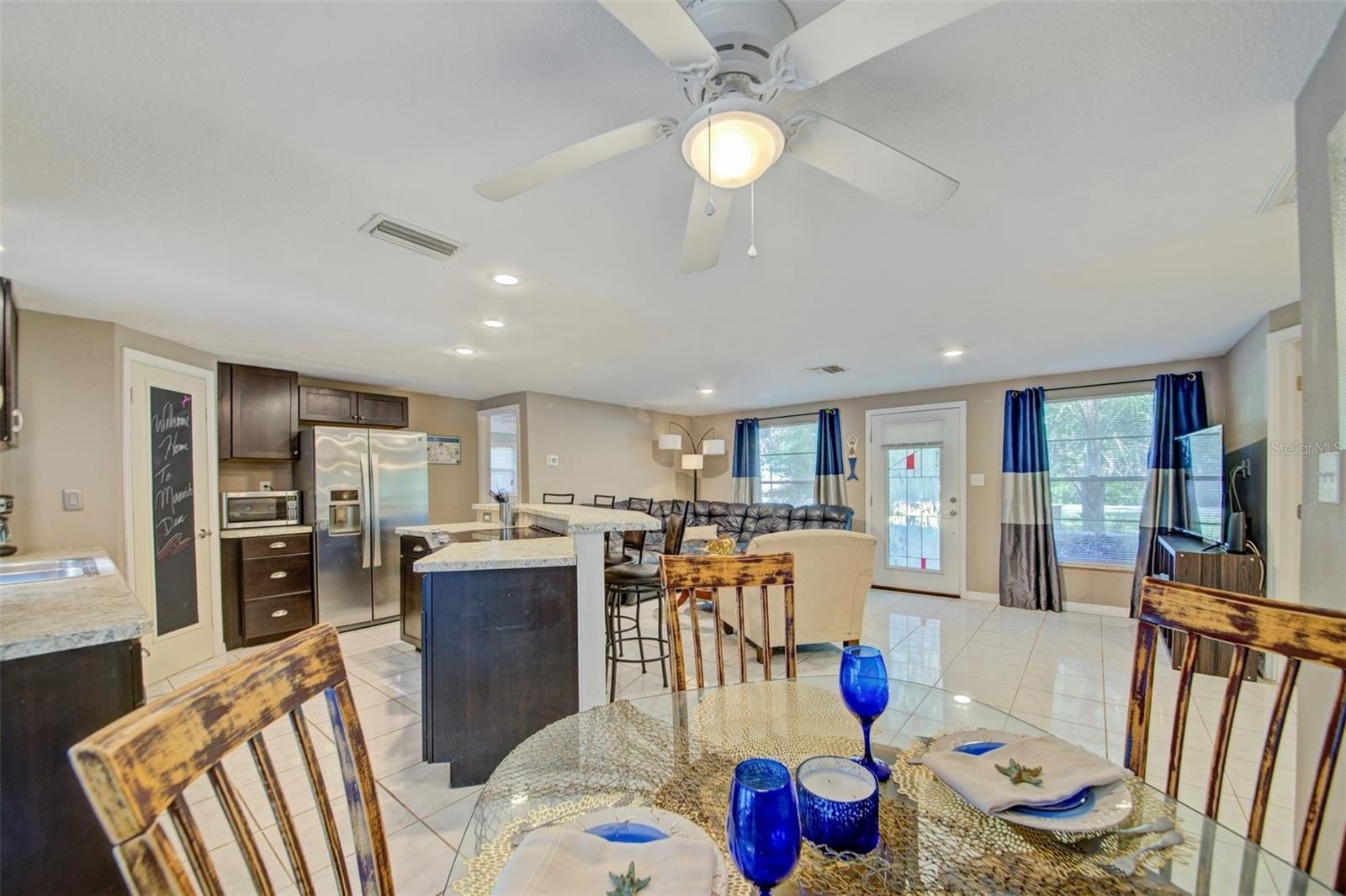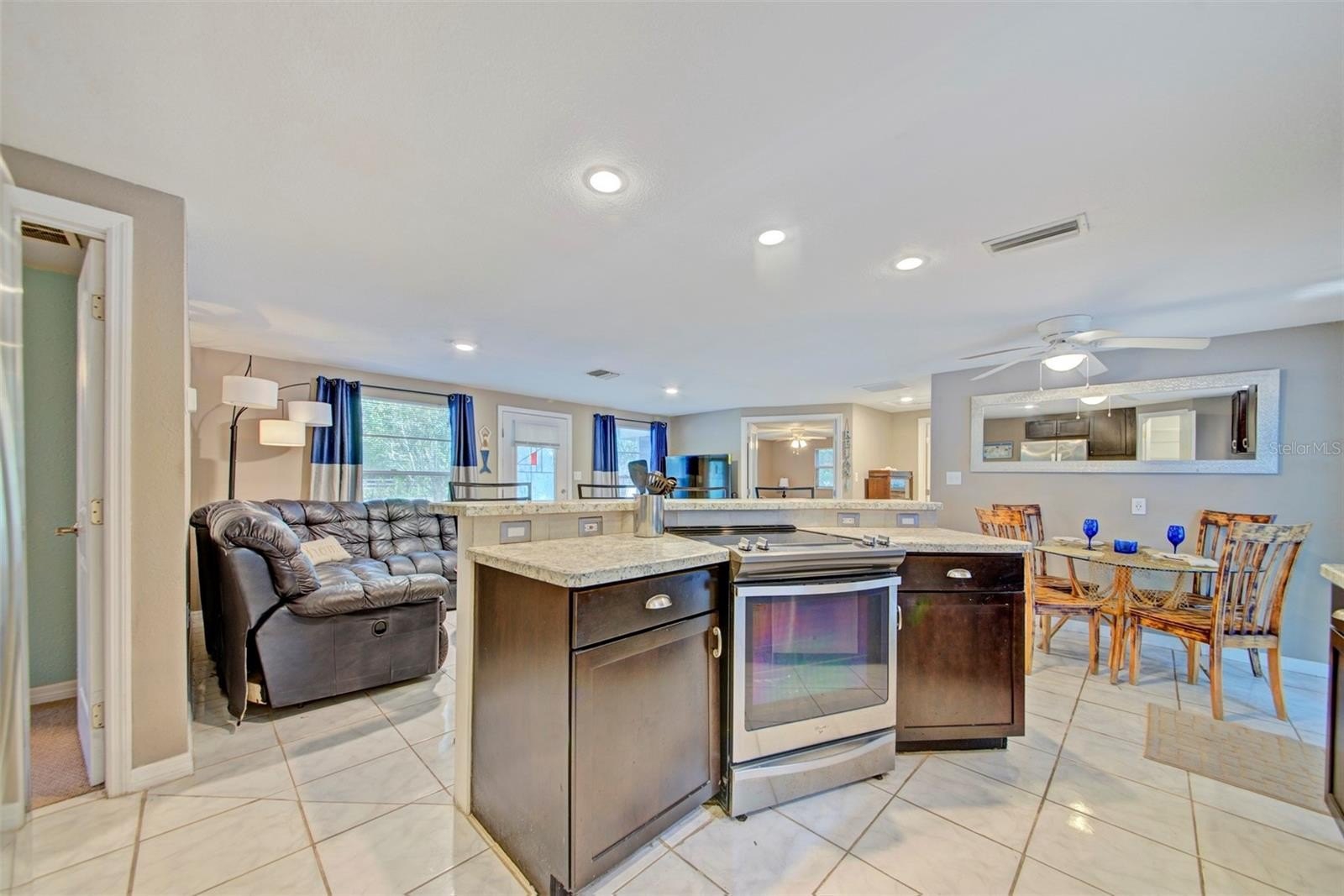 The open-concept living area is light, bright, and welcoming anchored by a tastefully updated kitchen with rich cabinetry, gleaming stainless steel appliances, and a breakfast bar perfect for entertaining. Tile flooring throughout creates a seamless flow, while recessed lighting adds a modern touch.