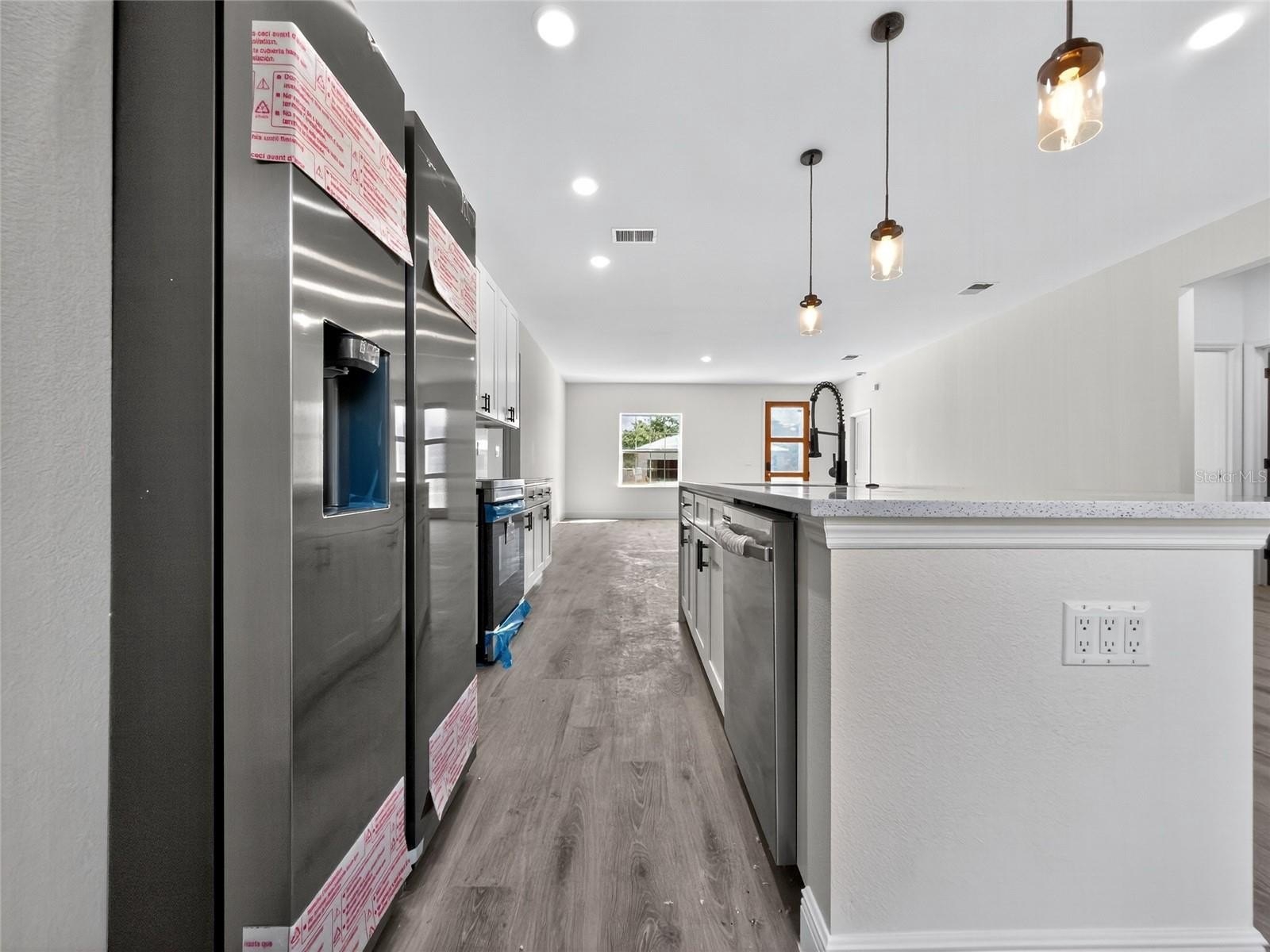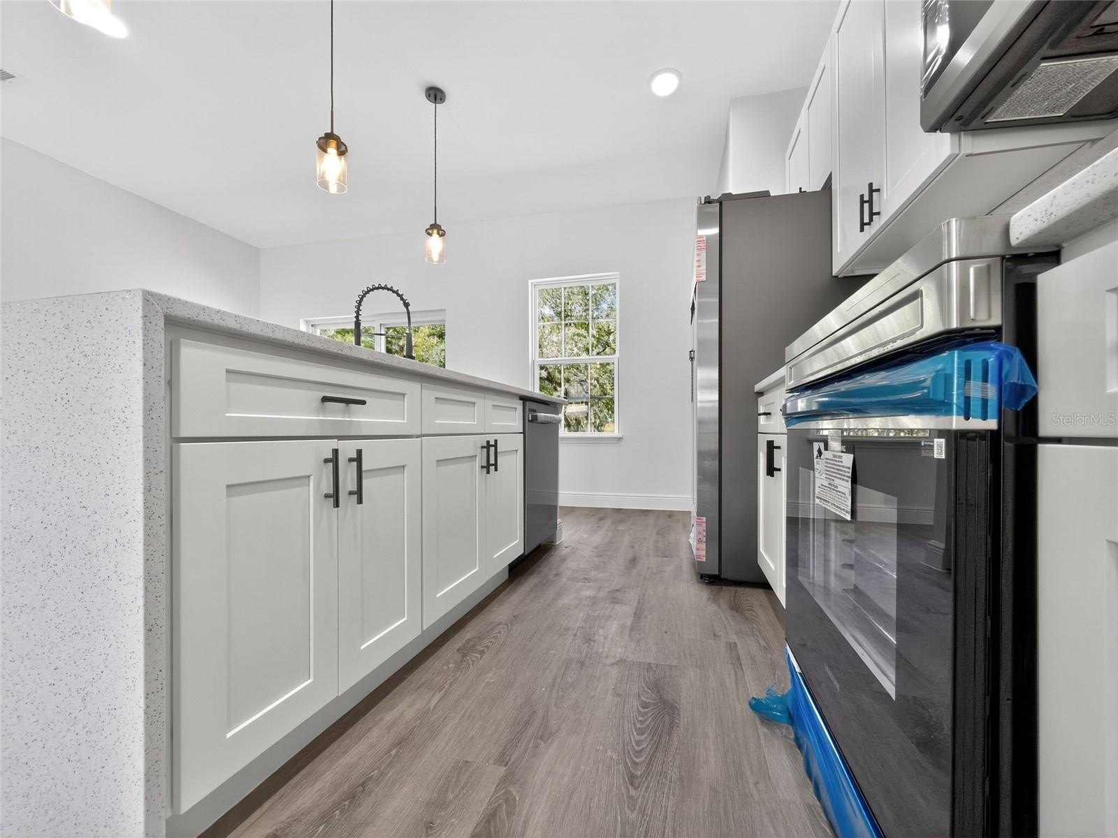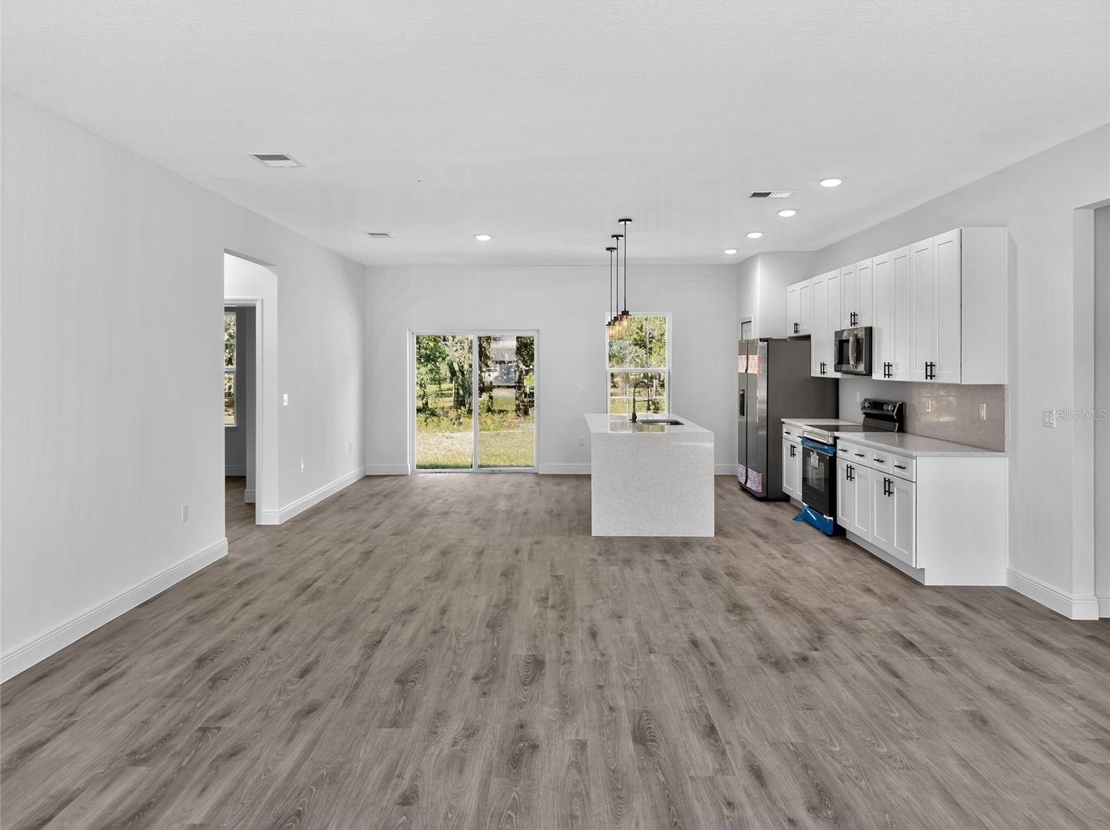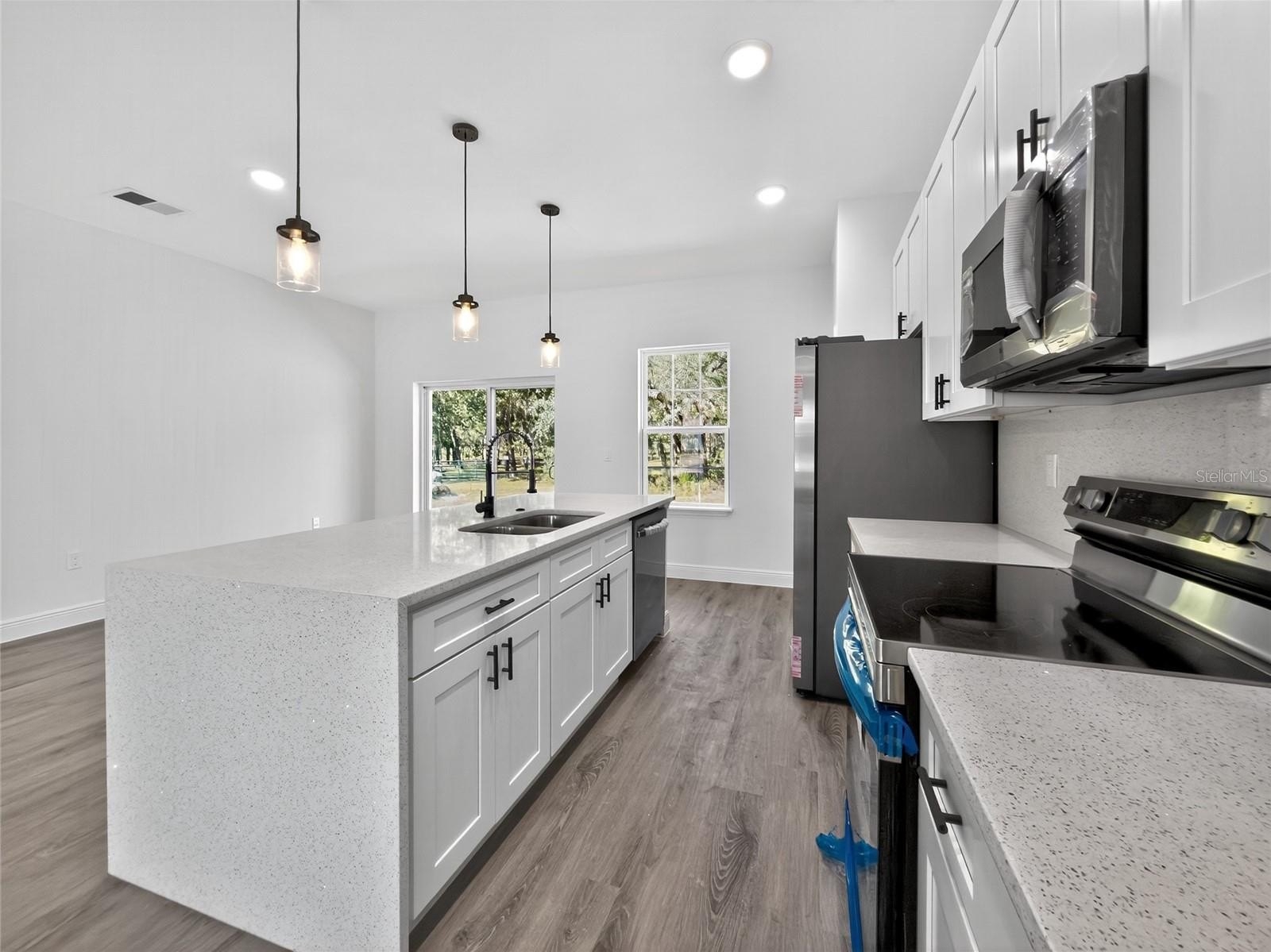 Step inside to an open floorplan that features a large, airy living room and a generously sized dining area—ideal for entertaining or relaxing with loved ones. The kitchen is a true showstopper, boasting solid wood cabinets, elegant stone countertops, and sleek appliances included, making it a chef’s delight from day one.