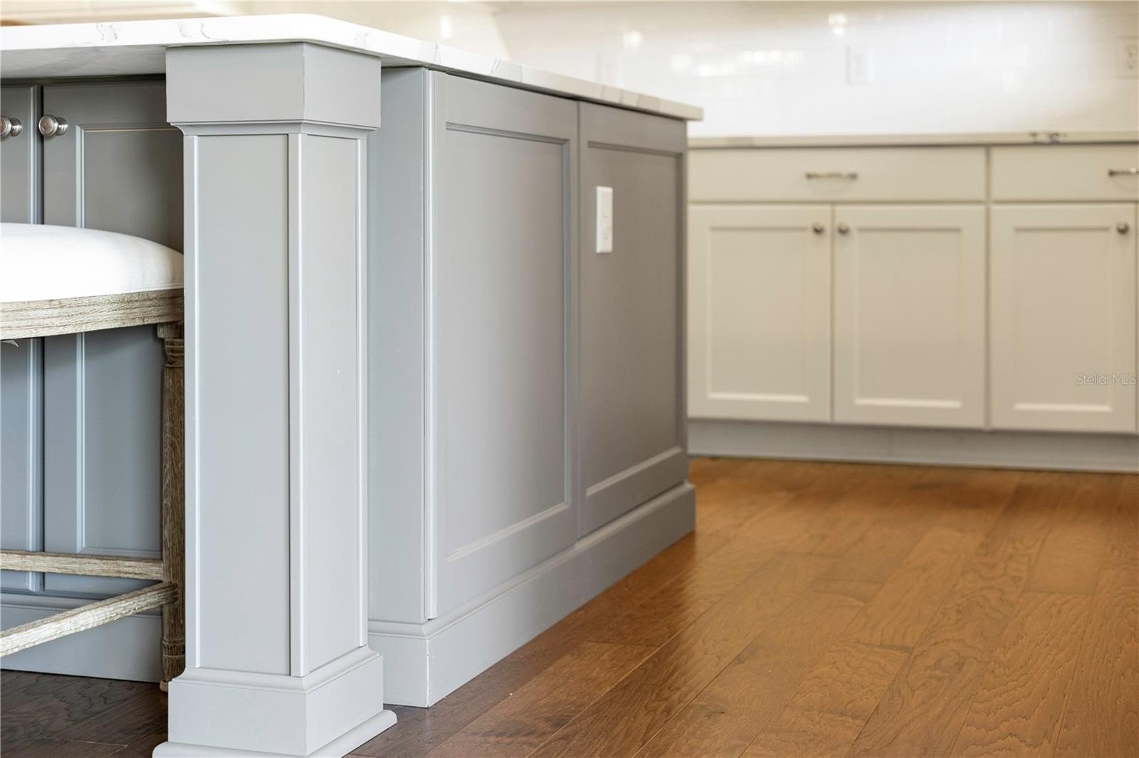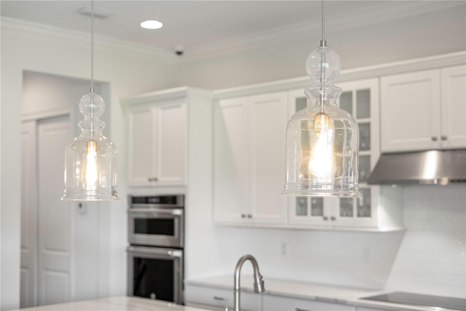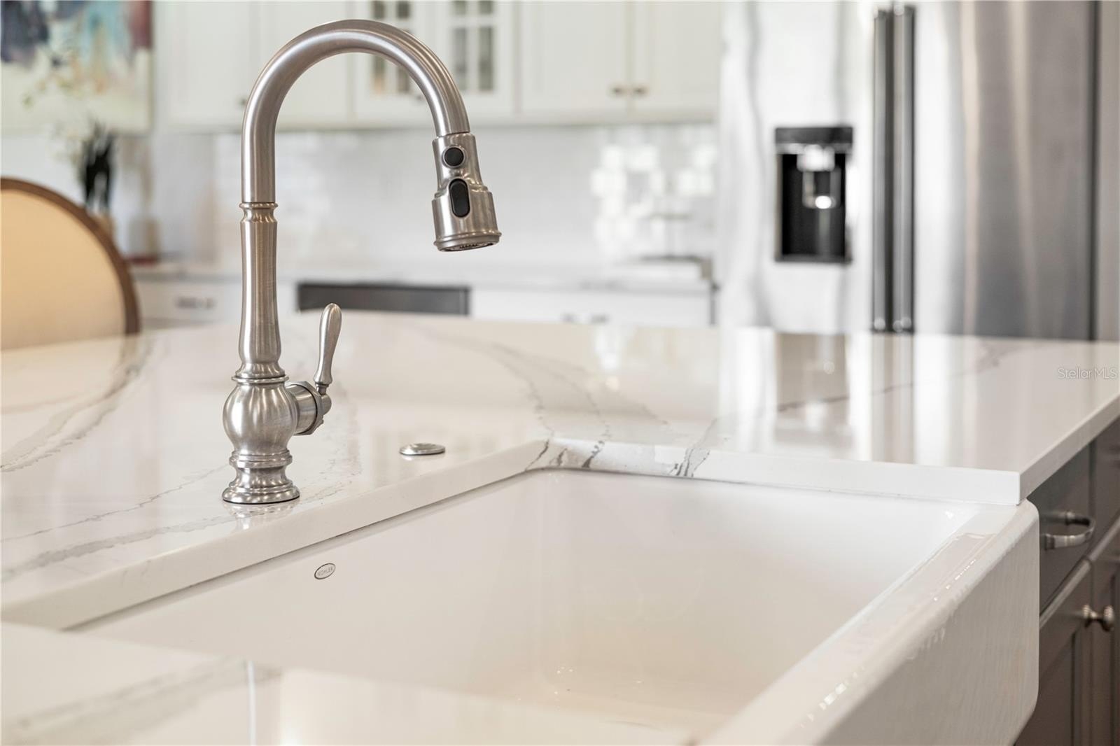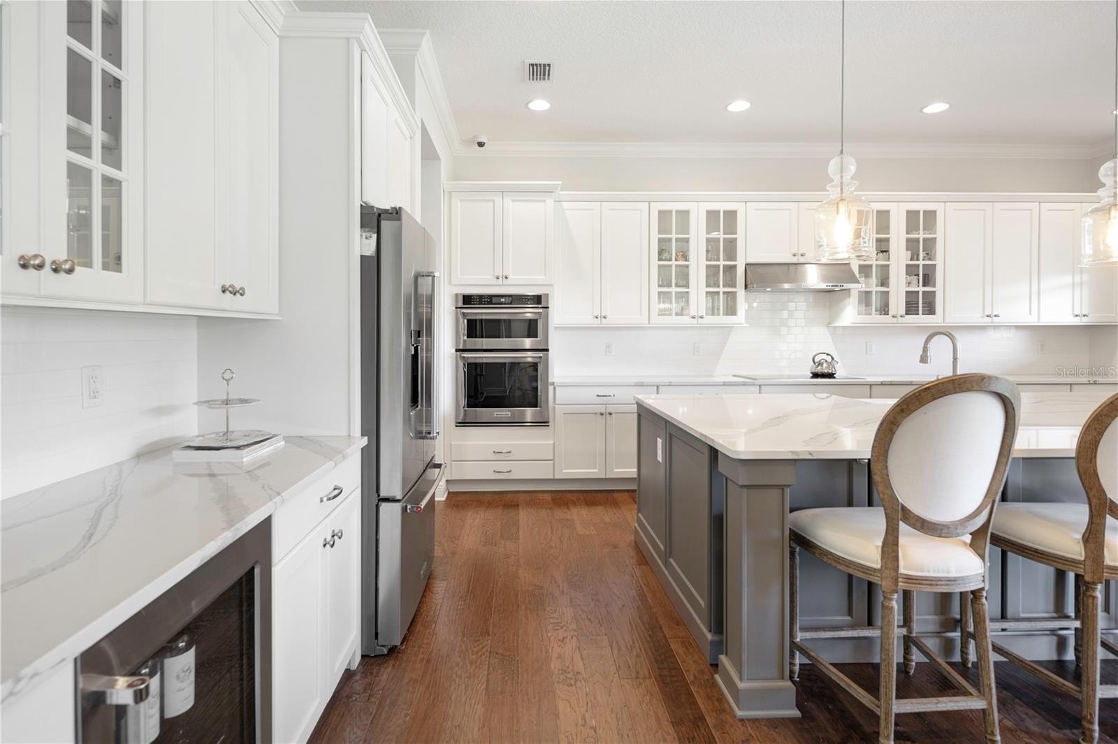 Gourmet kitchen with an oversized marble island, 42” cabinetry, KitchenAid stainless steel appliances, and an open layout that flows seamlessly into the main living areas, perfect for entertaining.