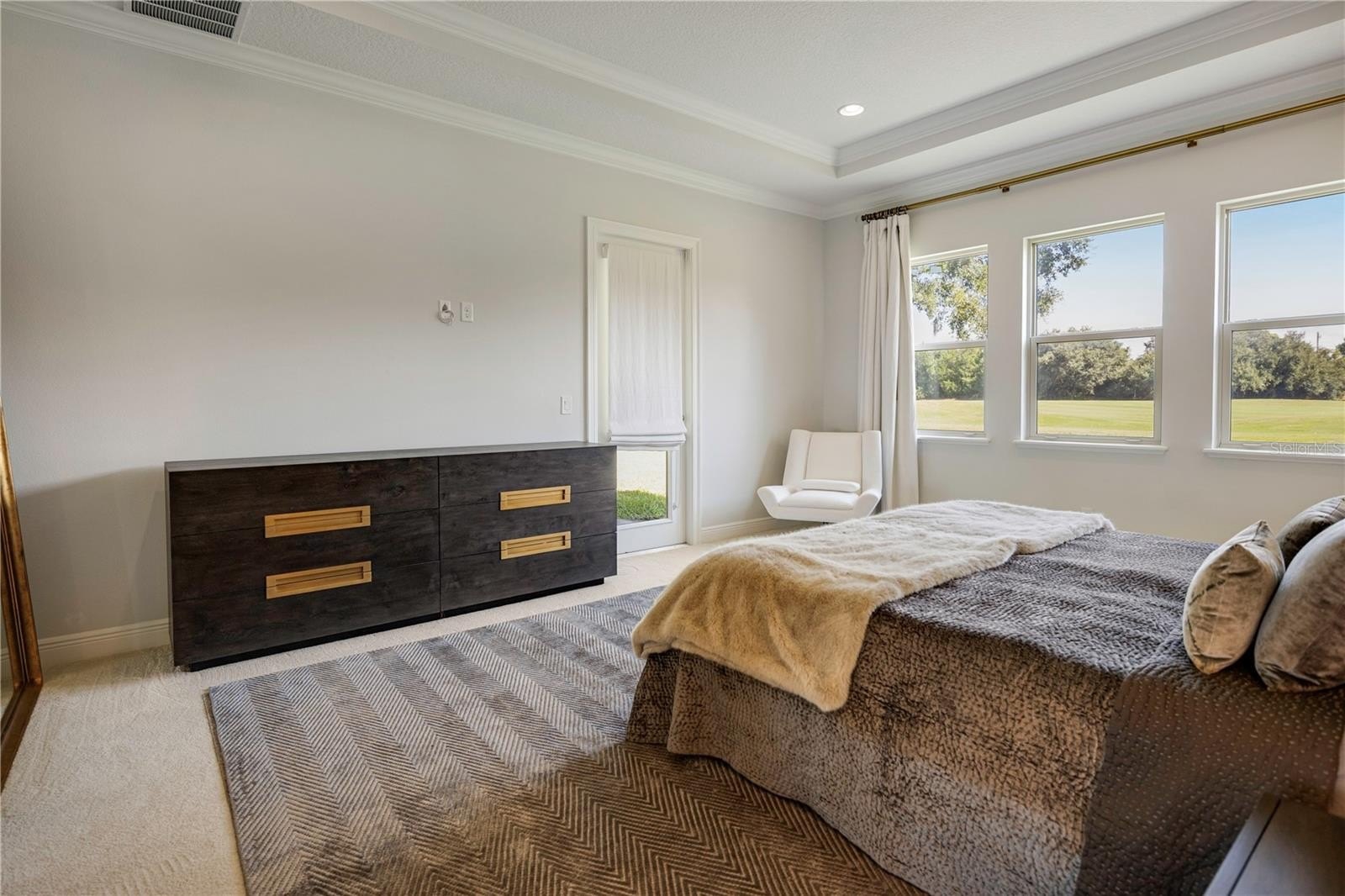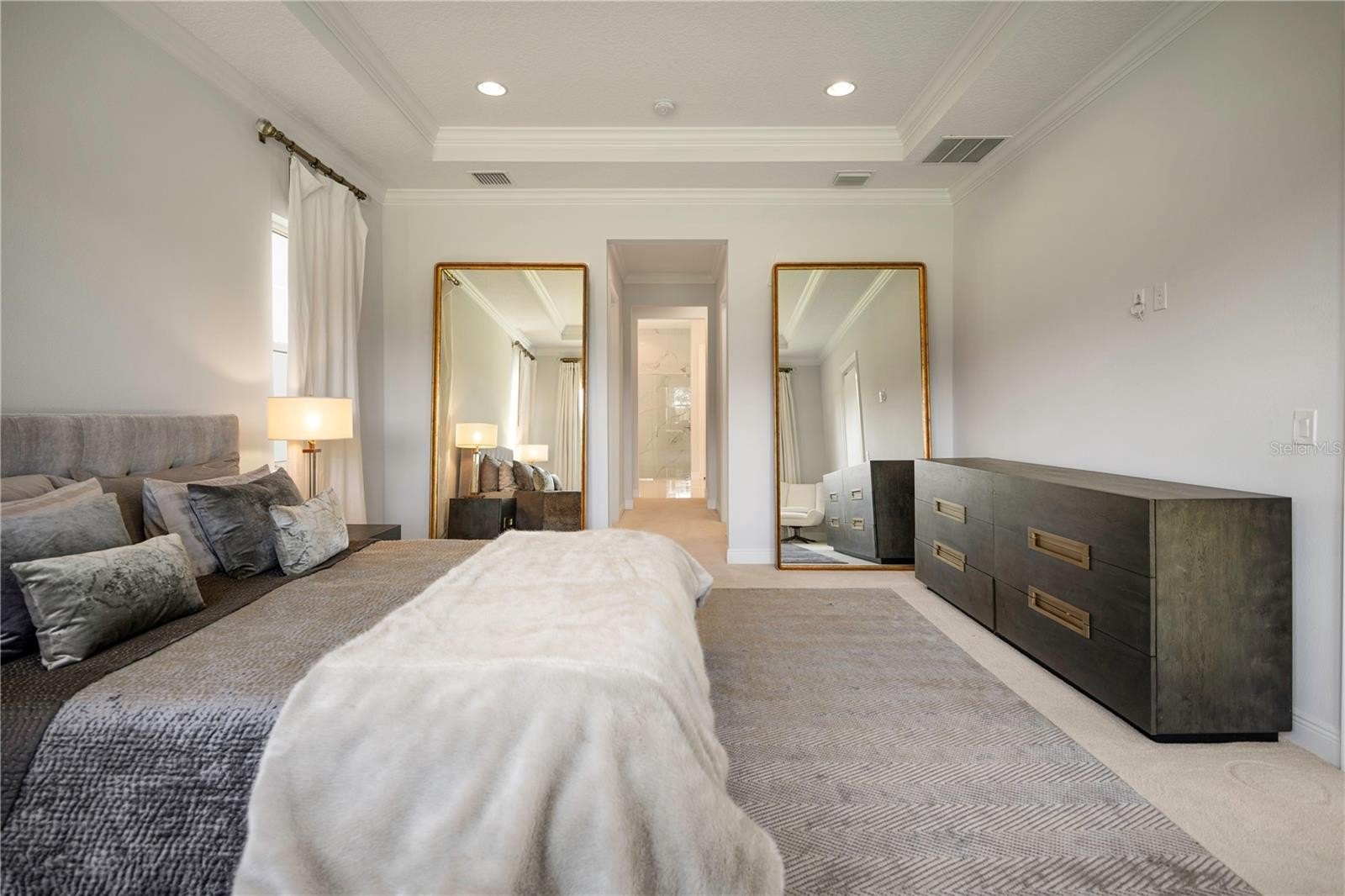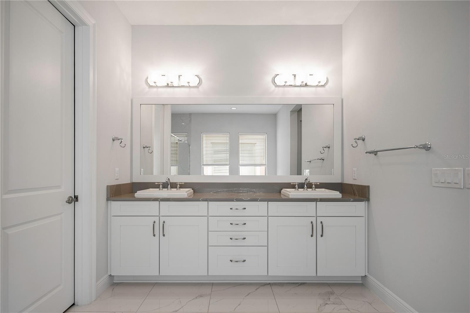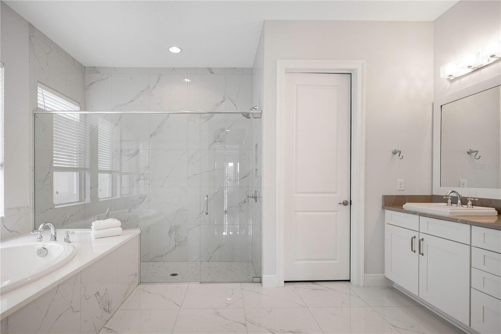 Primary suite conveniently located on the first floor, featuring direct access to the outdoor area, dual his and hers walk-in closets, and a spacious spa-like bathroom.