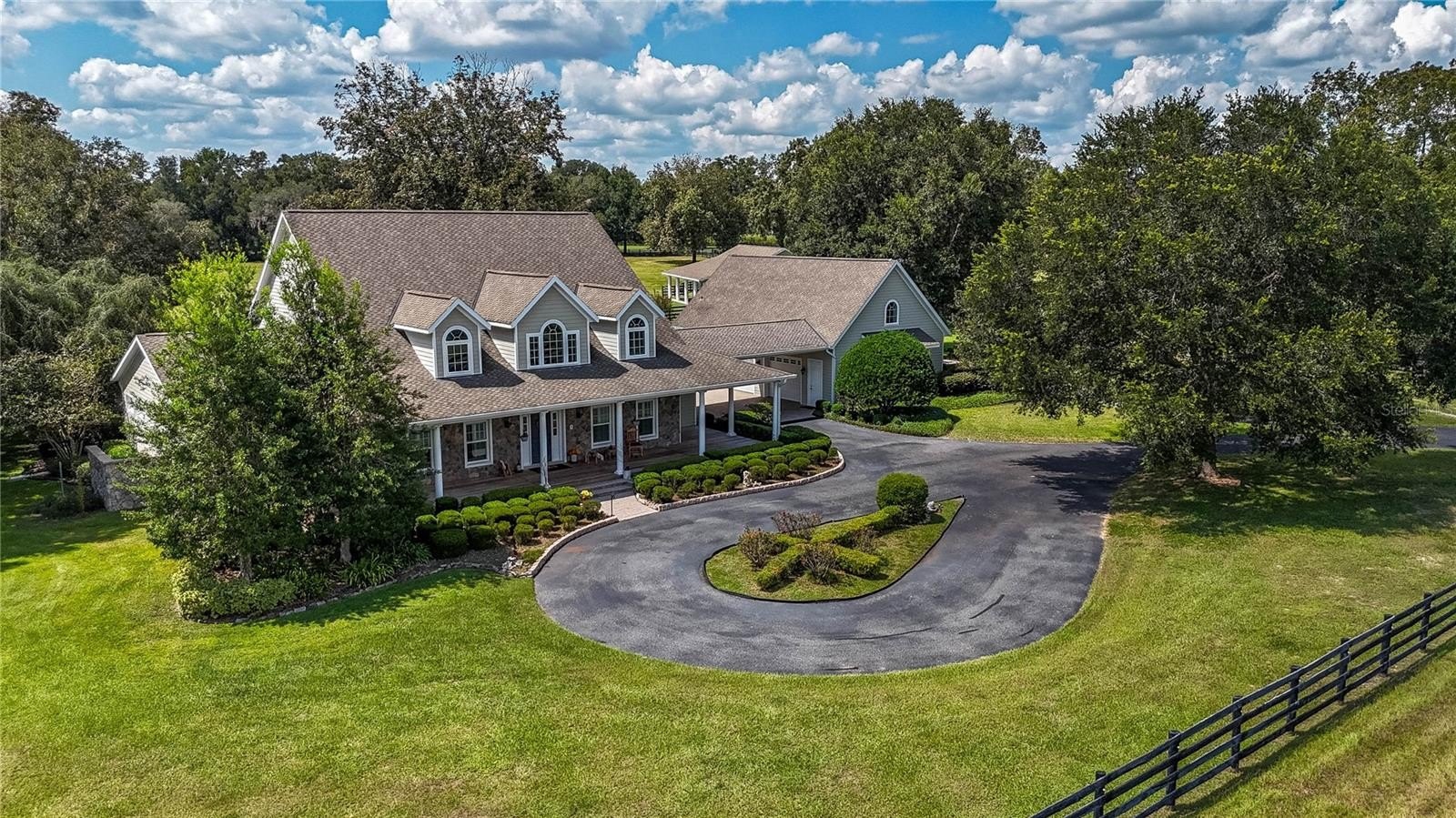 Welcome to this stunning 5-bedroom, 6-bathroom, 4,871 SF custom American Farmhouse on 10.5 acres in the gated community of Equine Estates. Built by Mega Construction in 2006, this exceptional home is crafted for those who value fine craftsmanship, privacy, and an equestrian lifestyle. Enjoy direct access to the 110-mile Marjorie Harris Carr Cross Florida Greenway—ride straight from your property to the Florida Horse Park, or explore three miles of private community bridle paths beneath majestic granddaddy oaks.