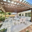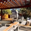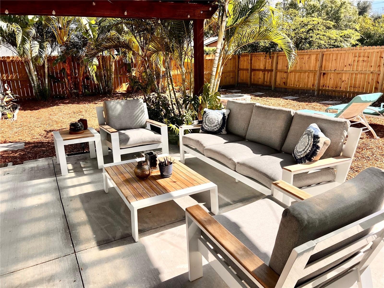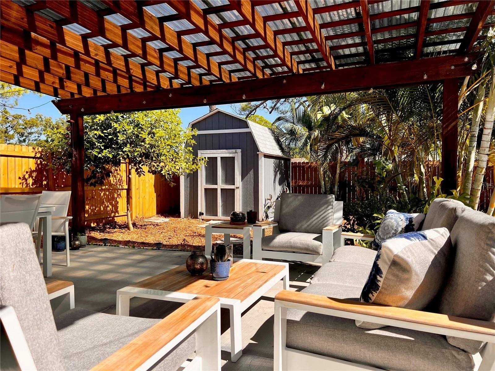 The fenced backyard is designed for easy maintenance, featuring a covered pergola, fire pit, expansive patio, and storage shed — ideal for relaxing or hosting friends outdoors.