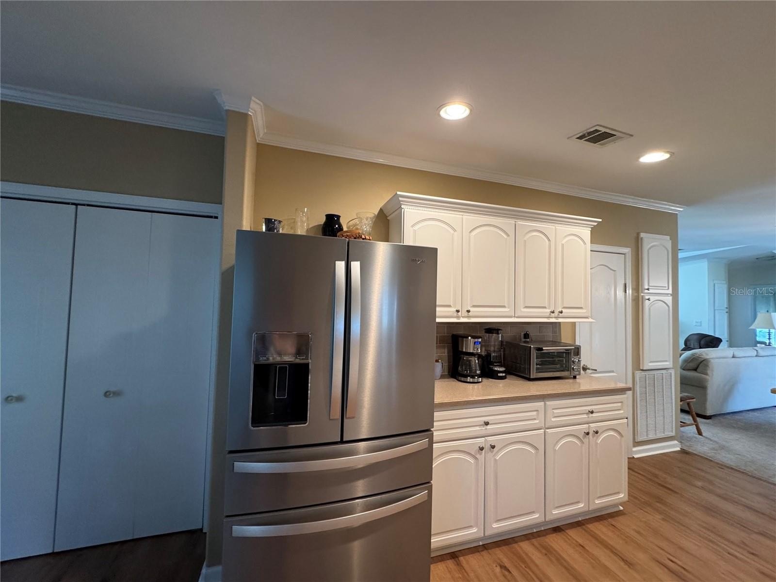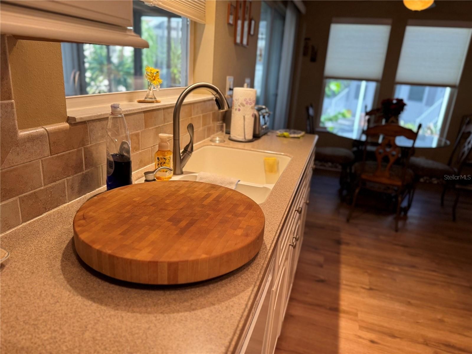 Step inside to find a bright and open floor plan featuring vaulted ceilings, laminate flooring, and designer trim accents in the living area. The kitchen is both functional and inviting, with a walk-in pantry, breakfast nook, and separate dining area — ideal for everyday meals or entertaining guests.