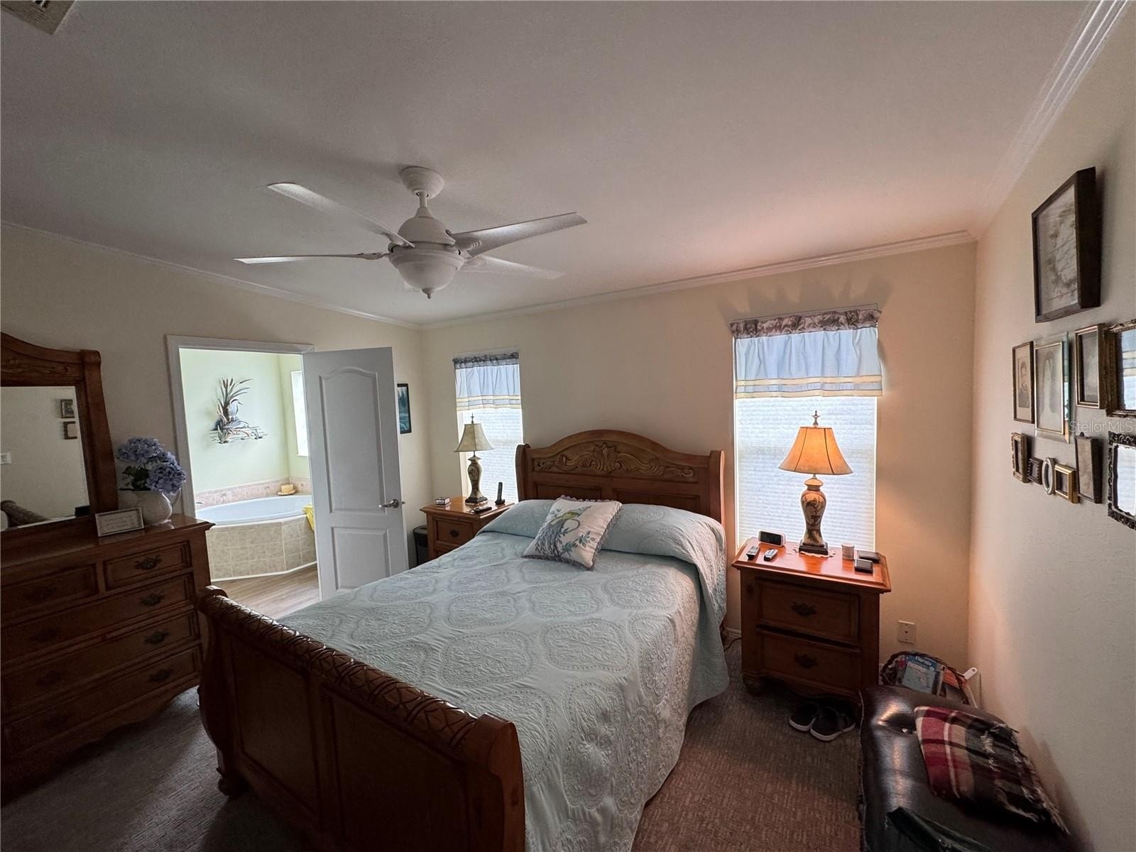 The split-bedroom layout offers privacy and space for everyone. The primary suite includes a large ensuite bathroom with double vanities, a jetted garden tub, and a walk-in shower with built-in bench seating. The second bedroom features charming interior glass French doors, making it perfect for a home office, den, or library. The third bedroom is equally inviting, with fresh carpeting, a ceiling fan, and easy access to the second full bath.
