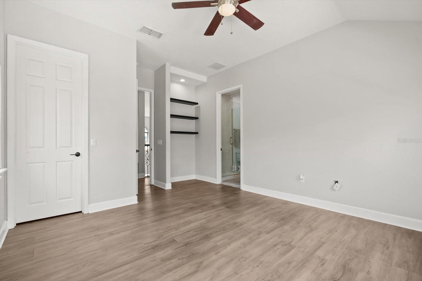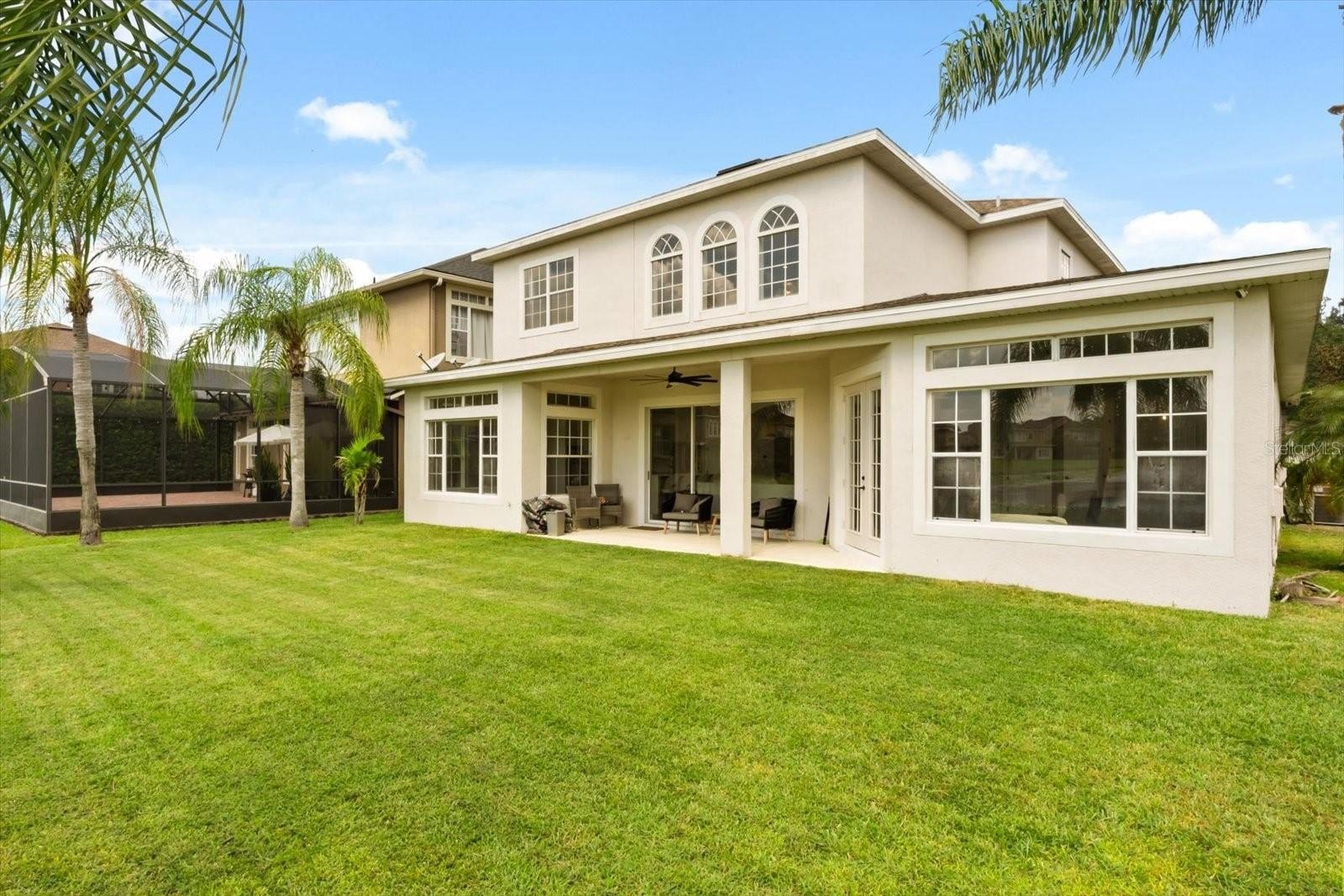 Outdoors, enjoy tranquil water views from the covered patio surrounded by lush landscaping and cooling ceiling fans. With a three-car garage, high ceilings, and thoughtful upgrades throughout, this home balances sophistication with warmth.