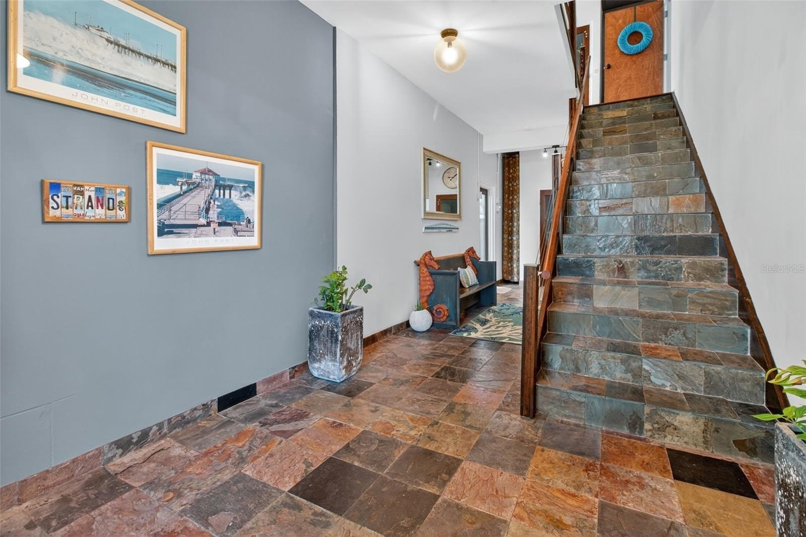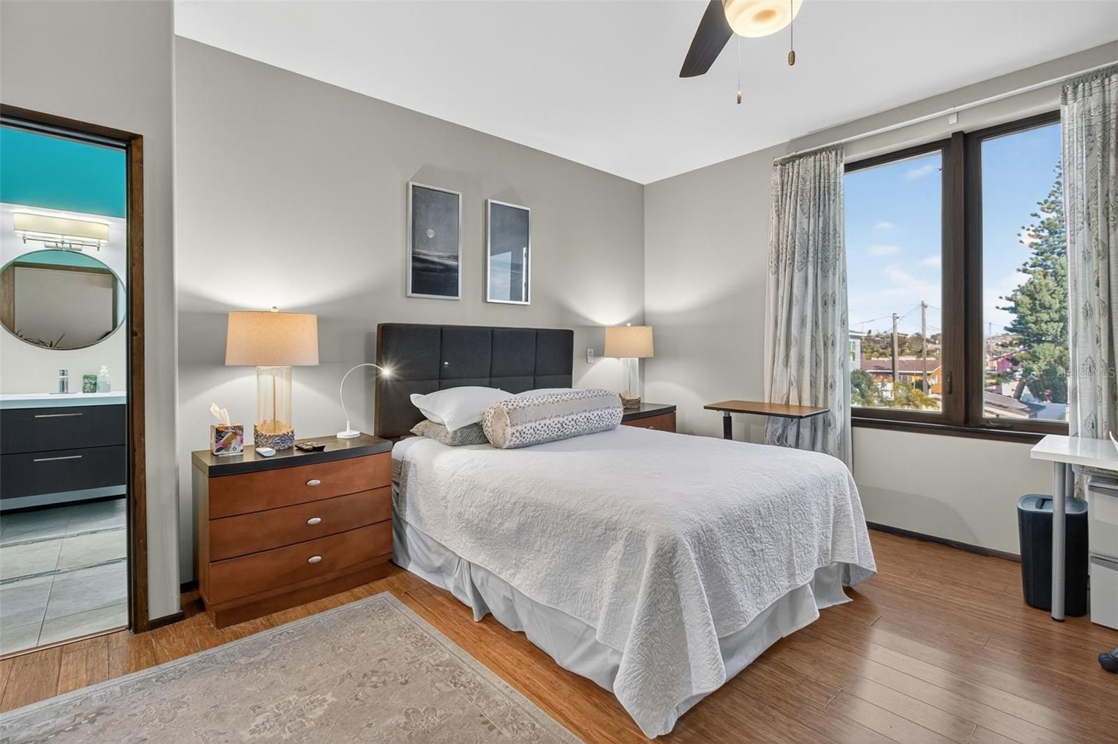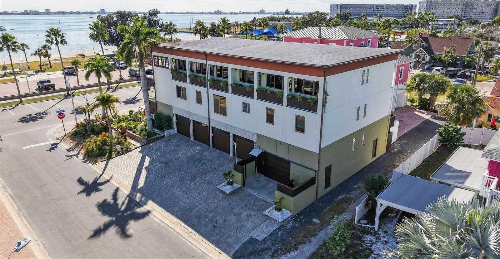 The top floor is a true sanctuary—your personal haven with 3 bedrooms, a beautifully designed office, and breathtaking views of Boca Ciega Bay. Bask in natural light on rich mahogany floors beneath soaring vaulted ceilings. The gourmet kitchen, equipped with a gas stove and expansive island, leads to a covered veranda where sunsets paint the sky, perfect for entertaining or evenings of relaxation.
