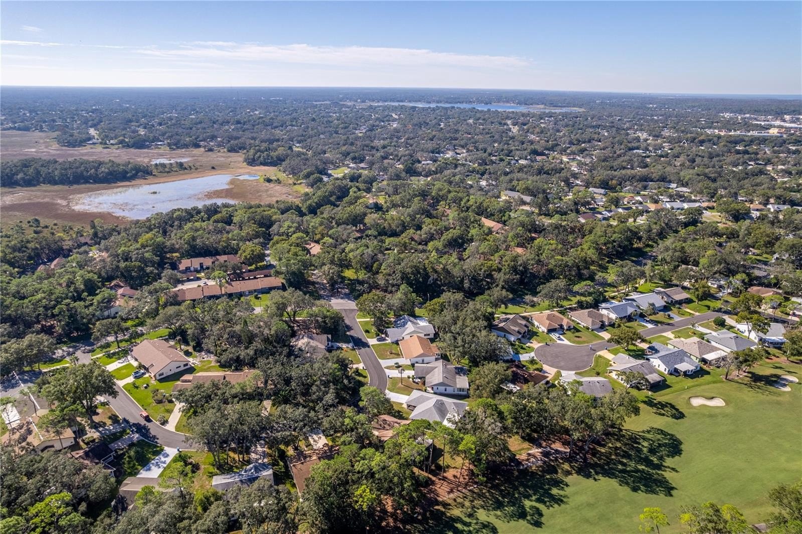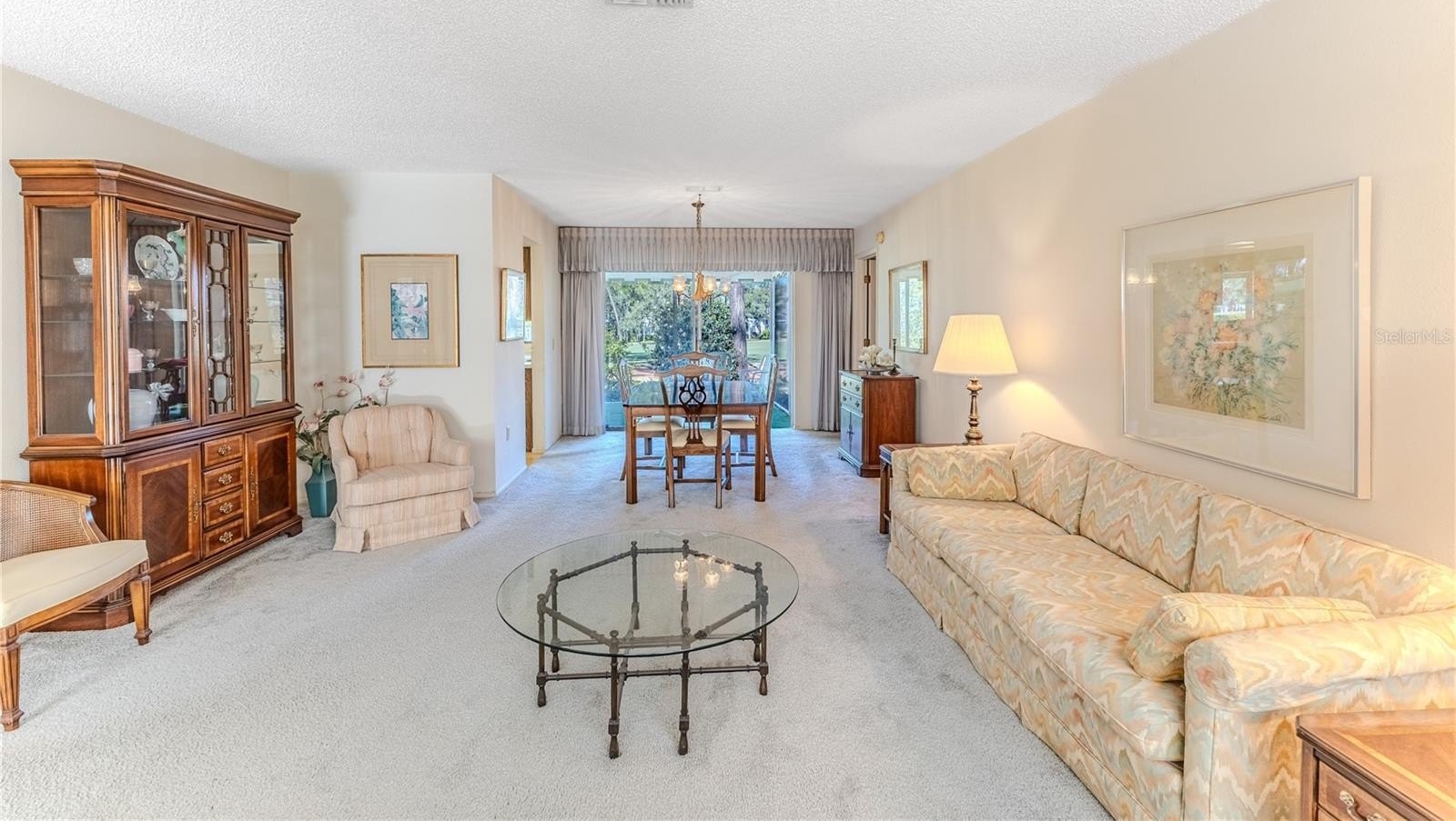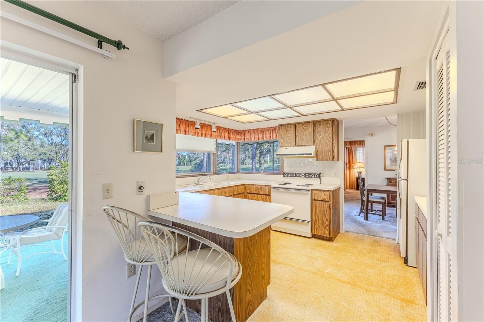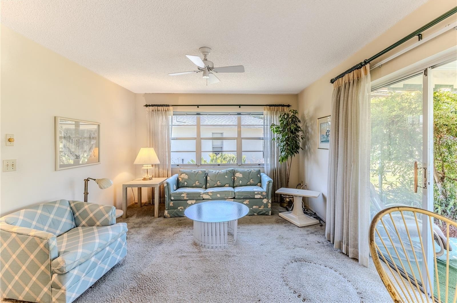 This charming Buttonwood model is a 2-bedroom, 2-bathroom 2-car garage home located on Hole #1 of The Lakes Golf Course, featuring peaceful views of lush greens and gardens. Step onto the inviting covered front porch and into the spacious living and dining room combination, ideal for relaxing or entertaining. The primary suite features a large walk-in closet, vanity area, and an en-suite bathroom with a shower. The kitchen is bumped out to maximize space and takes full advantage of the stunning golf course views. Enjoy casual living in the family room, complete with a dry bar and ceiling fan, that opens seamlessly to the screened lanai—a perfect spot for true Florida living. The guest bedroom offers a generous closet and is conveniently located across from the full guest bathroom with a tub/shower combo. Additional highlights include: Furnished and move-in ready; Laundry room with utility sink, washer/dryer, and shelving; Two-car garage with extra storage; Hot water heater (2018); HVAC (2017); Roof (2007).; garage door (2021). Timber Pines is an award-winning, guard-gated, 55+ deed-restricted community. Residents enjoy three 18-hole golf courses, a 9-hole pitch & putt, tennis, 12 pickleball courts, two community swimming pools, a country club restaurant and bar, fitness center, billiards, performing arts center, woodworking shop, and over 100 social clubs and activities. If you're dreaming of a home with tranquil golf course views and beautiful gardens, this one awaits your personal touch. Call today to see this gem in person.