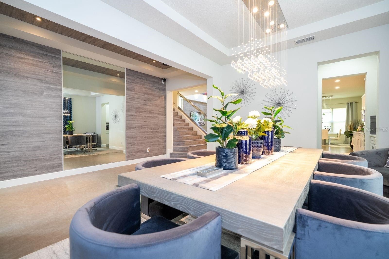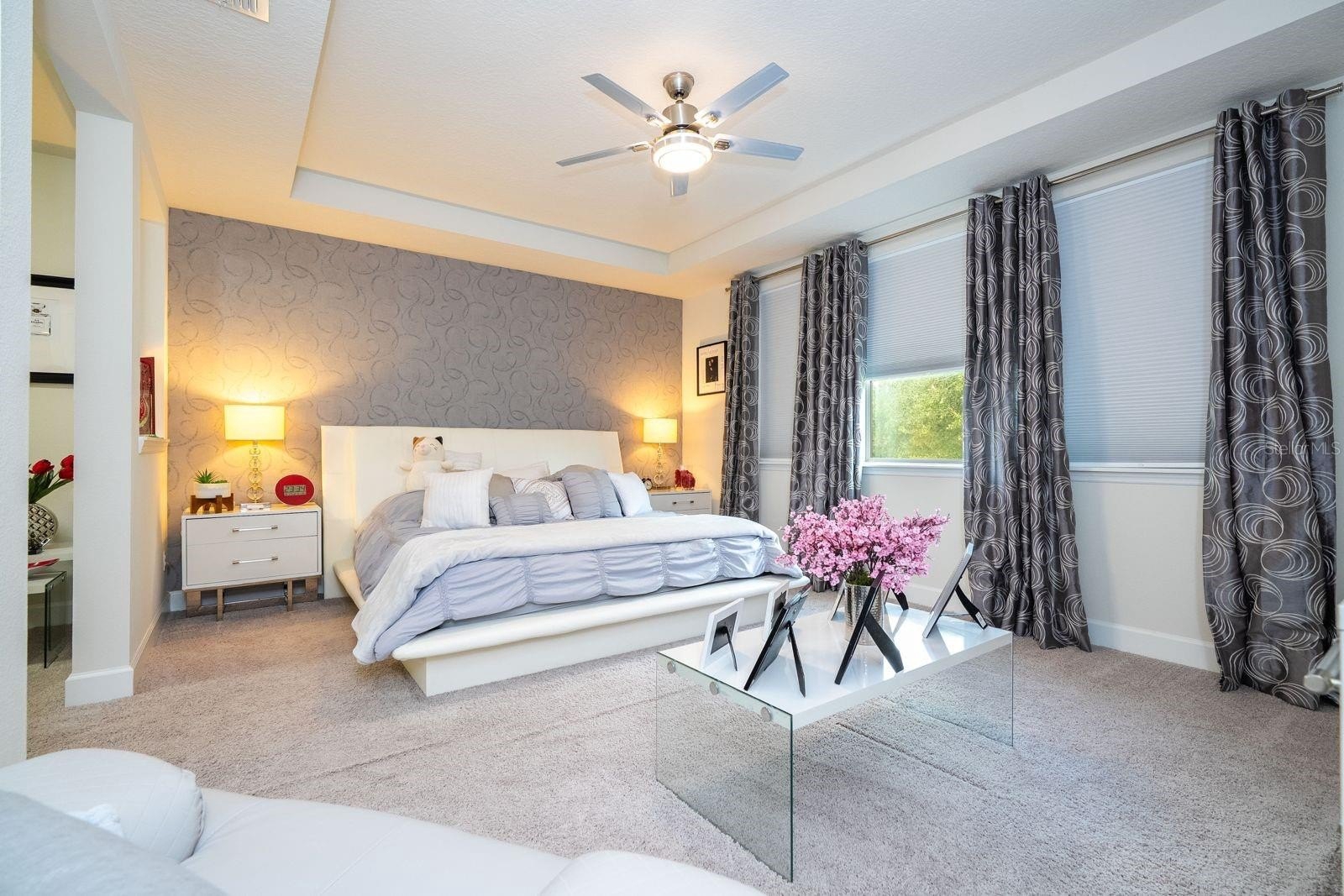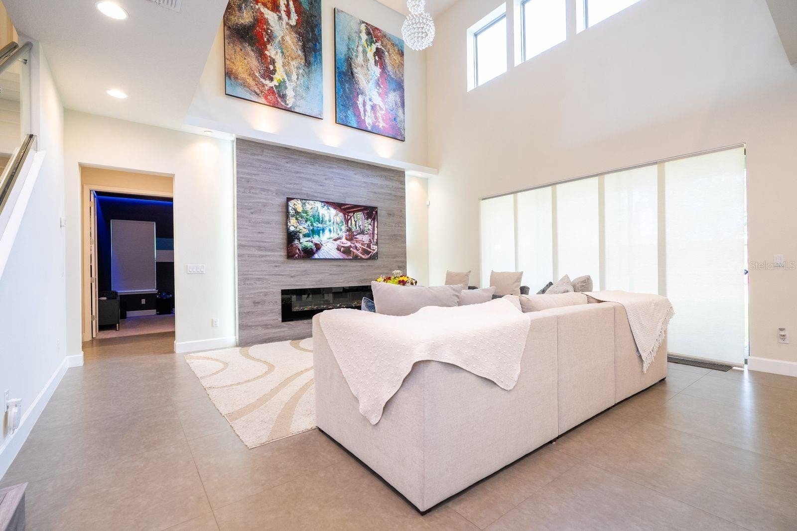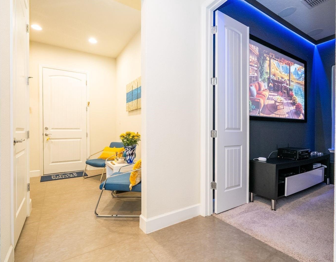 The home offers a thoughtfully designed floor plan, with the primary suite and three additional bedrooms located on the upper level, as well as a private movie theater complete with a 95-inch screen and projector. A full bathroom is conveniently located on the main floor for guests. Elegant glass stair rails, 8-foot interior doors, custom window treatments, a show-stopping dining room chandelier, and personalized his-and-her closets add to the home’s distinct sense of luxury. Step outside to a spacious backyard with a covered lanai, a separate entry to the pool bath, and space designed for both relaxation and entertaining. The oversized tandem three-car garage provides ample room for vehicles and storage.