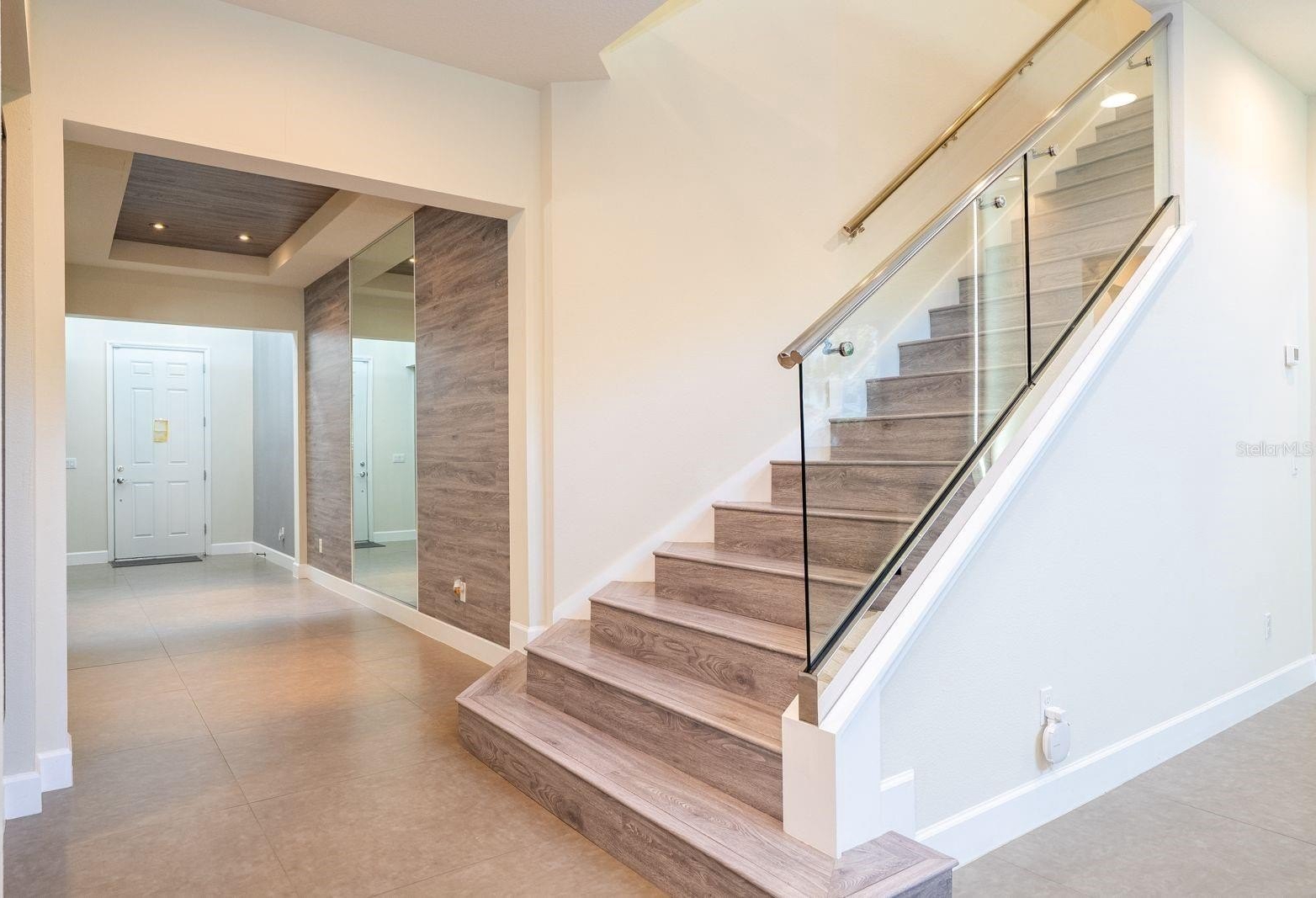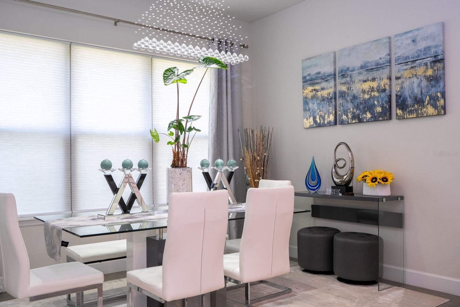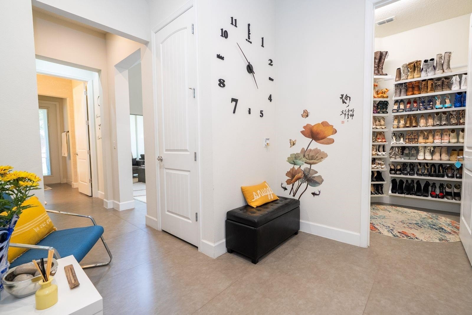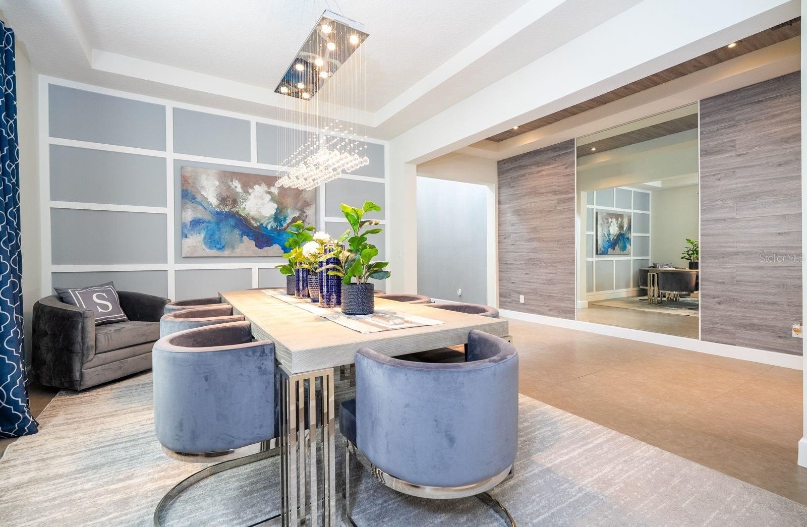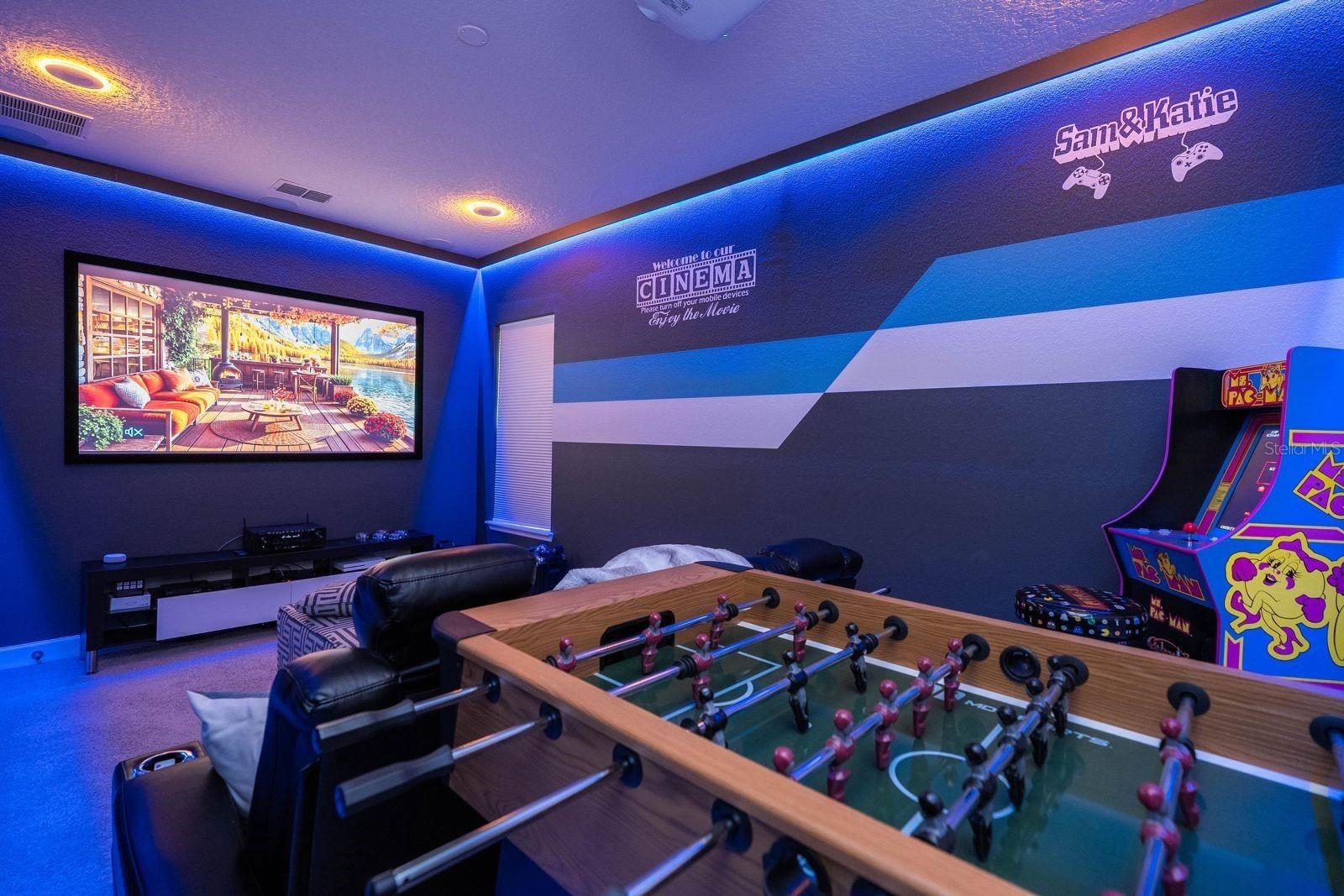 The home offers a thoughtfully designed floor plan, with the primary suite and three additional bedrooms located on the upper level, as well as a private movie theater complete with a 95-inch screen and projector. A full bathroom is conveniently located on the main floor for guests. Elegant glass stair rails, 8-foot interior doors, custom window treatments, a show-stopping dining room chandelier, and personalized his-and-her closets add to the home’s distinct sense of luxury. Step outside to a spacious backyard with a covered lanai, a separate entry to the pool bath, and space designed for both relaxation and entertaining. The oversized tandem three-car garage provides ample room for vehicles and storage.
