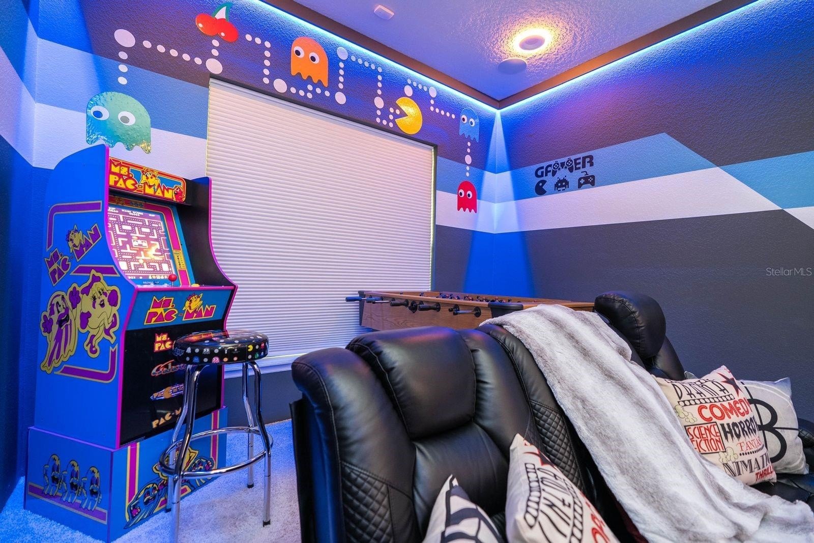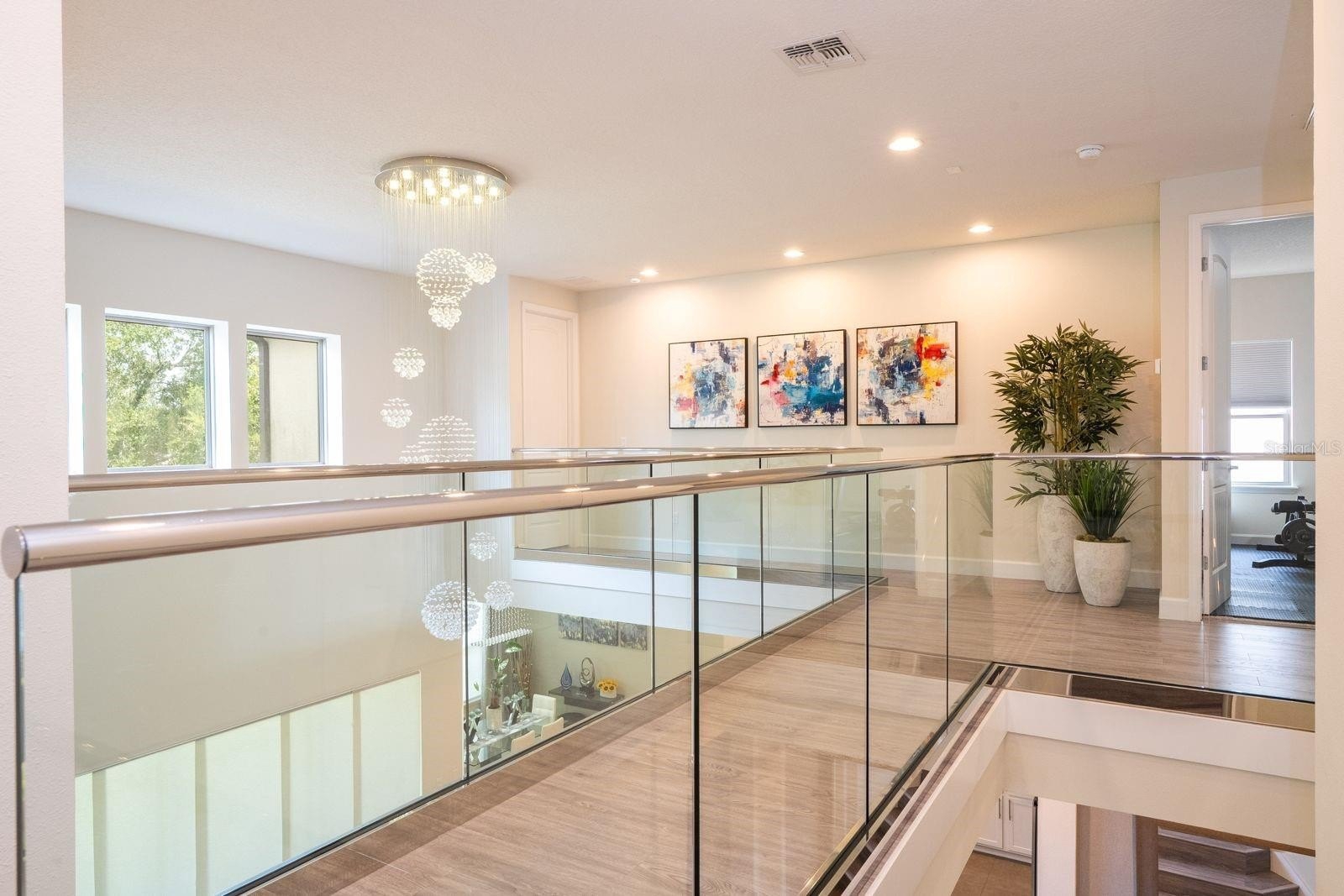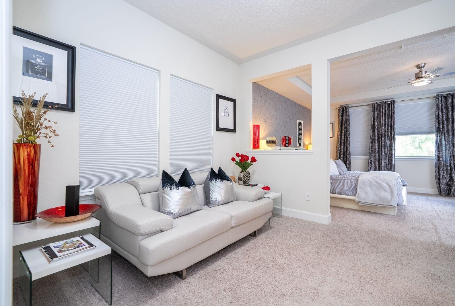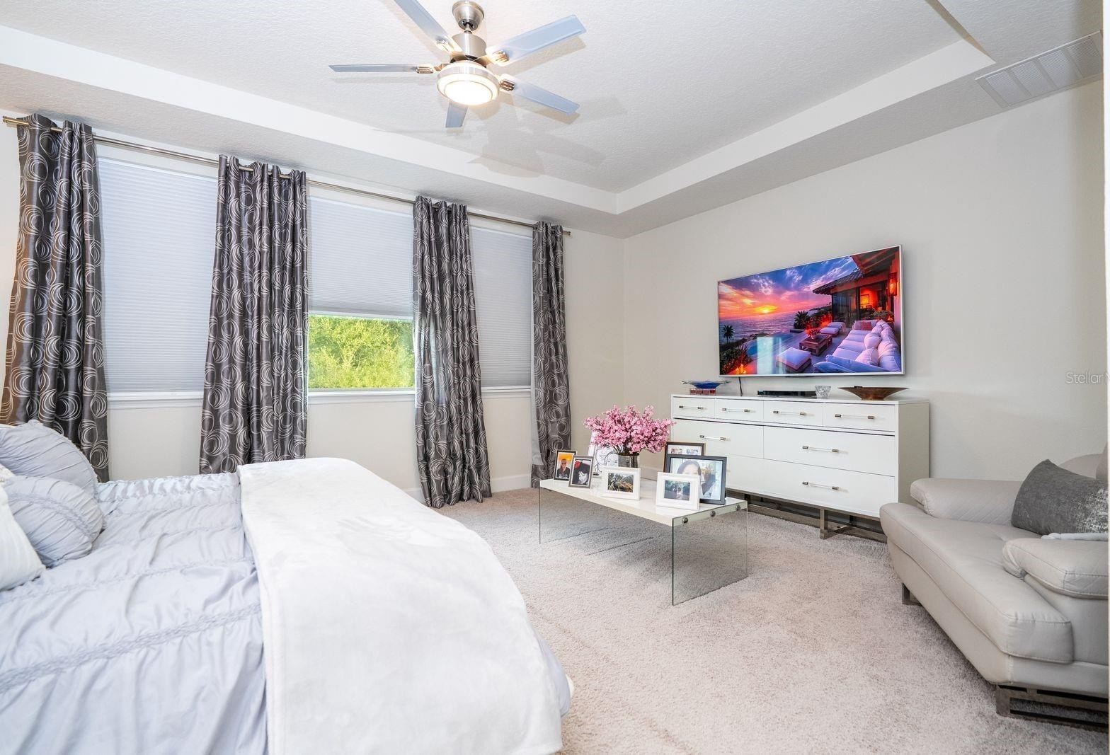 The home offers a thoughtfully designed floor plan, with the primary suite and three additional bedrooms located on the upper level, as well as a private movie theater complete with a 95-inch screen and projector. A full bathroom is conveniently located on the main floor for guests. Elegant glass stair rails, 8-foot interior doors, custom window treatments, a show-stopping dining room chandelier, and personalized his-and-her closets add to the home’s distinct sense of luxury. Step outside to a spacious backyard with a covered lanai, a separate entry to the pool bath, and space designed for both relaxation and entertaining. The oversized tandem three-car garage provides ample room for vehicles and storage.