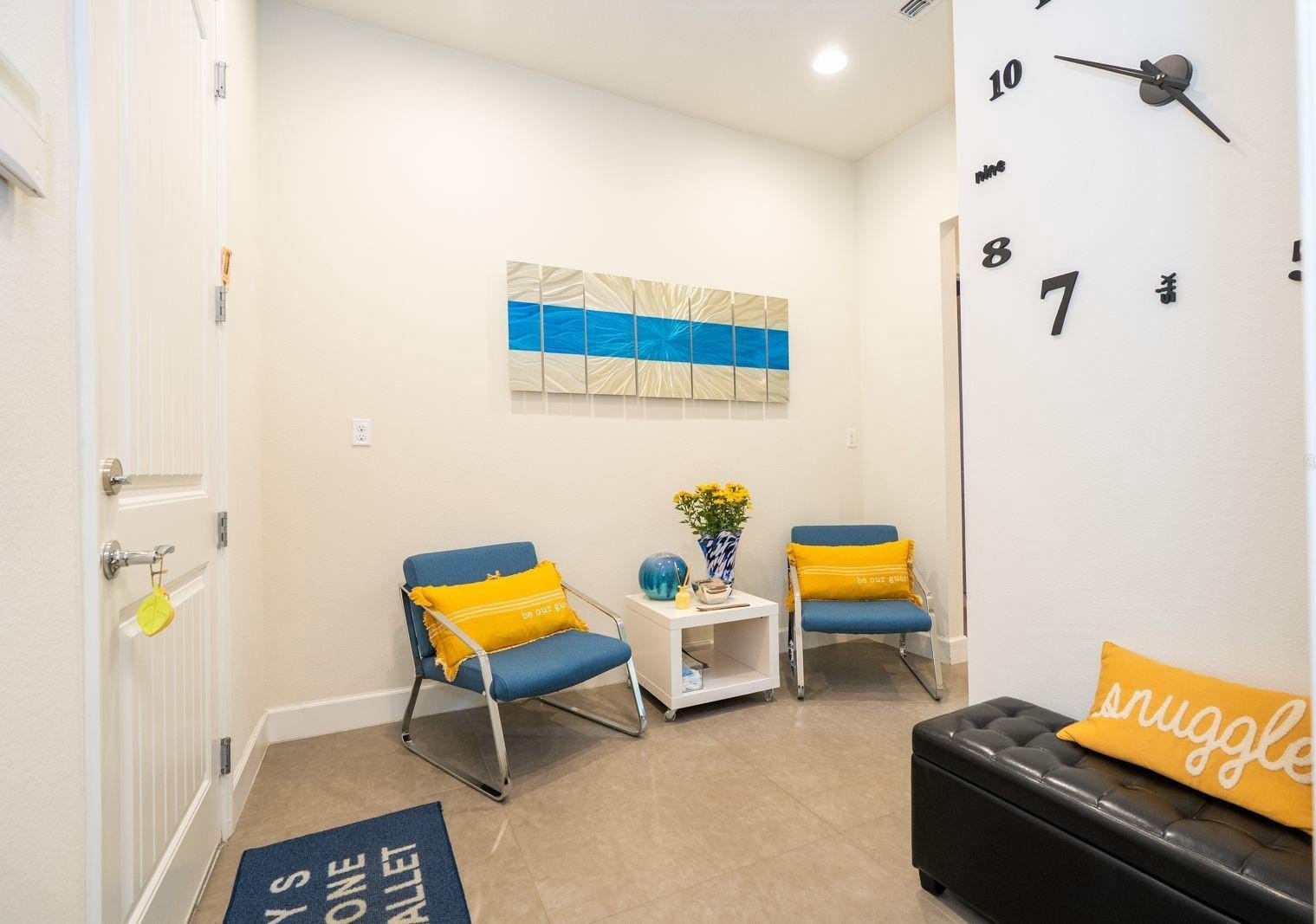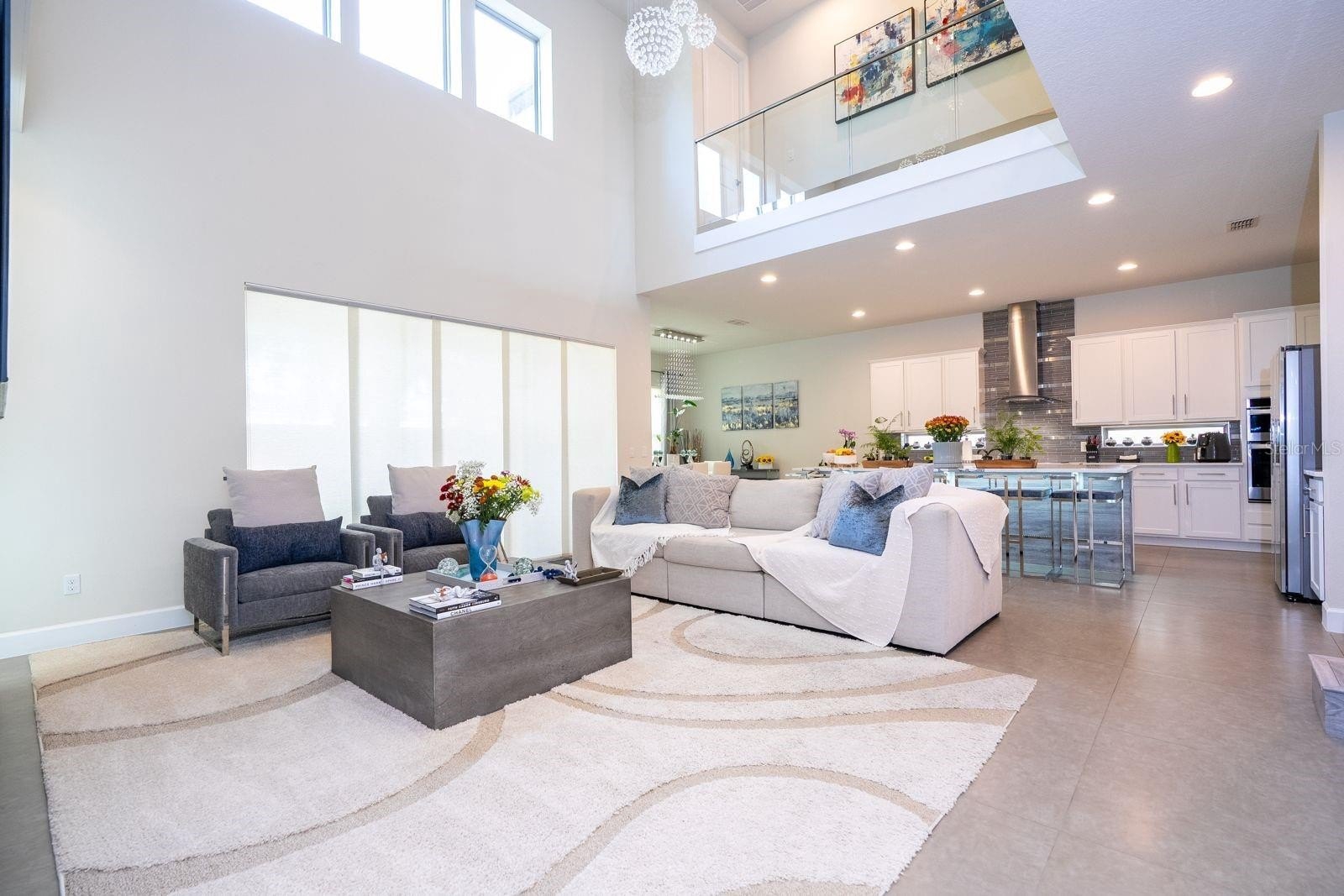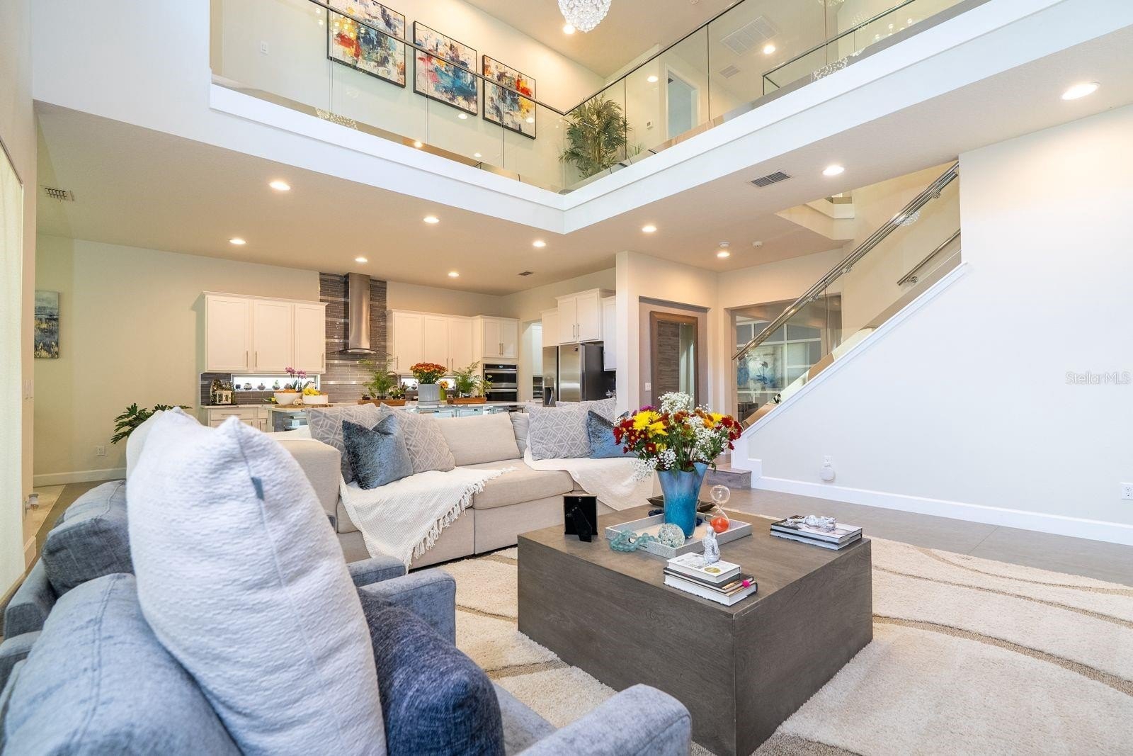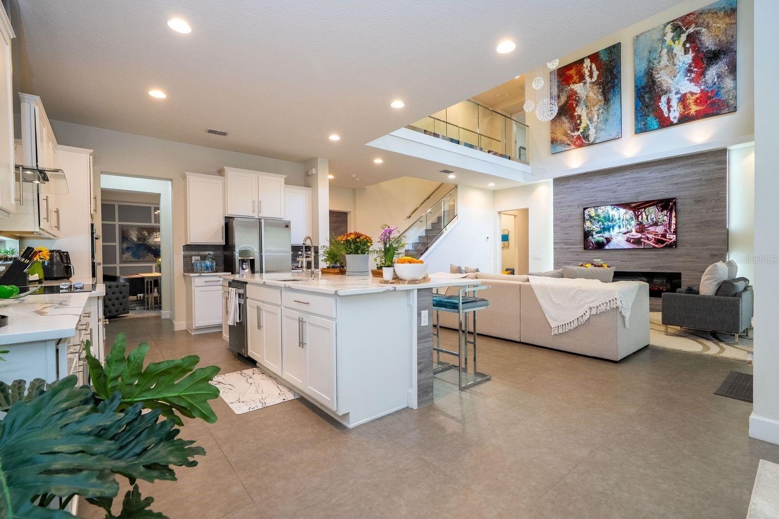 This luxurious two-story residence, built in 2018 by Pulte Homes, exemplifies refined elegance, superior craftsmanship, and an array of high-end upgrades throughout. The grand foyer & family room open to an impressive 20-foot ceiling adorned with a stunning designer chandelier, setting the tone for the home’s elegance. The main living areas feature custom 32x32 porcelain tile, while the gourmet kitchen showcases Calacatta quartz countertops, premium finishes, and a seamless open-concept design ideal for entertaining.