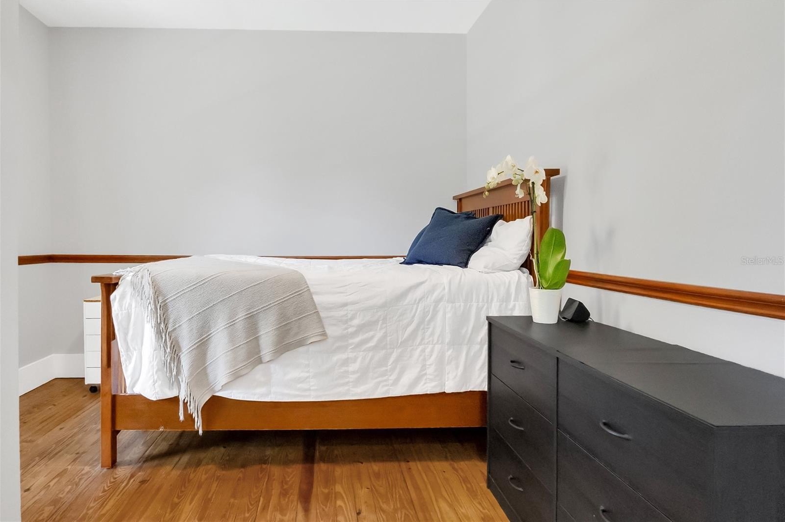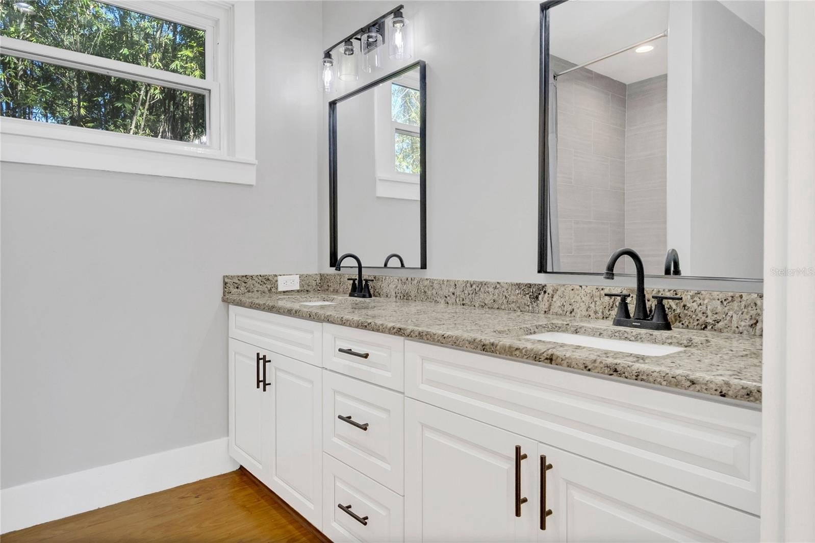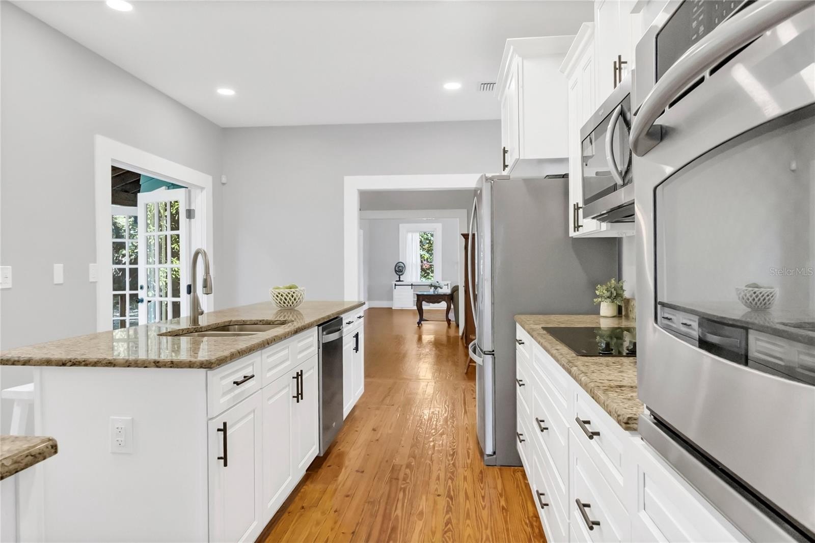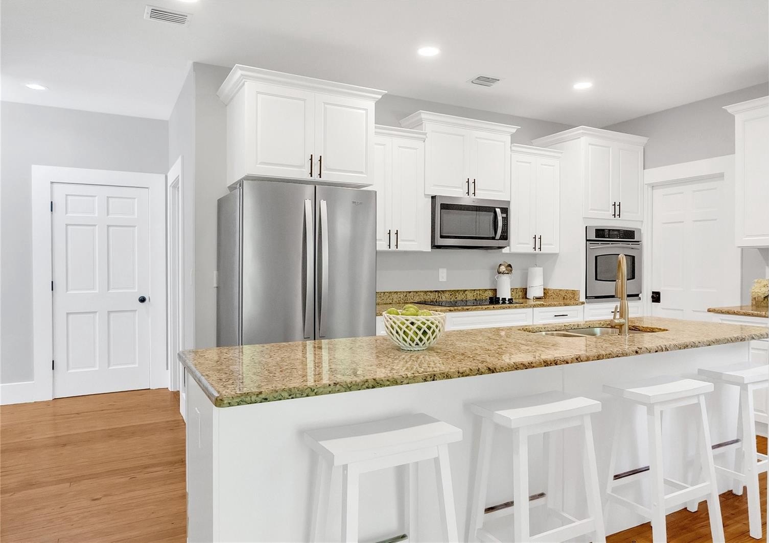 The island kitchen features granite countertops and generous workspace for cooking and entertaining. The first floor includes a full bedroom and bath, perfect for guests or a home office.
