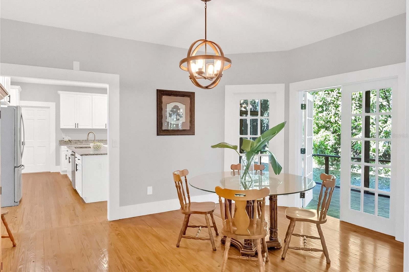 French doors open to a large screened porch — an ideal spot for morning coffee, outdoor dining, or unwinding beneath the shade of mature trees.