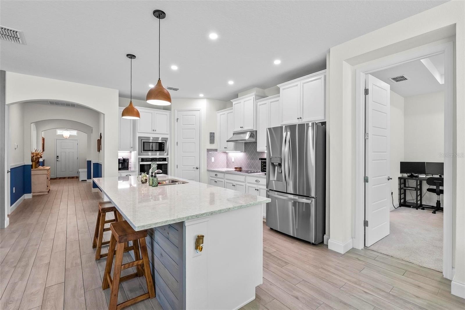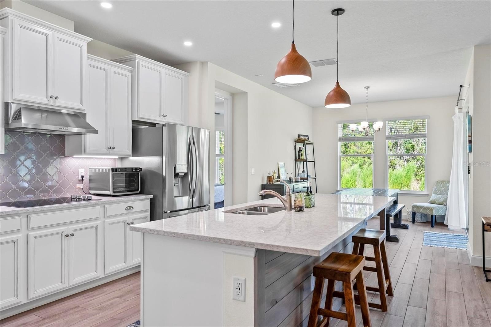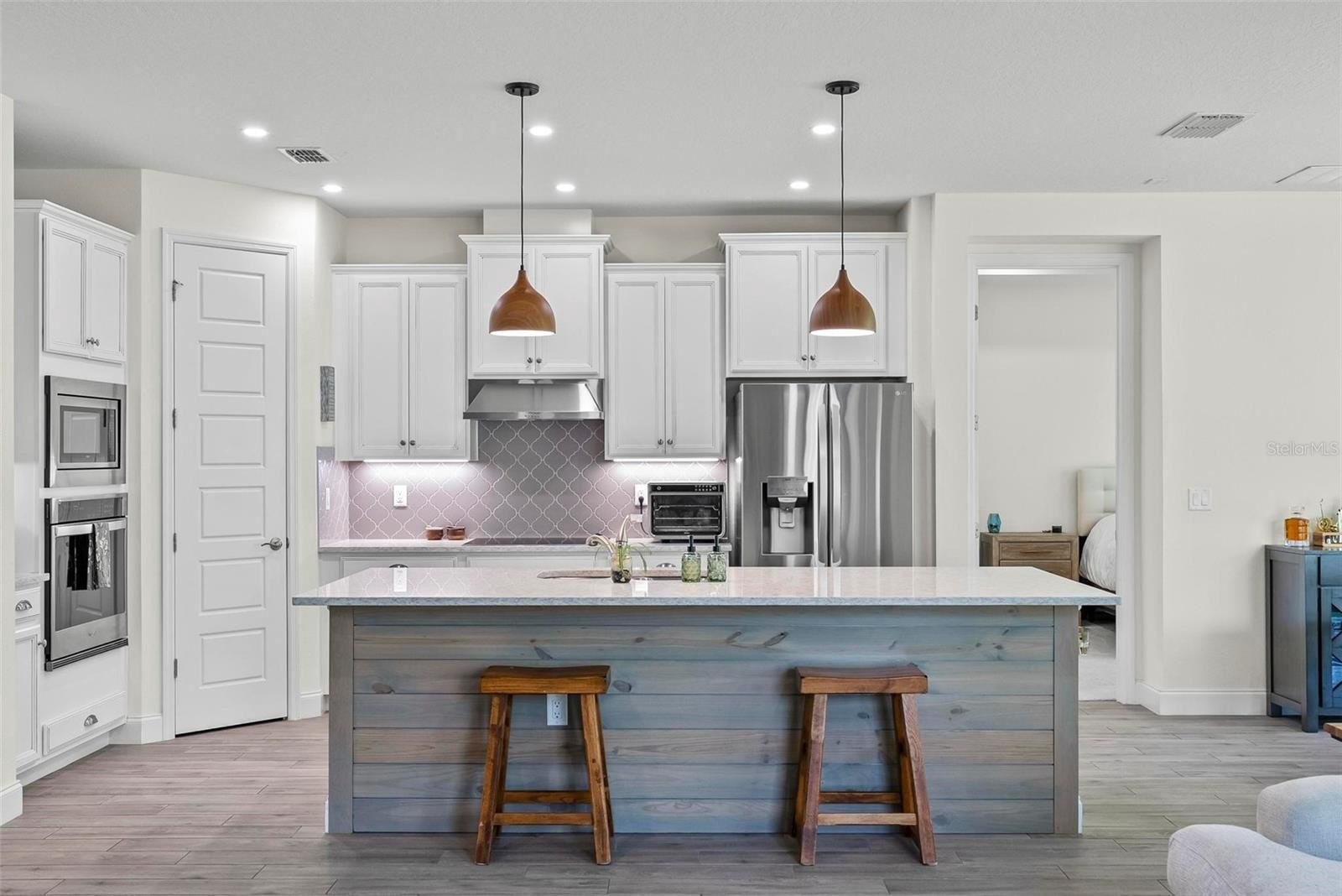 Step inside to discover tile flooring, 9-foot ceilings, recessed LED lighting, and a bright, open-concept design perfect for entertaining. The gourmet kitchen features quartz countertops, wood cabinetry, stainless steel appliances, tile backsplash, and a large island with seating—ideal for gatherings with family and friends.