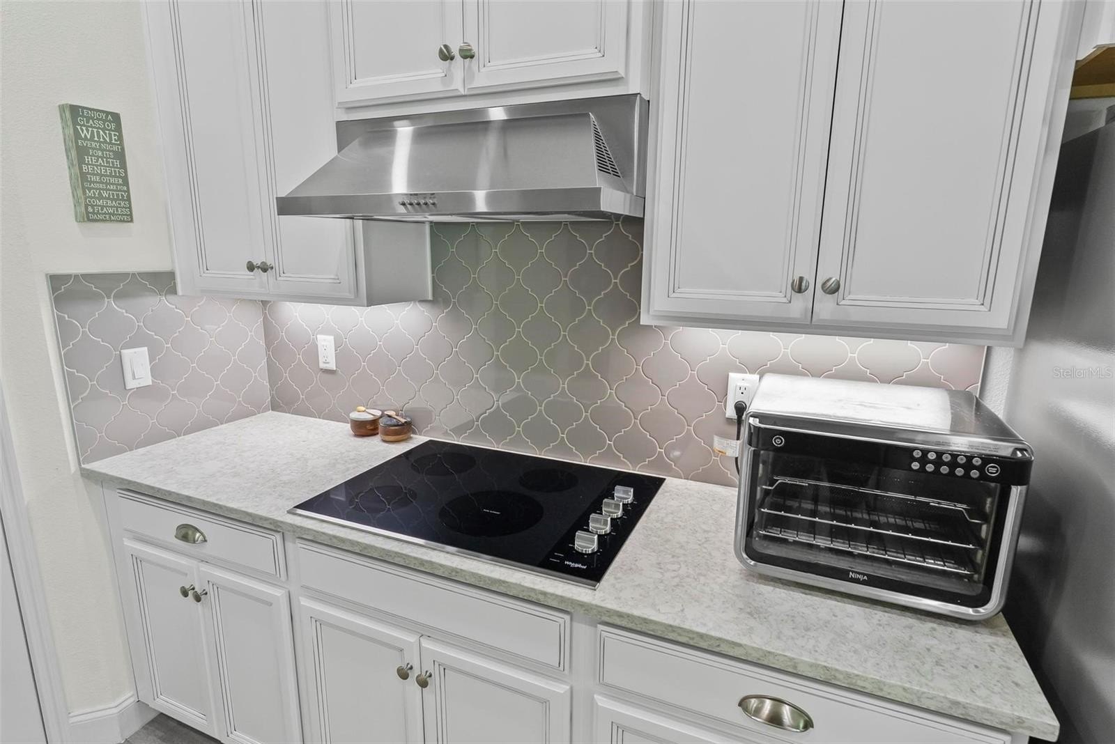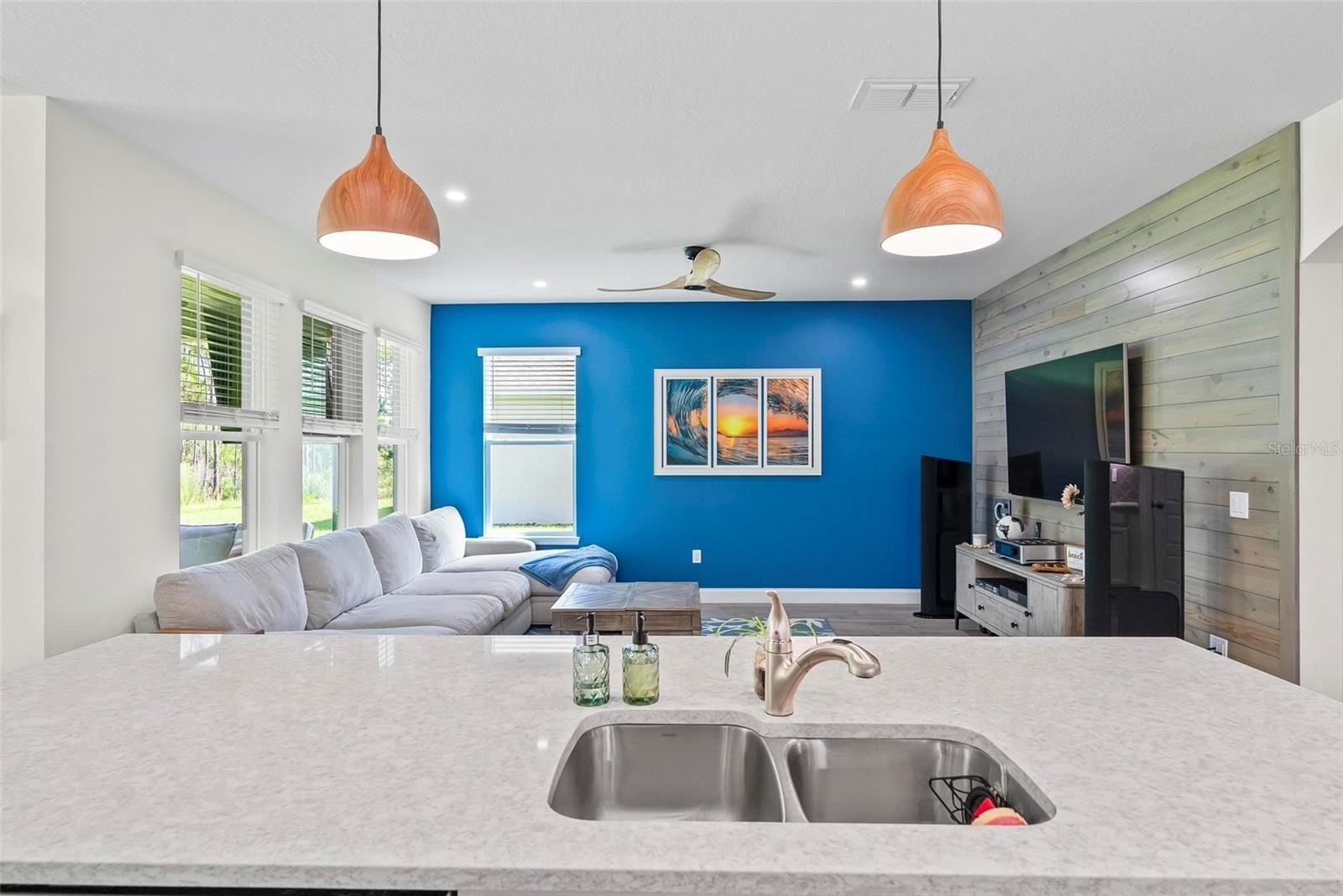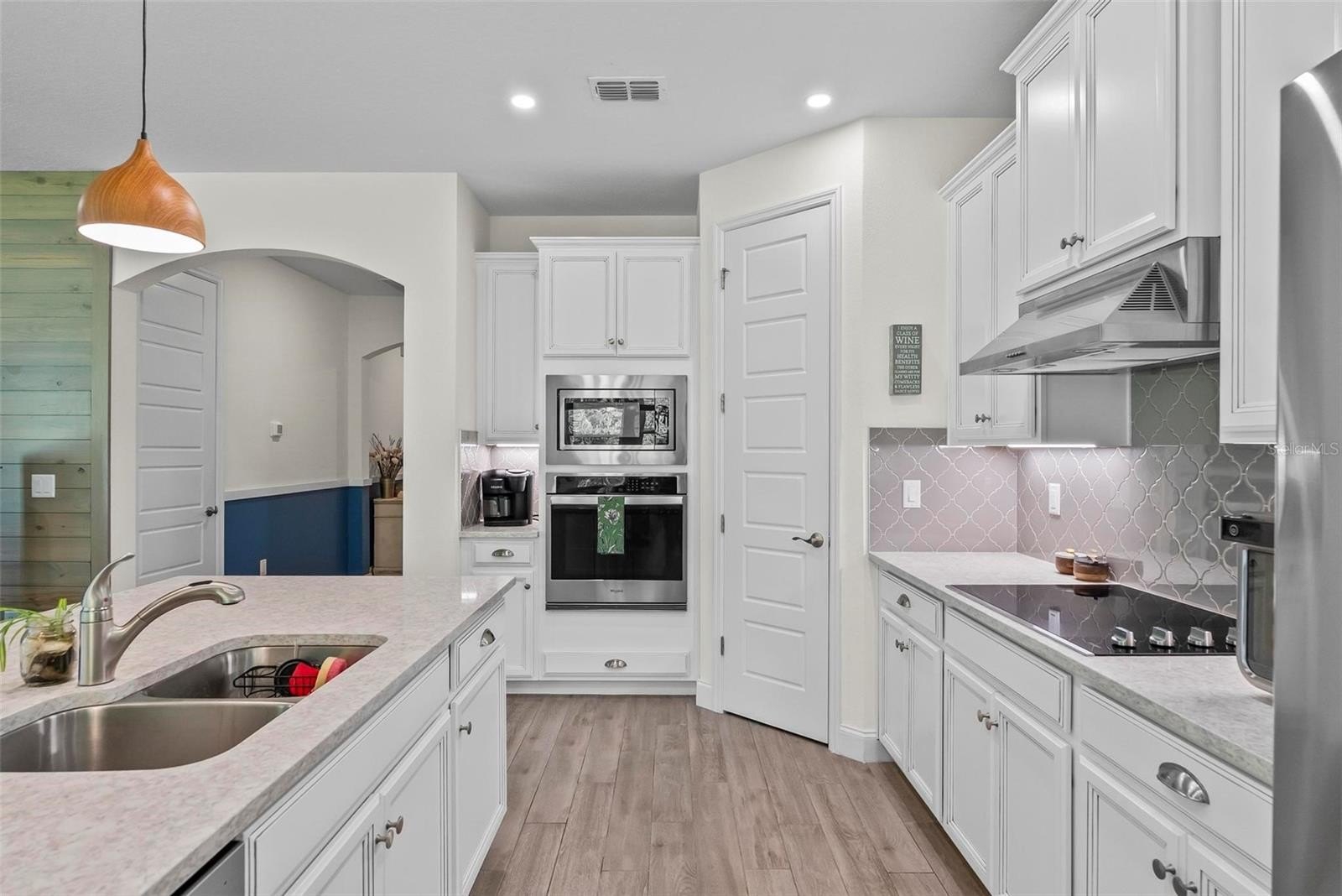 Step inside to discover tile flooring, 9-foot ceilings, recessed LED lighting, and a bright, open-concept design perfect for entertaining. The gourmet kitchen features quartz countertops, wood cabinetry, stainless steel appliances, tile backsplash, and a large island with seating—ideal for gatherings with family and friends.