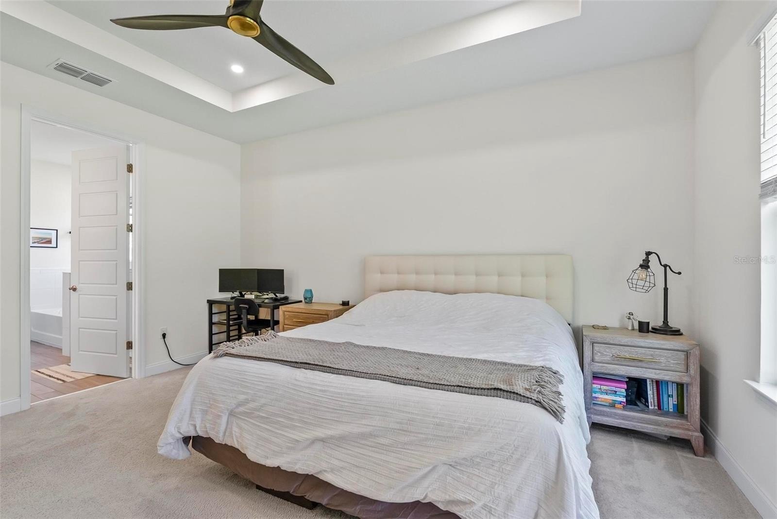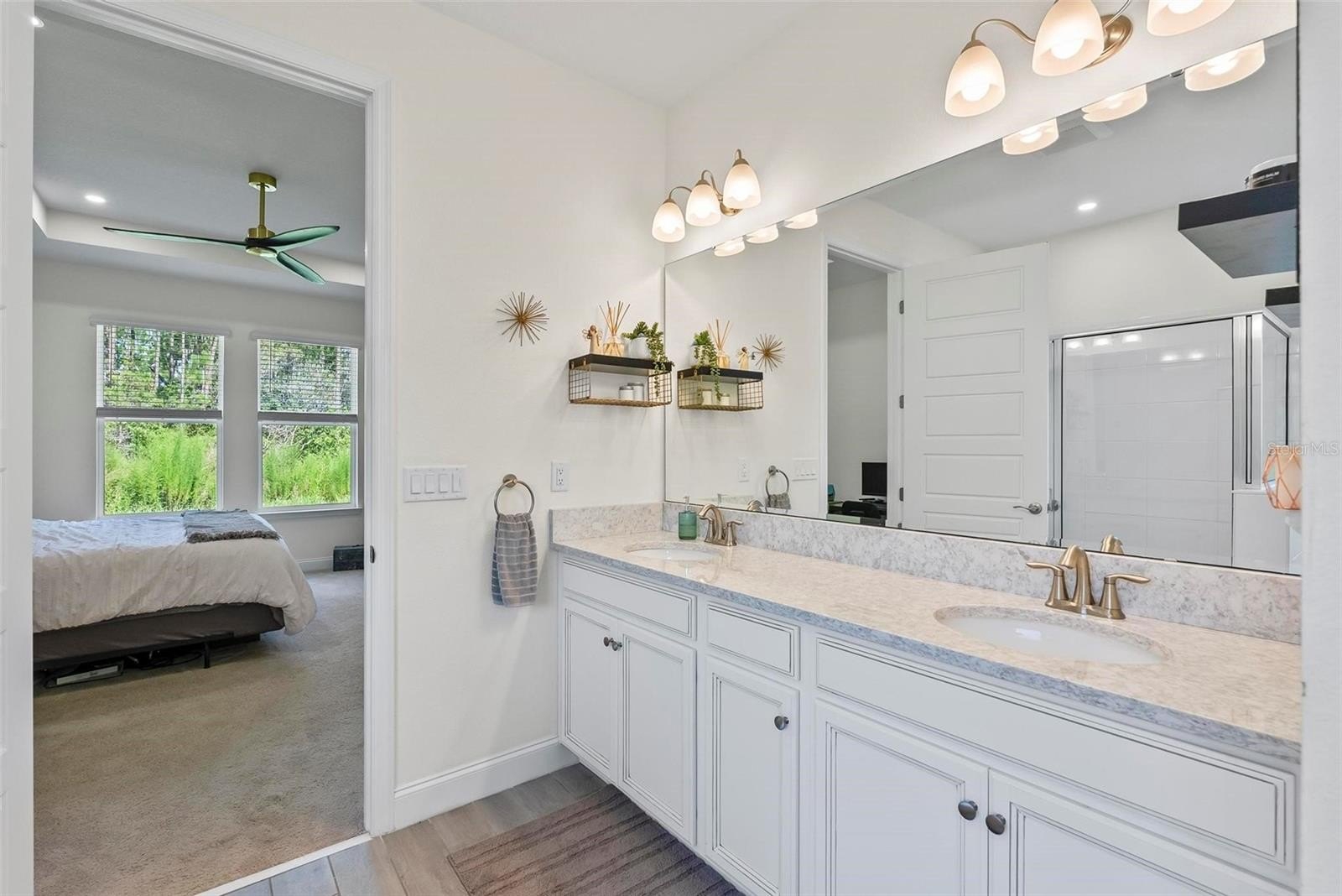 The spacious primary suite overlooks the private preserve and includes a tray ceiling, oversized walk-in closet, and spa-inspired bathroom with soaking tub, dual vanities, and glass-enclosed shower. Secondary bedrooms provide comfort and privacy for guests or family.