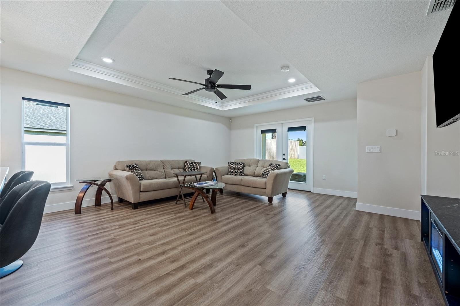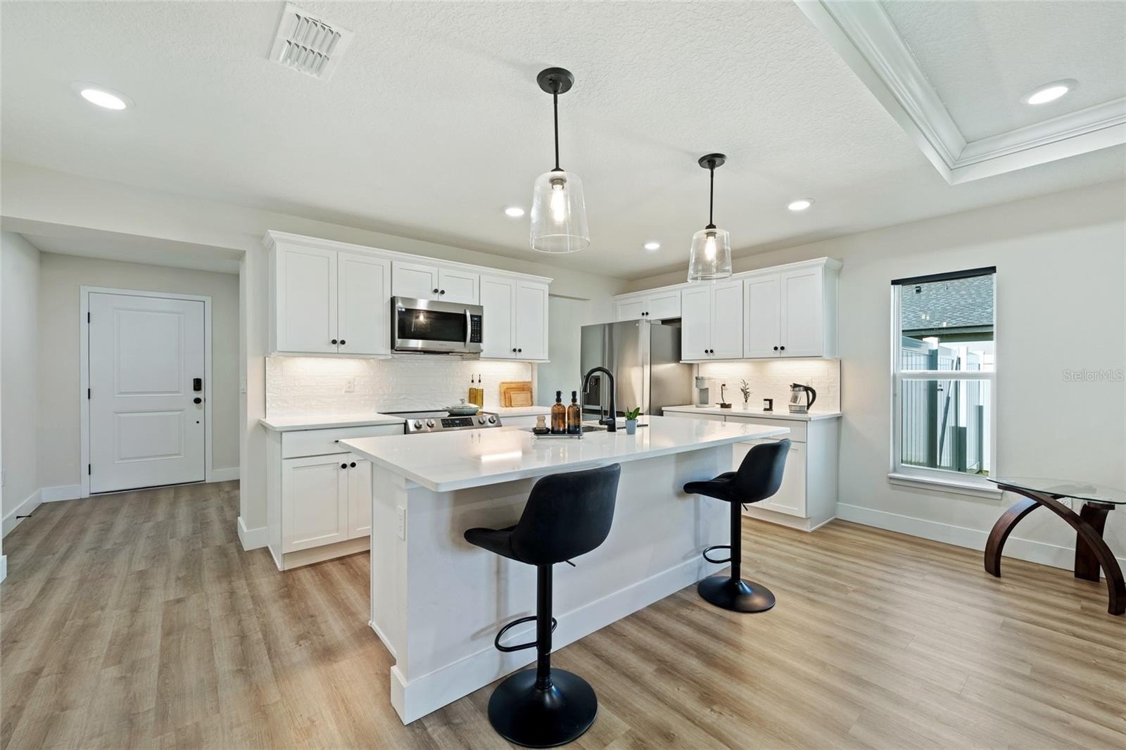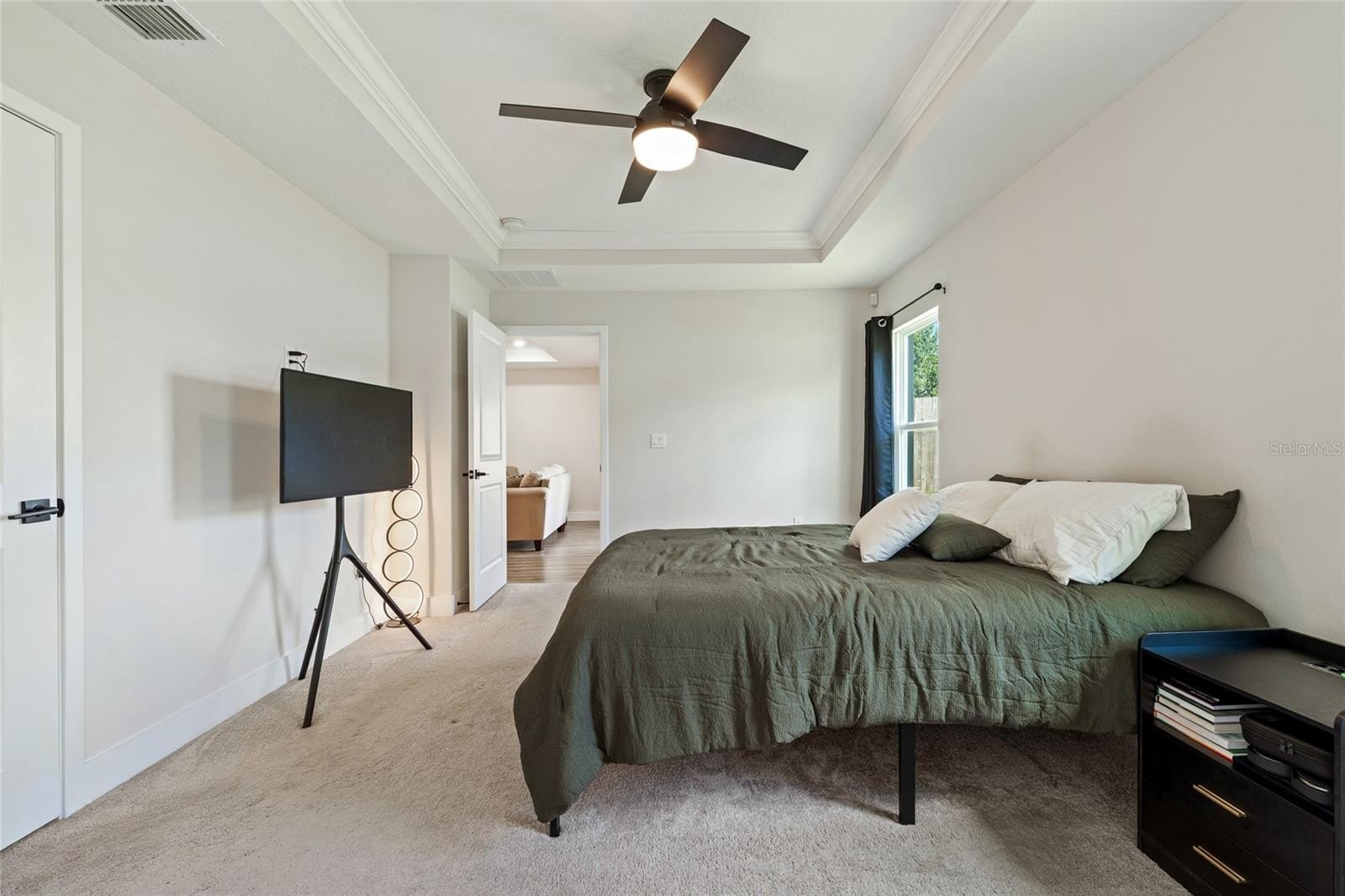 The sellers are offering an incredible incentive of $5,000 in seller concessions to help you cover closing costs or buy down your rate! Ready to move right into your perfect home? This stunning, 2023 build offers everything you've been looking for—and more! Located in Saxon Ridge, one of Deltona’s most desirable locations, you'll enjoy the rare benefit of NO HOA fees while living across the street from beautiful Lake Trout, offering tranquil lake views from your front yard! This 1,564 sqft, 3-bedroom, 2-bathroom home sits on a quarter-acre lot and is truly move-in ready. The current sellers have poured effort into fantastic upgrades, including: Cleared backyard with Vinyl Fencing installed in June 2025, improved landscaping(including a banana tree and pineapple plant) and an epoxied garage. This home blends modern design with thoughtful upgrades. Step inside to an open-concept layout featuring LPV flooring, tray ceilings with crown inlays, recessed lighting, and ceiling fans throughout. The kitchen impresses with an island, quartz countertops, custom finishes, stainless steel appliances, a French door, and plenty of natural light from double-pane windows. The primary suite is your private retreat—featuring his and hers vanity sinks, a walk-in shower, and elegant touches throughout. This home is just minutes to I-4, making your commute a breeze. You're conveniently located near several restaurants, hospitals, shopping, and more. For weekend fun, Daytona Beach is about 30 minutes away, and the magic of Disney is about 45 minutes away. Plus, the Saxon Ridge community park is just steps behind your backyard—perfect for an afternoon stroll or playtime! The sellers are leaving behind a heavy duty utility rack, Ryobi lawnmower, Ryobi leaf blower, and Ryobi weed wacker—so you can move right in and start enjoying your new home! With lake views, modern finishes, and $5,000 in seller concessions, this stunning home truly has it all. Don’t wait—homes like this in Saxon Ridge don’t last long!