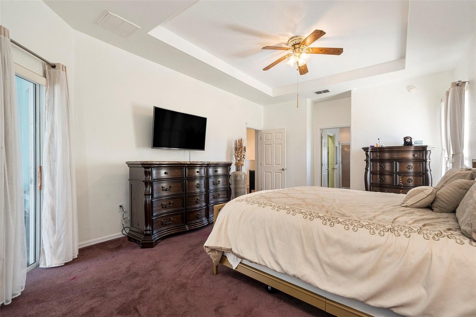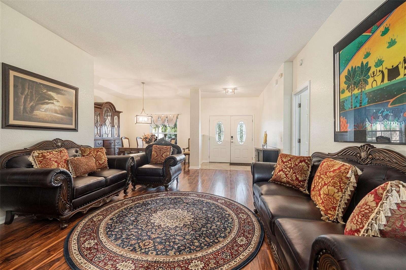 As you step through the grand double doors, you'll be welcomed by an elegant foyer that leads into the inviting living and dining spaces. The owner's suite, located to the left, offers direct pool access, expansive walk-in closet, and a spa-inspired en suite bathroom featuring a soaking tub, a luxurious walk-in shower, and fine finishes throughout.