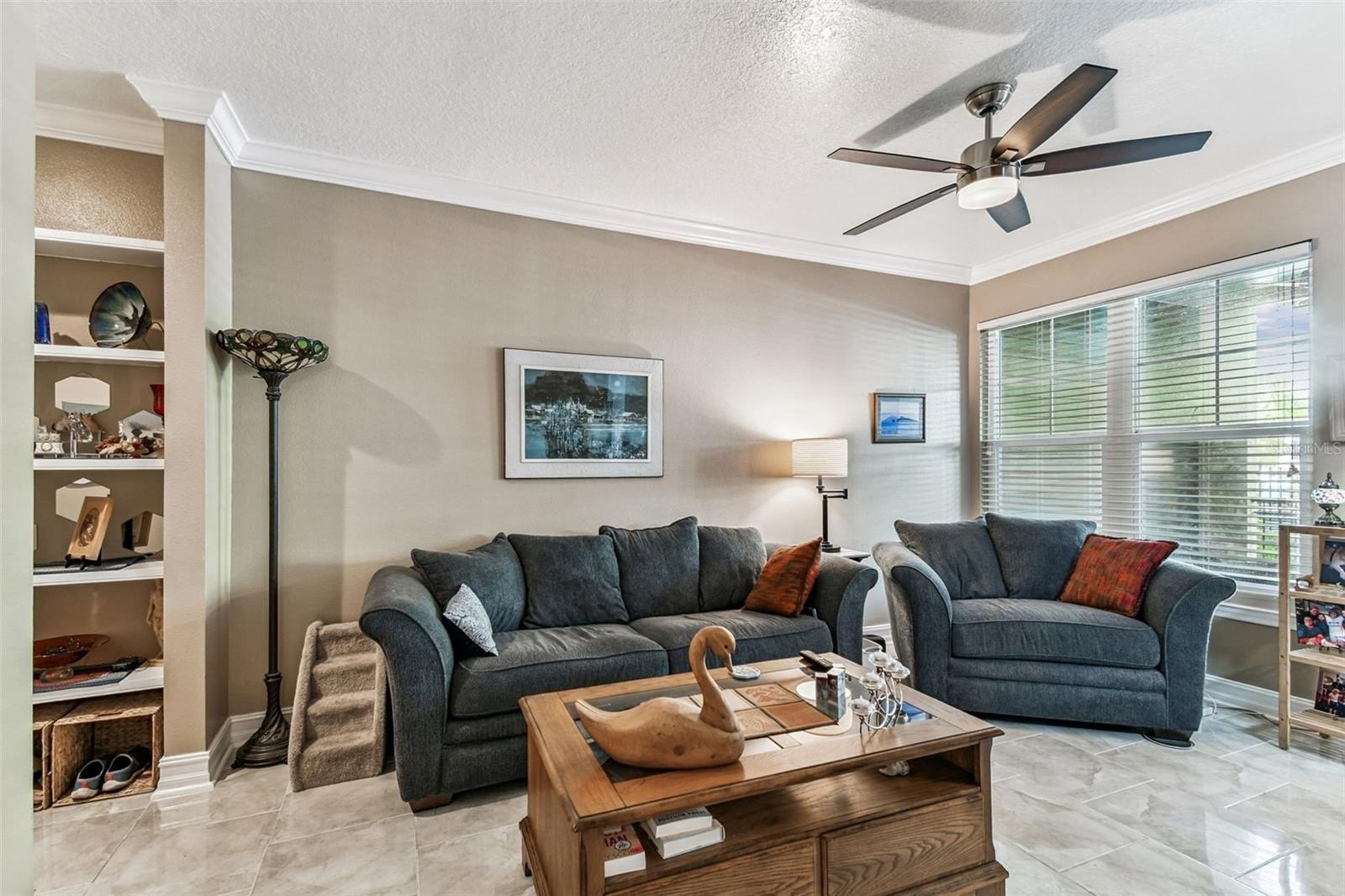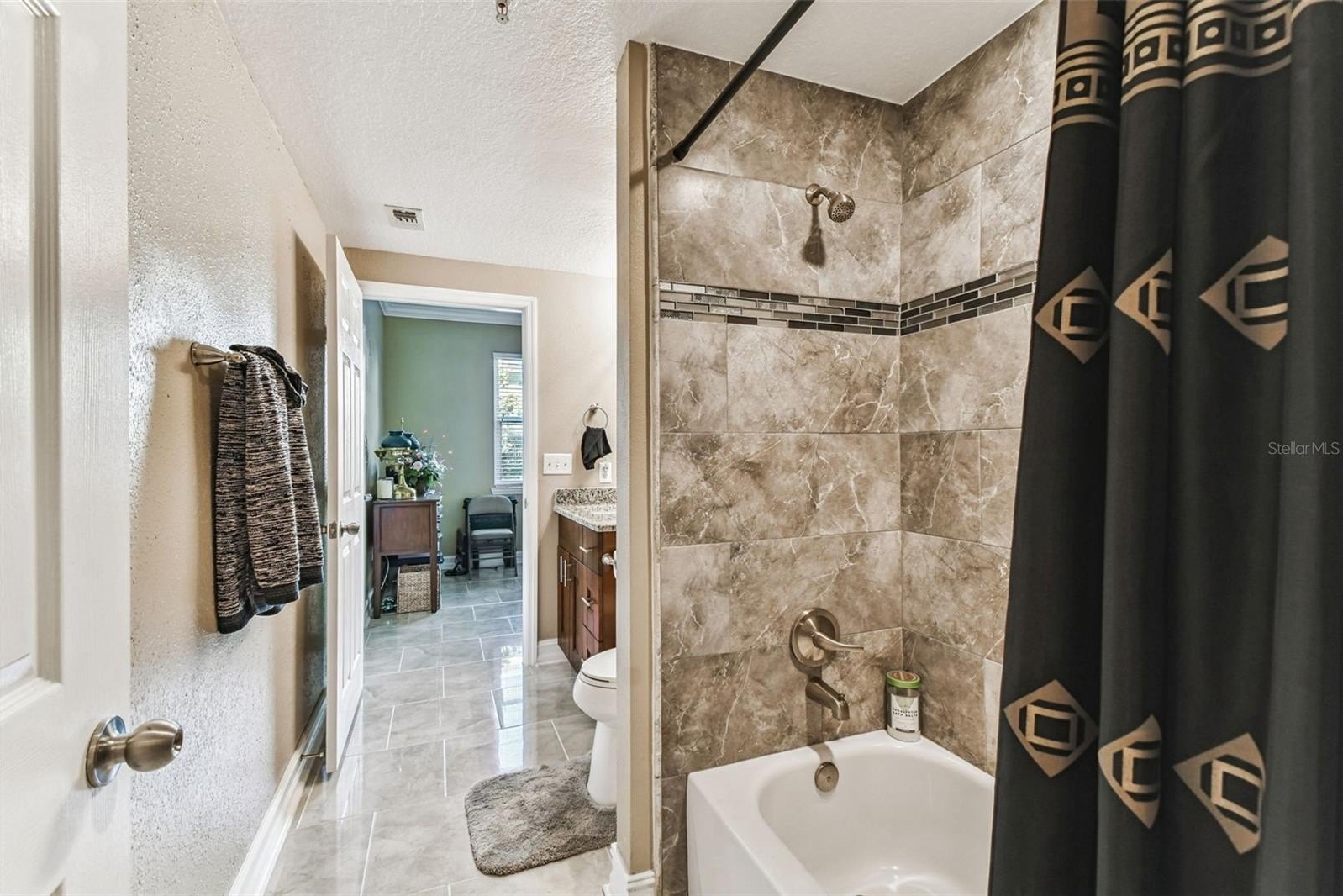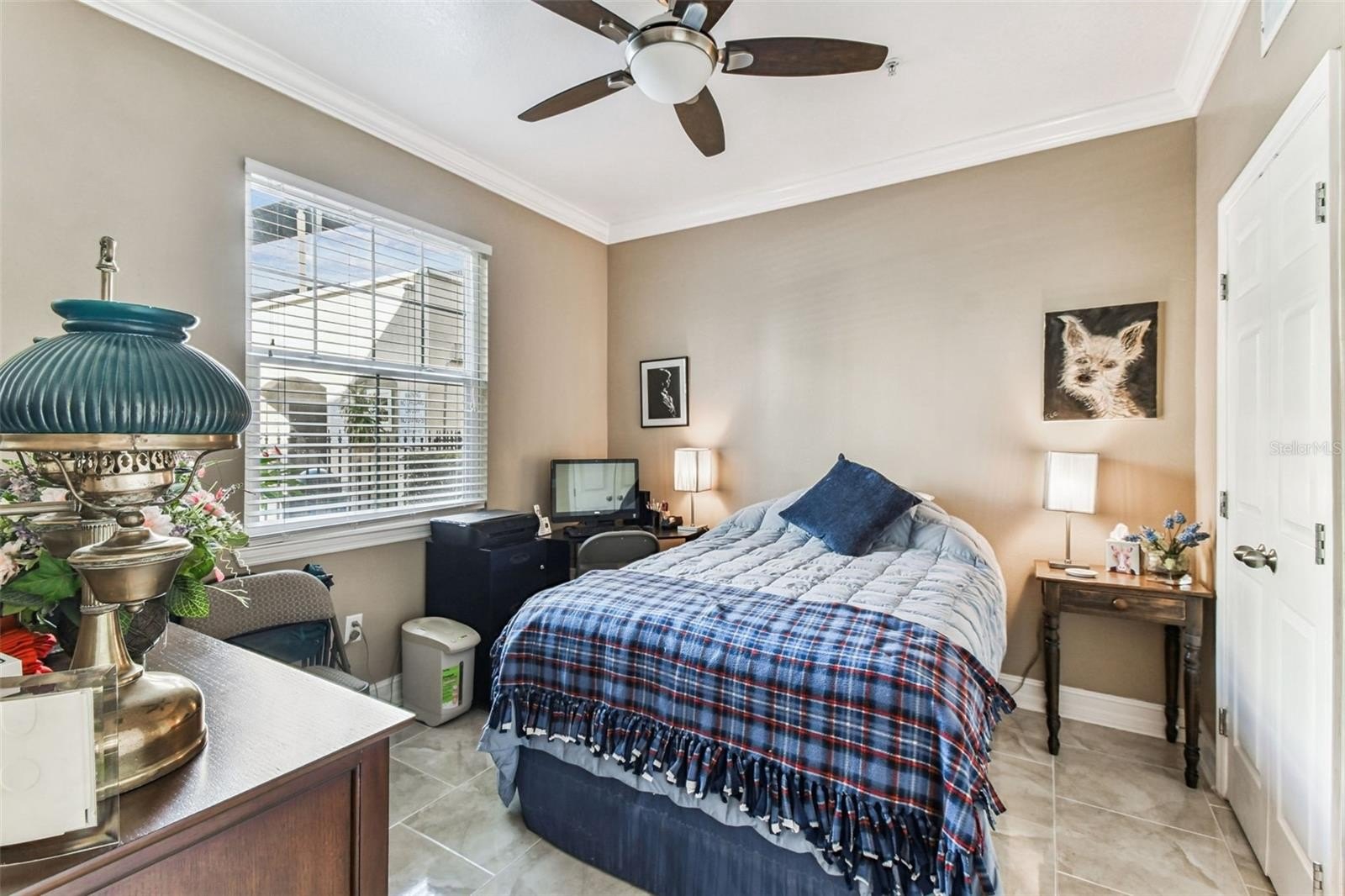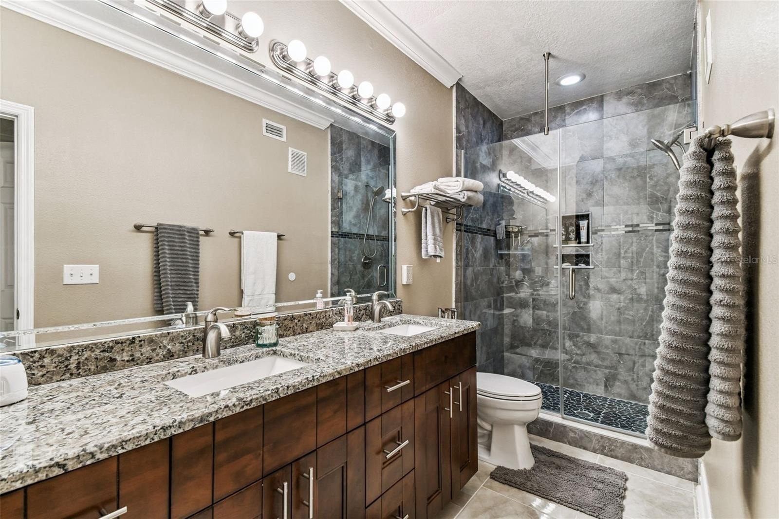 The PRIMARY SUITE includes a cozy sitting nook, a WALK-IN CLOSET WITH CUSTOM BUILT-INS, and a beautifully renovated EN-SUITE BATH featuring a GRANITE DOUBLE VANITY, FRAMELESS GLASS WALK-IN SHOWER, and FLOOR-TO-CEILING TILE with designer accents and niches. The 2ND BEDROOM also offers POOL VIEWS, a ceiling fan, and another CUSTOM WALK-IN CLOSET. The GUEST BATH mirrors the quality finishes of the rest of the home, with a GRANITE-TOPPED VANITY and a fully tiled TUB/SHOWER COMBO.