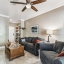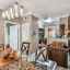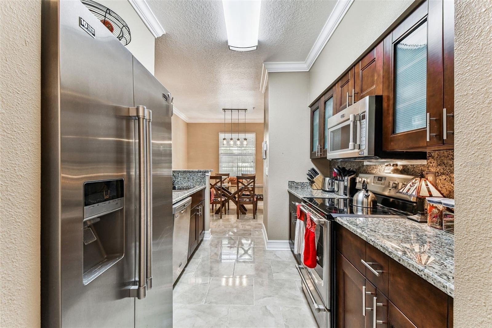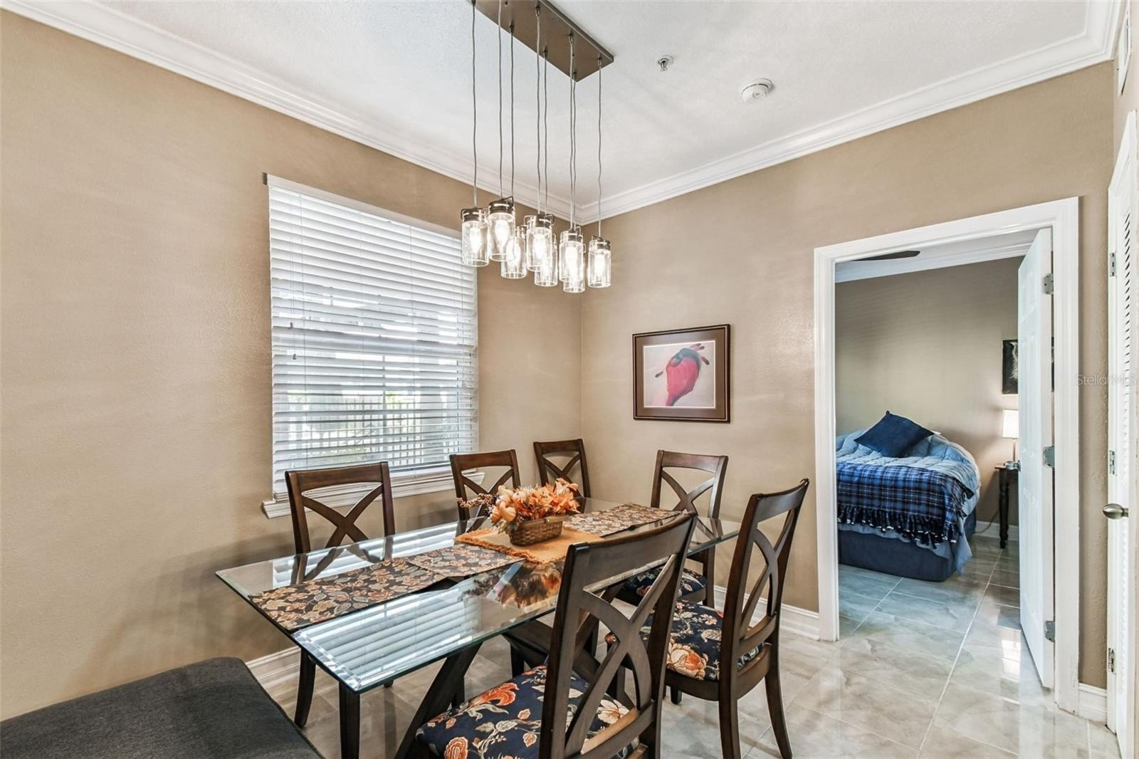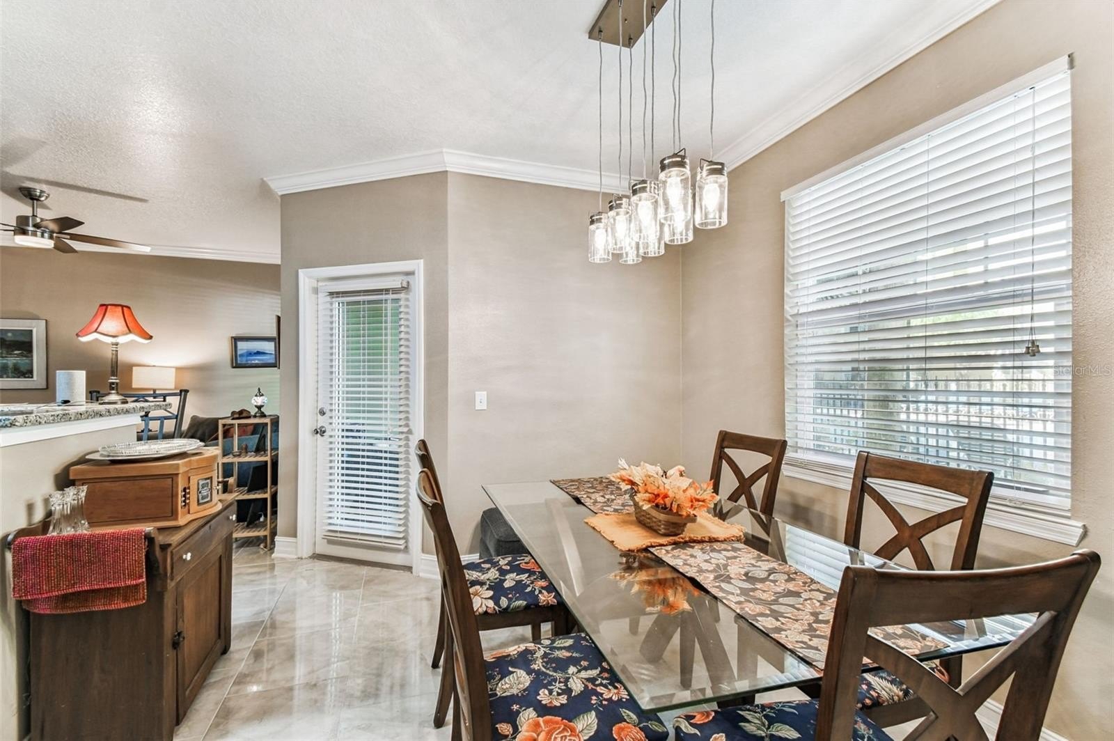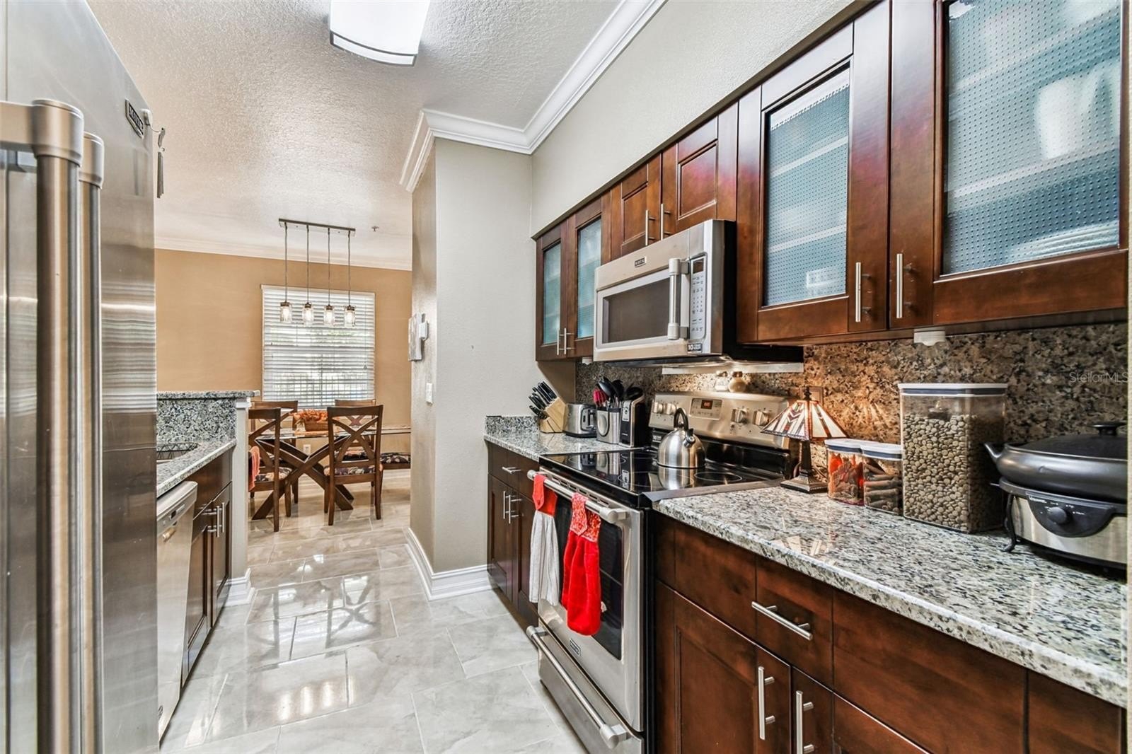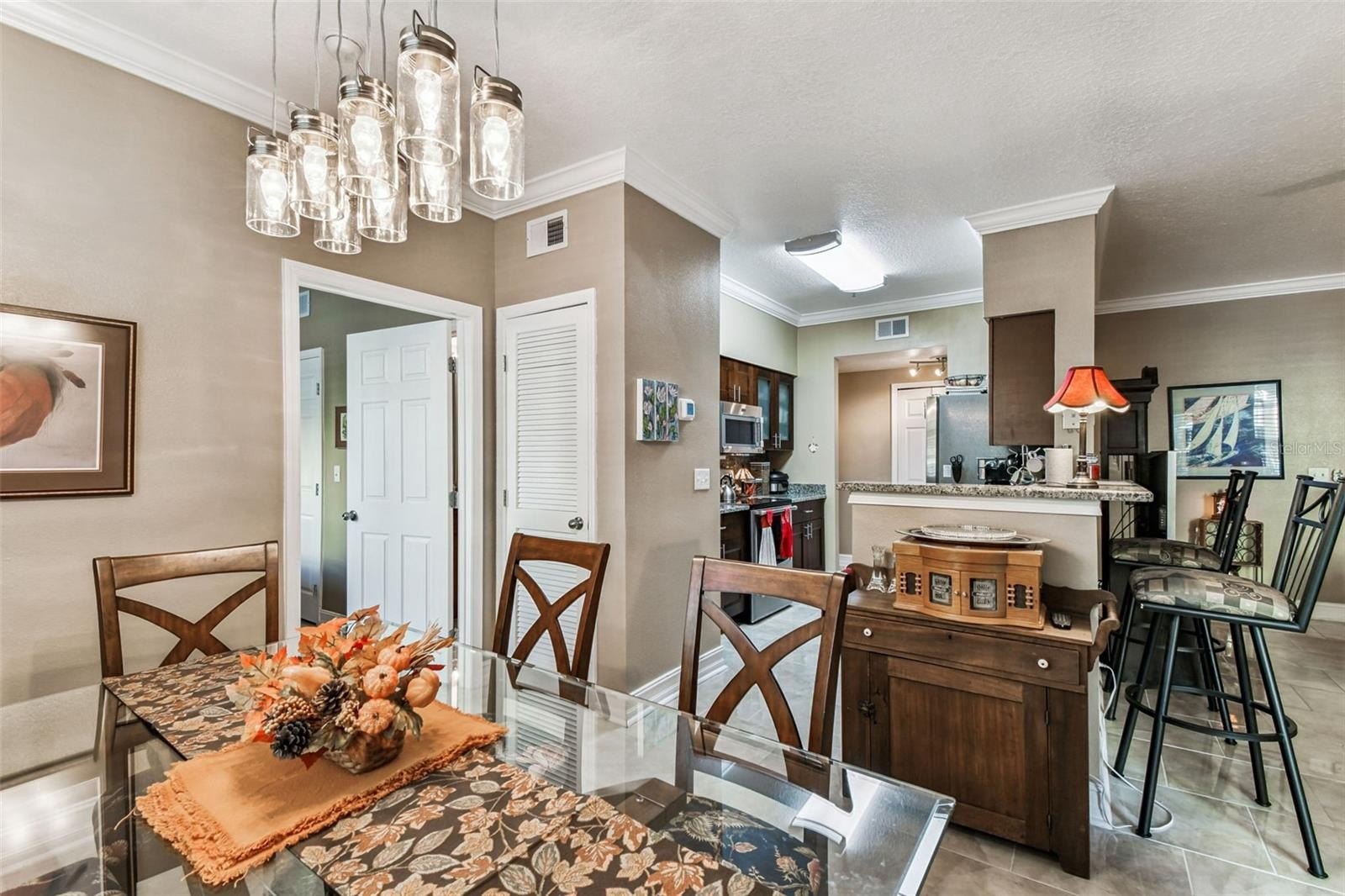 Inside, you’ll notice thoughtful upgrades throughout—CROWN MOLDING, STAGGERED TILE FLOORS throughout, TALL BASEBOARDS, and a warm neutral color palette. The entryway includes CUSTOM WOOD SHELVING, while the KITCHEN features ALL-WOOD CABINETRY with frosted glass accents, GRANITE COUNTERTOPS, STAINLESS STEEL APPLIANCES, UNDERMOUNT SINK, and a BREAKFAST BAR. Elegant GLASS PENDANT LIGHTING highlights the dining space, which gives direct access to the patio.