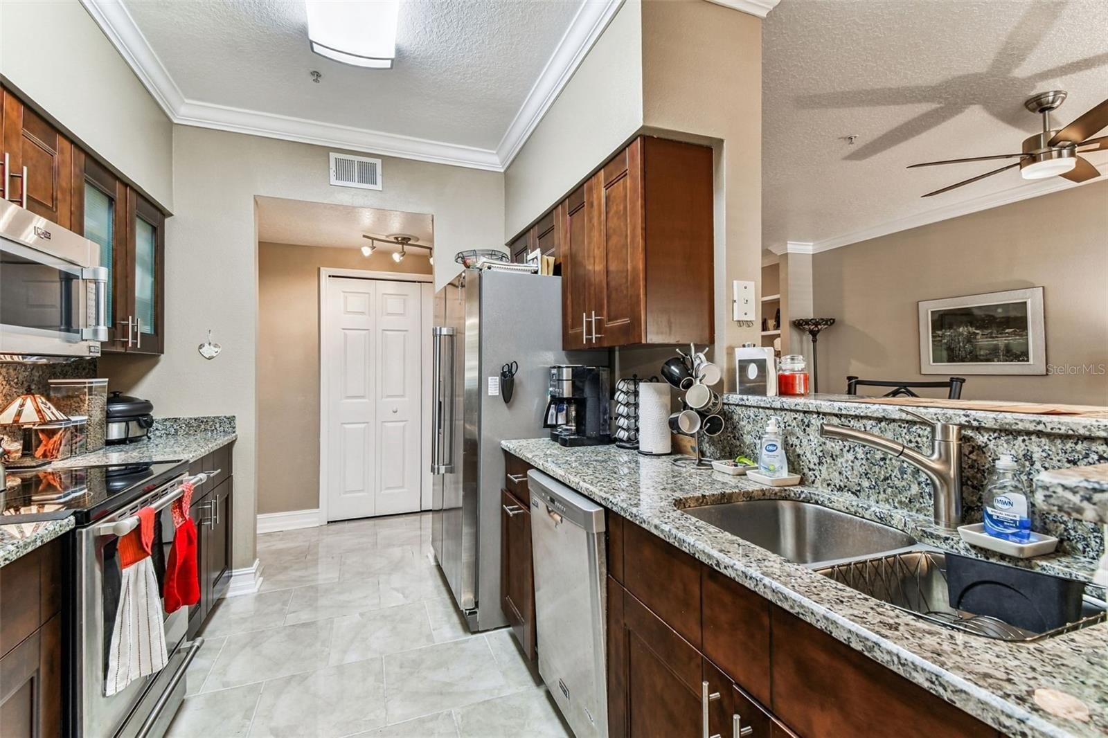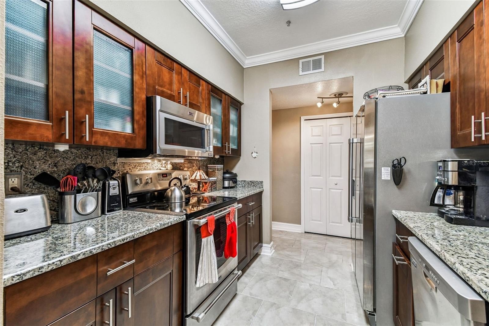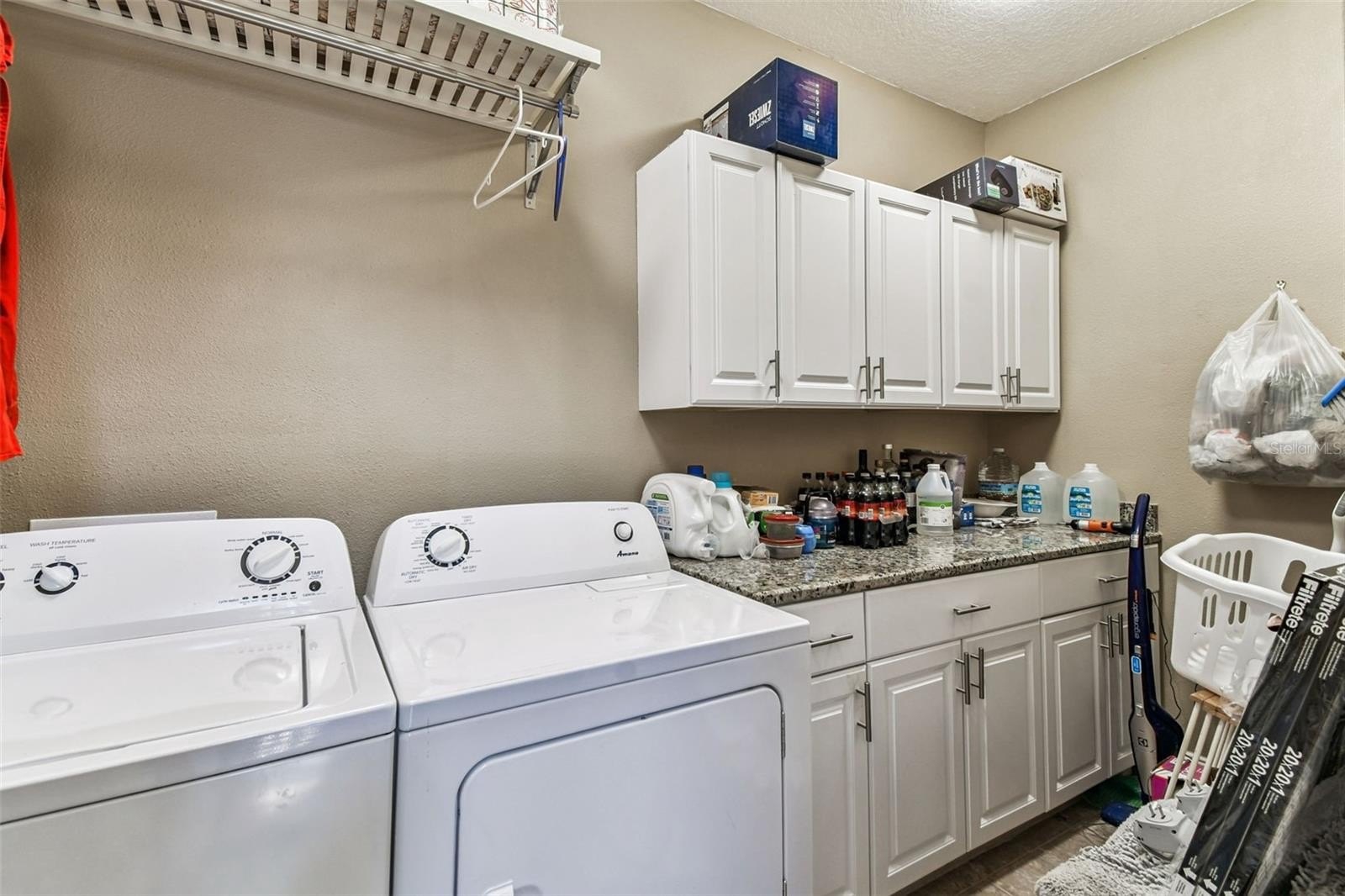 The LAUNDRY ROOM is impressively outfitted with upper and lower cabinetry, GRANITE COUNTERS, and a WASHER AND DRYER.