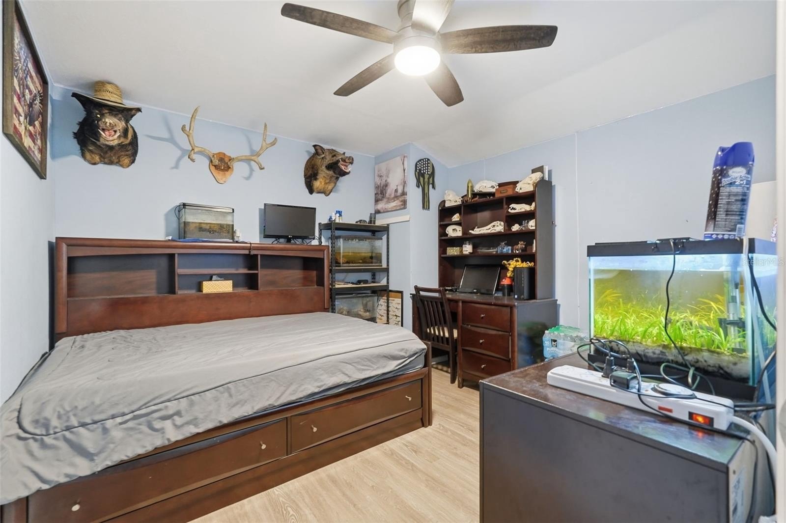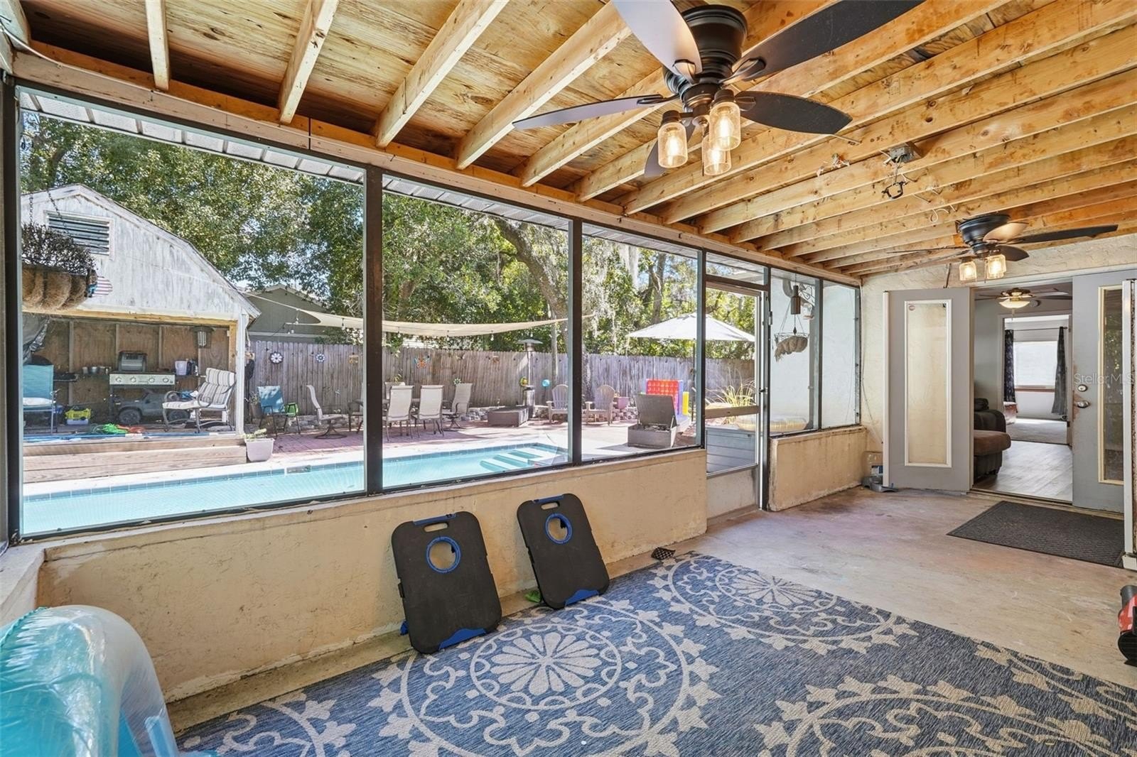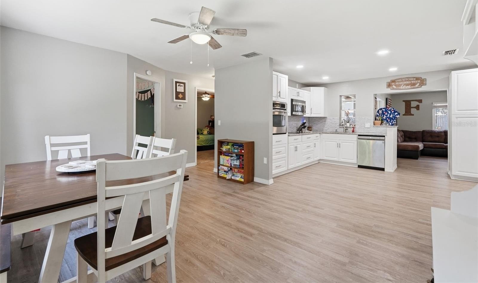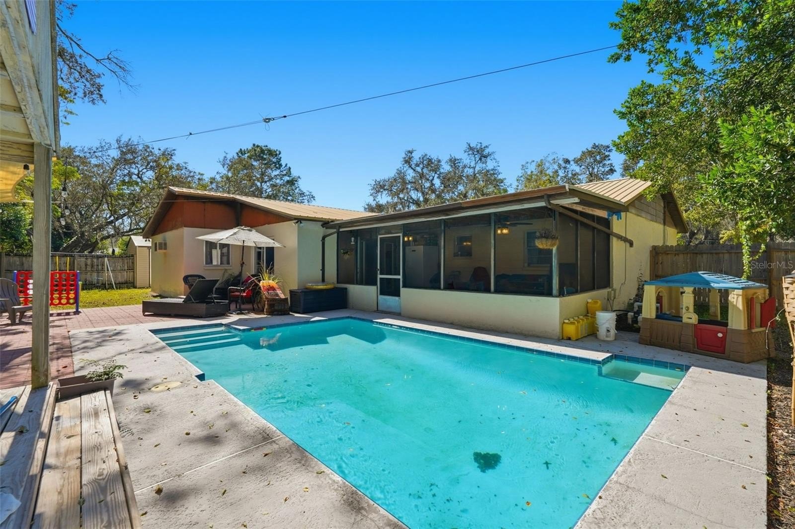 Beautifully updated 5-bedroom, 2-bath home in New Port Richey featuring a bright open-concept design. The modern kitchen boasts stainless steel appliances, upgraded cabinetry, and plenty of counter space for cooking and entertaining. The spacious living and dining areas flow seamlessly, creating an inviting atmosphere for gatherings. A split-bedroom layout provides privacy, with the primary suite tucked away at the back of the home offering an updated en-suite bath and a large walk-in closet. The main bathroom has been completely renovated and is conveniently located near two of the additional bedrooms. Step outside to your private Florida retreat—complete with a sparkling pool, screened lanai, and cabana, perfect for entertaining or relaxing. The fully fenced yard includes a storage shed for extra space. Recent updates include A/C (2017), flat roof (2023), metal roof (2010), shed (2022), septic tank and drainfield (2018), and a newer hot water heater. With no HOA, you’ll enjoy the freedom to make this property your own.