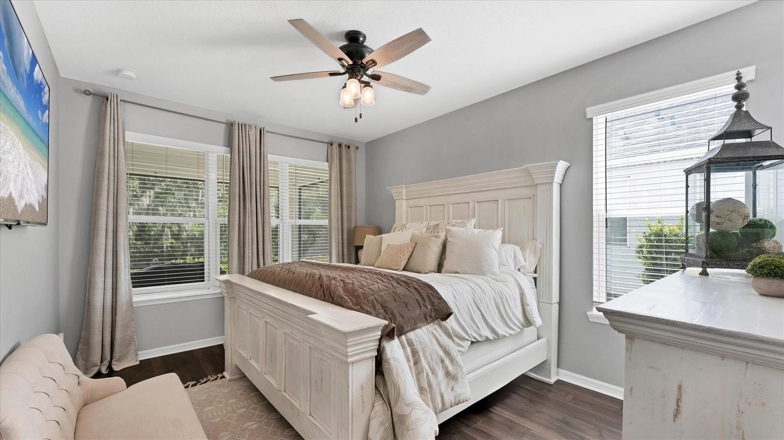 Welcome Home to your stunning family retreat nestled in the amenity rich lifestyle community of Eaves Bend at Artisan Lakes. Come experience next level living in this home; filled with features and upgrades throughout from floor to ceiling. Built in 2021 this like new home allows you to move in and immediately enjoy without the headaches and costly hassles that come with adding the finishing touches of purchasing from the builder. The home offers a tankless gas water heater providing efficiency. Both the range and dryer are also gas but have the option to go electric if preferred. This expansive home offers space and comforts no matter your needs. The generous owner's suite on the main floor features a private entry just off the family room, wooded back yard views and an En-suite bathroom with granite counters, dual sink, wood vanity, His & Hers Walk-in Closets, Walk-in Shower w/ built-in shelf, garden bath, natural light and a private water closet. The open kitchen has a large island w/ breakfast bar, aquasana filtered water and dedicated faucet, updated pendant and flush mount lighting, tile backsplash, granite counters, wood cabinetry, closet pantry, and stainless-steel appliances including a gas convection range. There is a casual dining room just off the kitchen & family room in addition to a stunning formal dining room that greats you as you enter the home that could also be used as a sitting room or secondary office. The styled laundry room complete with shelving, washer and gas dryer feels more like a boutique room than laundry room and speaks to the attention to care and detail felt throughout the home. The large screened-in Lanai features fans and flush-mount lighting all under roof for year-round enjoyment to watch a morning sunrise or curl up with a good book and your favorite beverage after a long day all in the privacy of your fully fenced back yard with wooded views. There is a 1/2 bath for your guests completing your space for entertaining your family and friends. Upstairs you'll be greeted by a bonus room with limitless options for how you want to use the space and an office tucked behind French Doors w/ ensuite bathroom that can easily be used as a 5th bedroom if desired. The 2nd bedroom is tucked away separately from the other bedrooms and a few steps from your 2nd bath and office. the other 2 bedrooms are down a separate hallway and share a bathroom. Eaves Bend at Artisan Lakes is known for it's low fees in this amenity rich lifestyle neighborhood and its great location that puts you close to dining, shopping, entertainment and great for commuting to all the surrounding areas. Heated Resort style pool/spa, 24 hr recently renovated fitness center, clubhouse w/ fully equipped kitchen, playgrounds, dog park, walking trails, sports court & field are just a few of the amenities that make this a wonderful place to live. Take a tour, fall in love and make this amazing home yours today!
