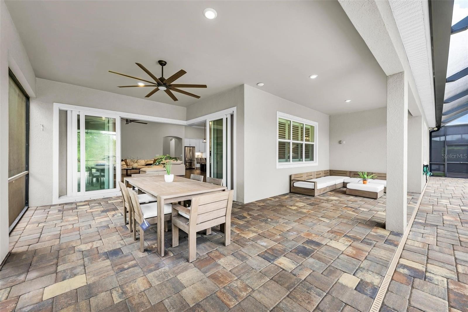 Adjacent, the dining area dazzles with a new Pottery Barn chandelier and direct access to the outdoor oasis through zero-corner sliding glass doors. The Primary Suite offers a private sanctuary, a spacious bedroom with a large walk-in closet featuring a built-in organization system, and an en-suite bath complete with double vanities, a soaking tub, and a separate shower.