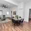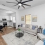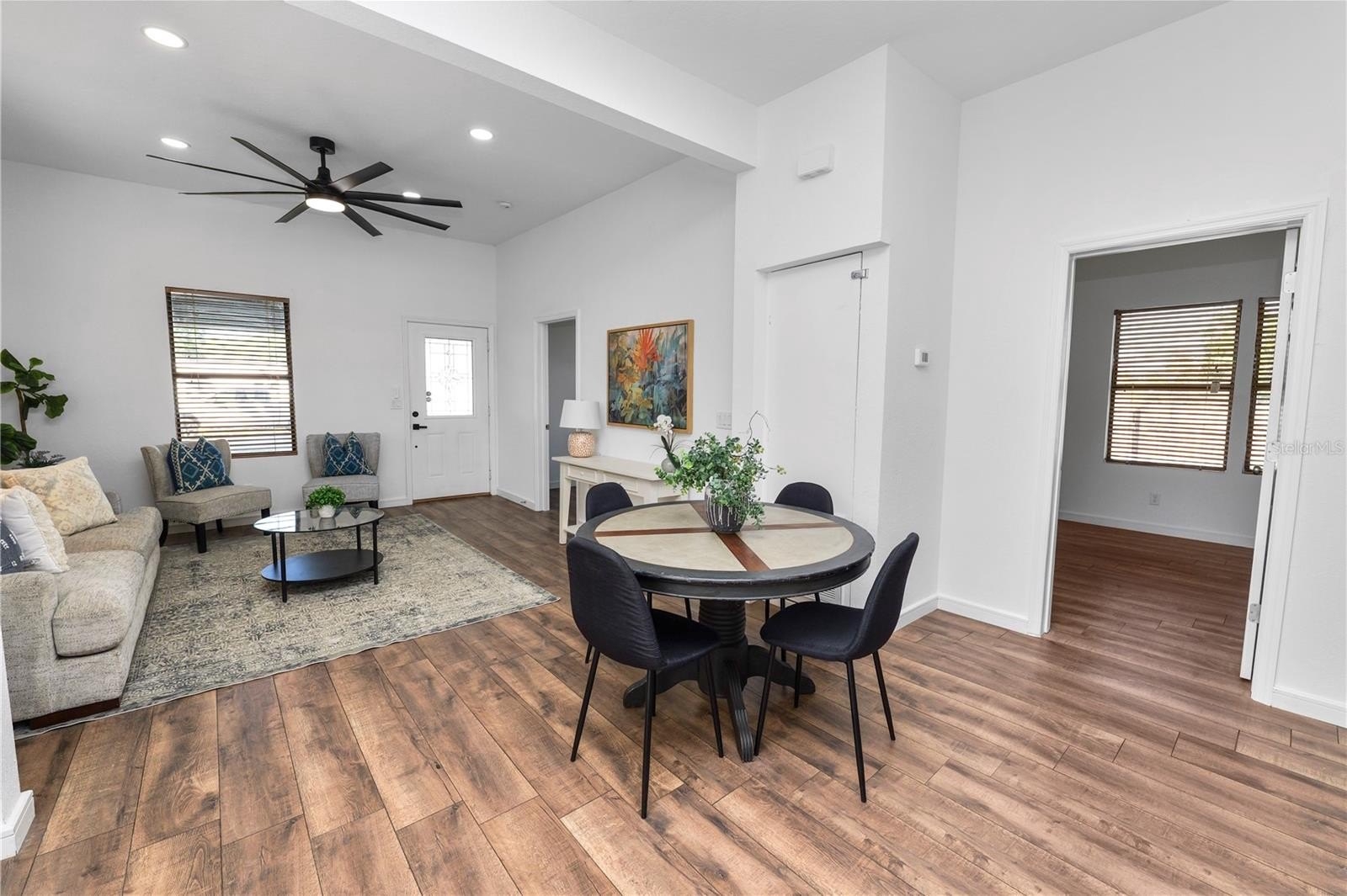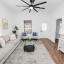 Step inside to an open floor plan where the living and dining areas connect effortlessly. The cozy living room is filled with natural light from surrounding windows and features a sleek modern ceiling fan. The kitchen feels bright and inviting with stone countertops, light cabinetry, stainless steel appliances, a stylish backsplash, and a large window over the sink with views of the backyard.