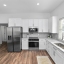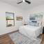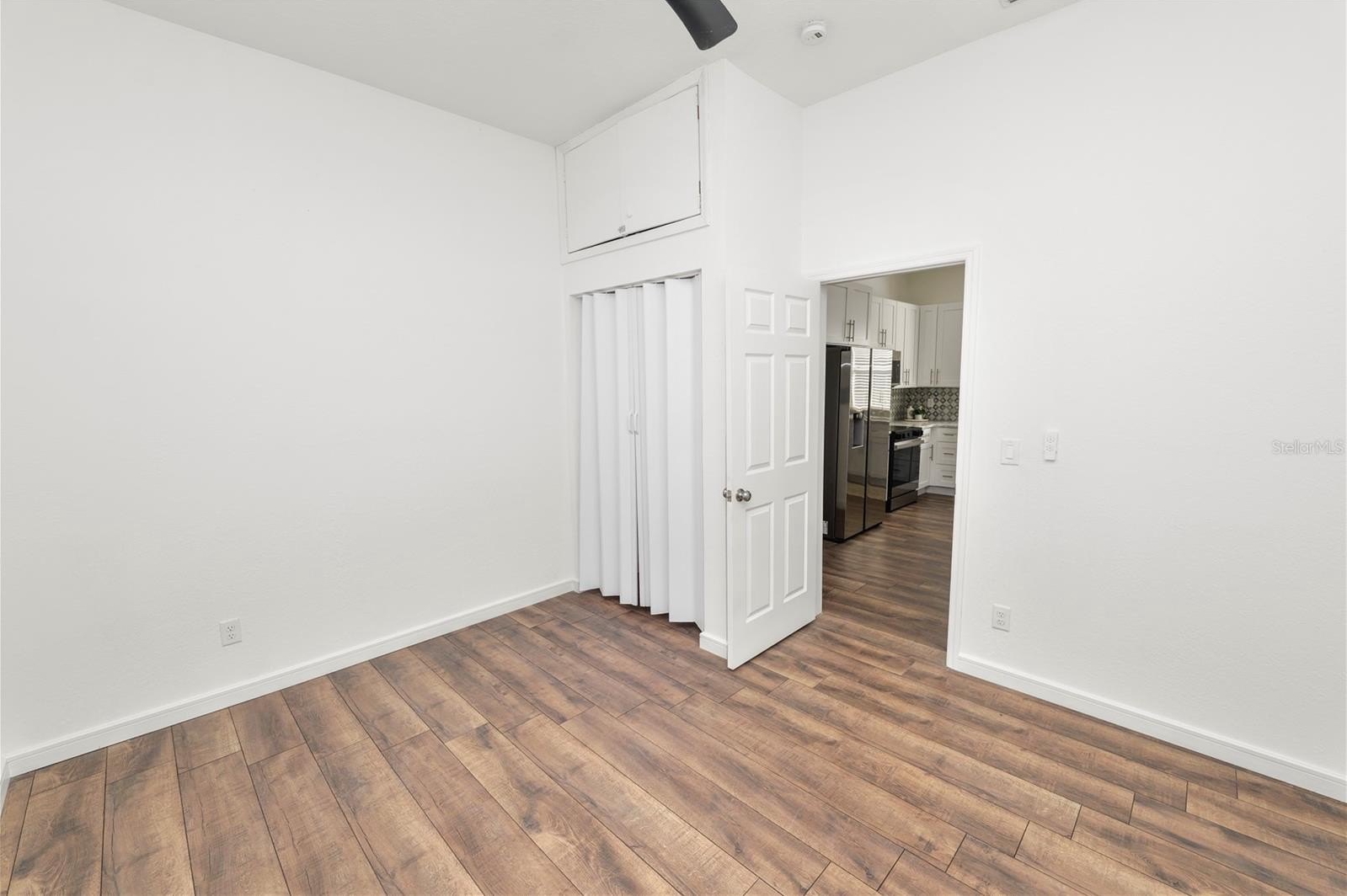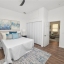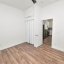 The master bedroom is spacious with laminate flooring and a double closet. The main bathroom features a single sink vanity with a brushed nickel faucet, and a tub-and-shower combination with light tile. Two additional bedrooms provide great flexibility — perfect for guests, an office, or a creative space.