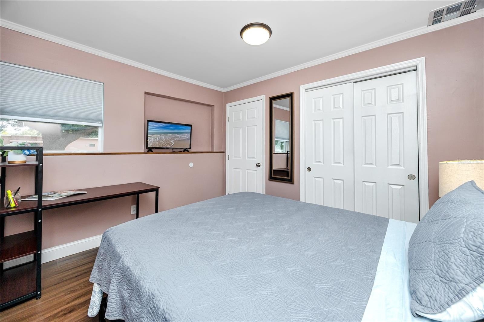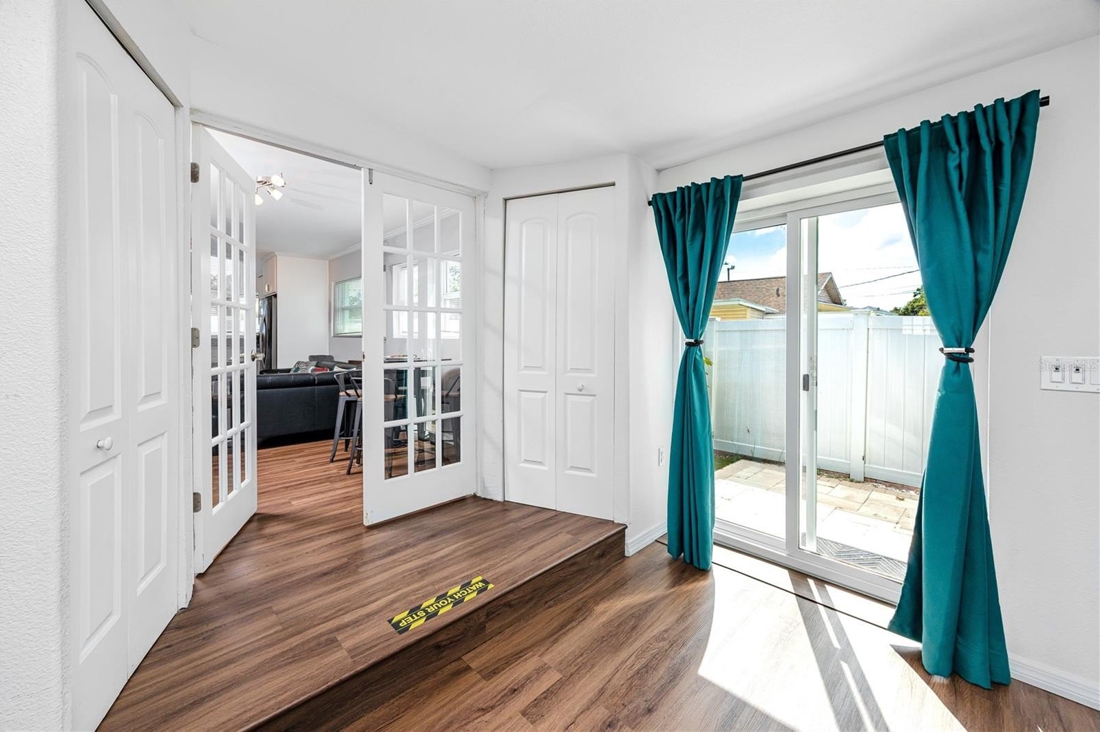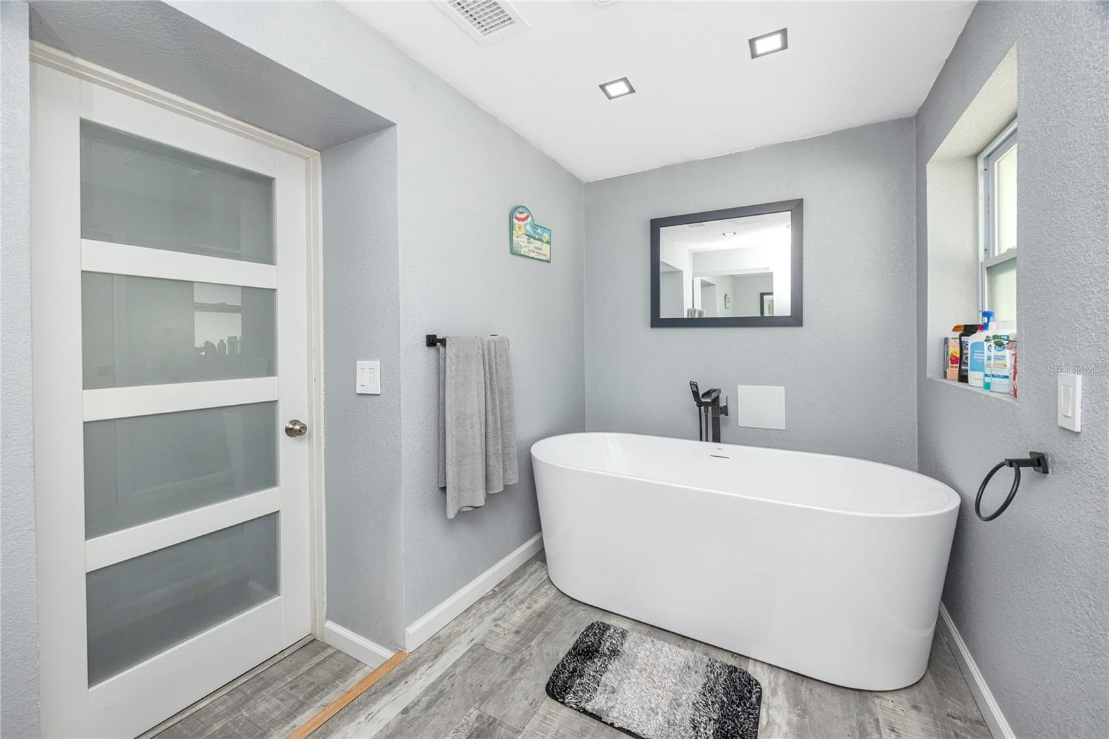 A smart split-bedroom layout provides privacy and versatility. The expansive primary suite, tucked behind classic French doors, features vaulted ceilings with a natural wood beam, multiple closets, built-in shelving, sliding glass access to the backyard, and an ensuite bath designed for relaxation. The bath includes a soaking tub, dual-sink vanity, LED-lit anti-fog smart mirror, and modern fixtures—all just steps from a private door leading to the outdoor retreat. Two additional bedrooms share a beautifully updated bath with a tiled walk-in shower, rain showerhead, quartz-topped vanity with generous storage, and a full-size stacked washer and dryer.