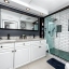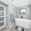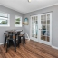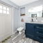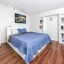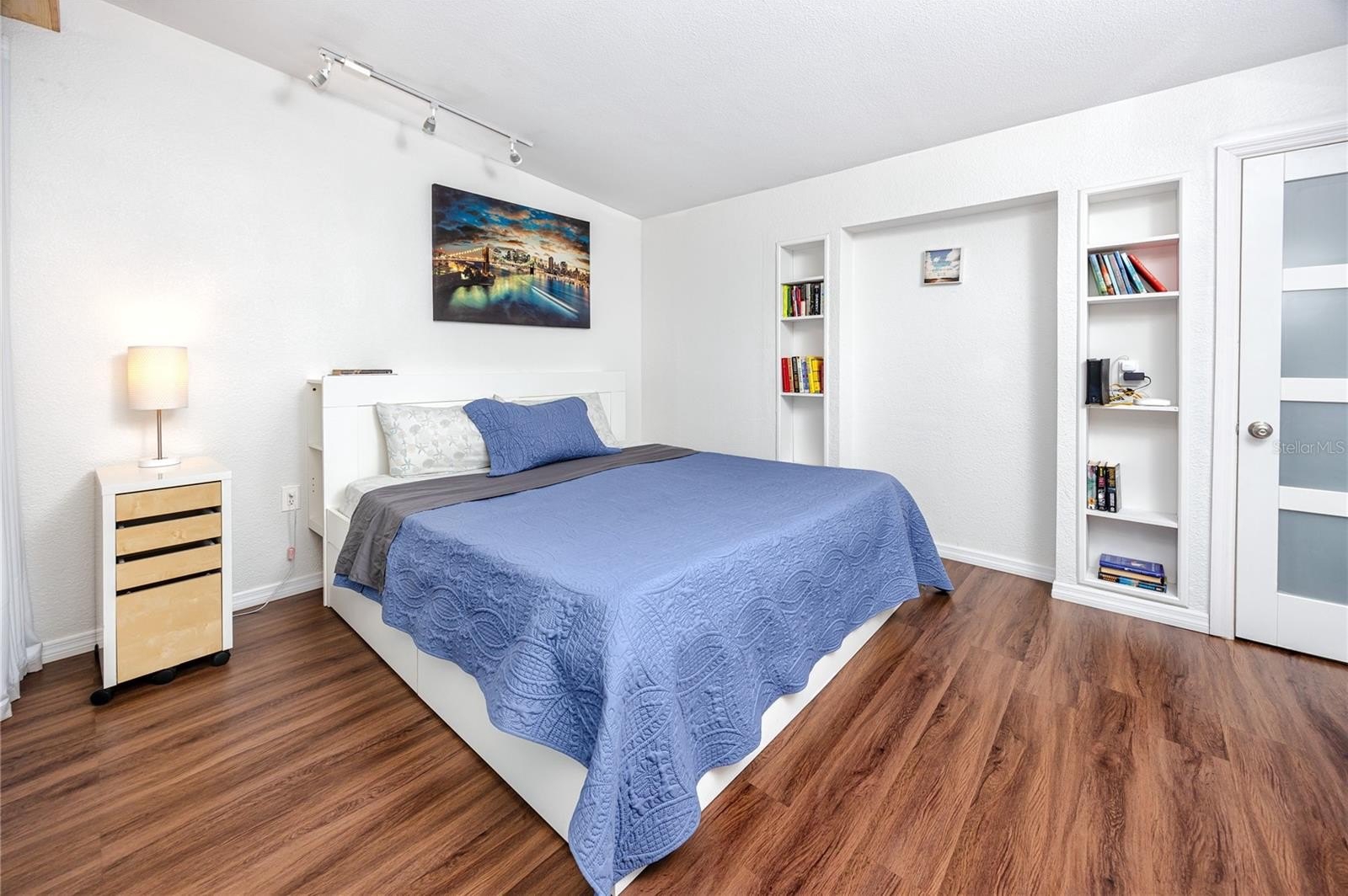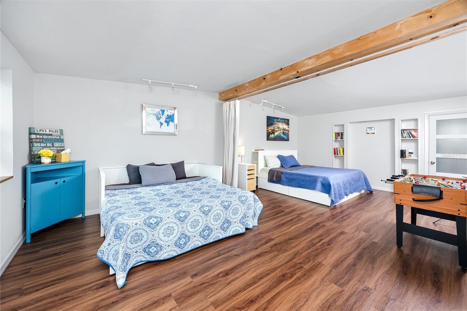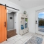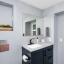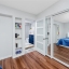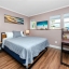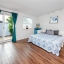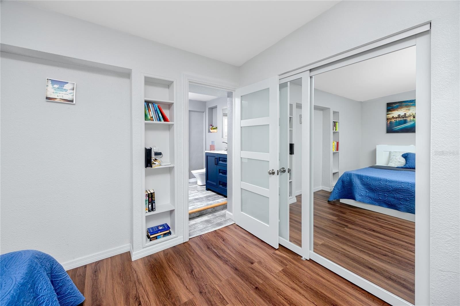 A smart split-bedroom layout provides privacy and versatility. The expansive primary suite, tucked behind classic French doors, features vaulted ceilings with a natural wood beam, multiple closets, built-in shelving, sliding glass access to the backyard, and an ensuite bath designed for relaxation. The bath includes a soaking tub, dual-sink vanity, LED-lit anti-fog smart mirror, and modern fixtures—all just steps from a private door leading to the outdoor retreat. Two additional bedrooms share a beautifully updated bath with a tiled walk-in shower, rain showerhead, quartz-topped vanity with generous storage, and a full-size stacked washer and dryer.