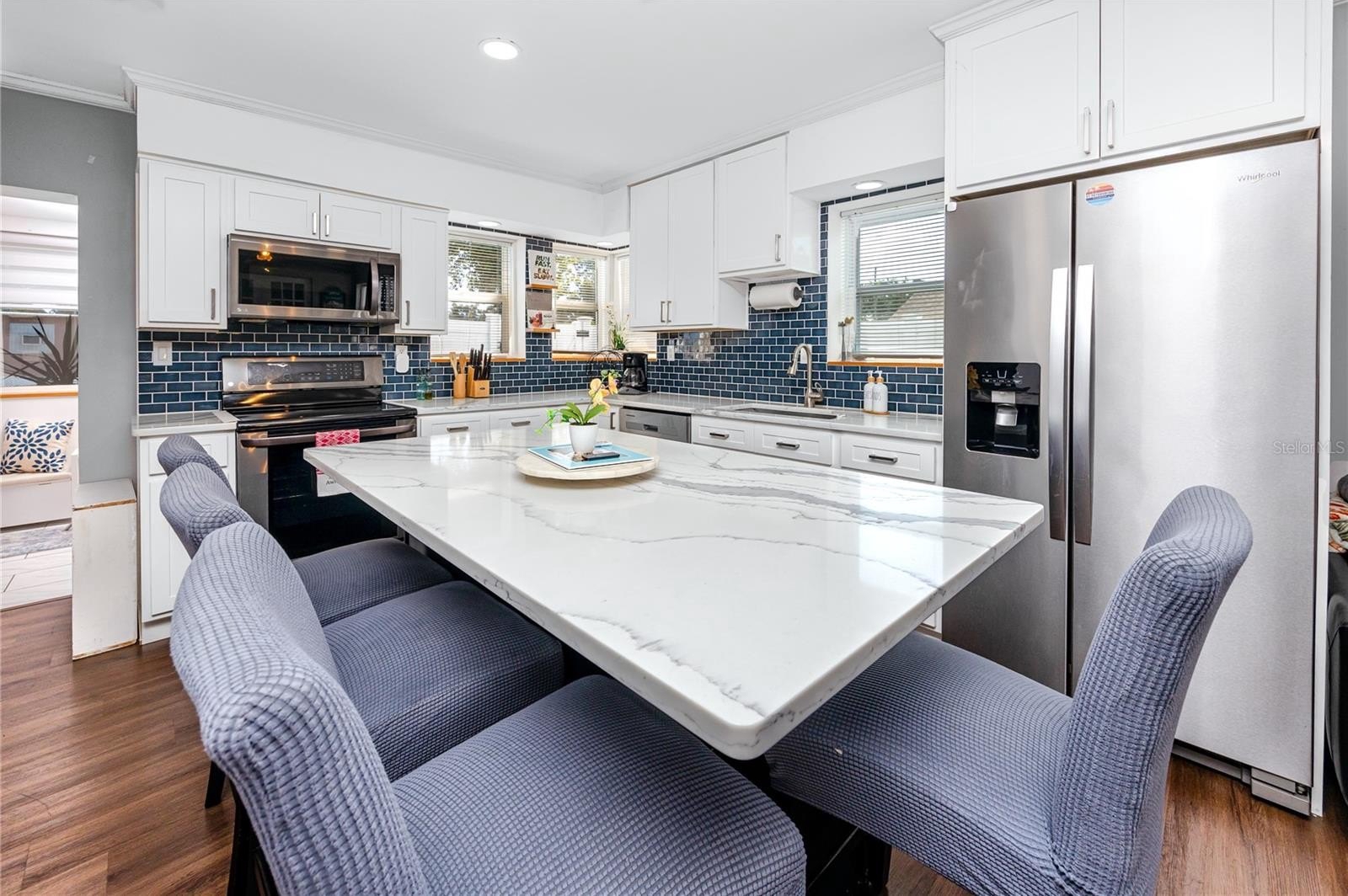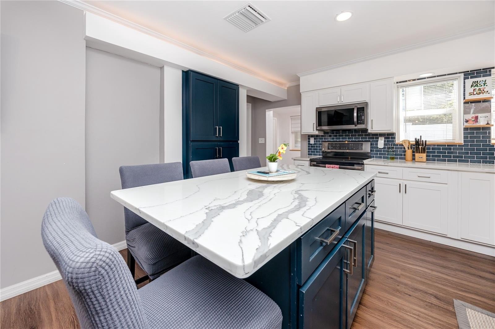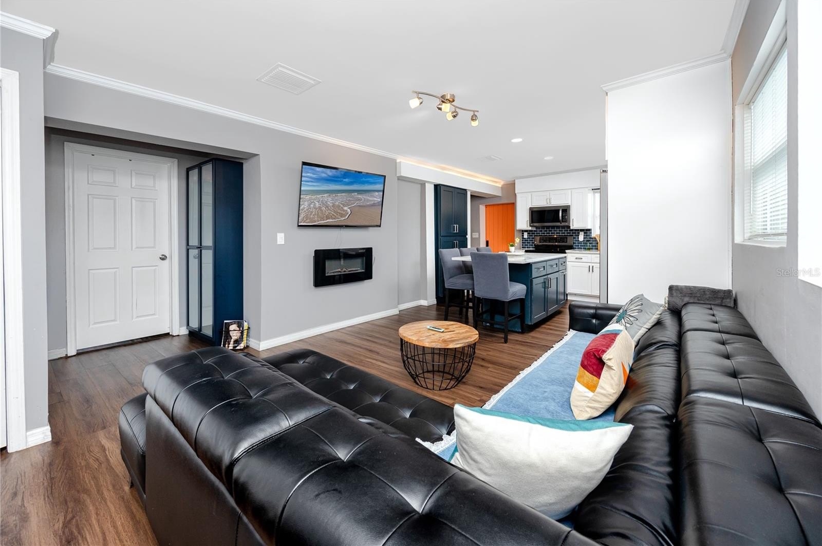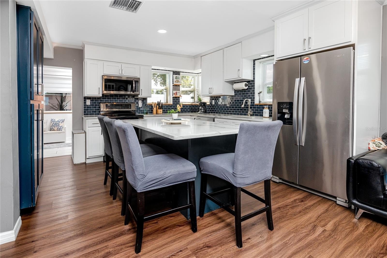 Step through the tiled foyer into a bright, open-concept living space where modern recessed lighting, crown molding, and newer luxury vinyl plank flooring set the tone for everyday elegance. The spacious living area centers around a sleek electric fireplace, complemented by LED uplighting that highlights the home’s contemporary design. The kitchen is both functional and refined, showcasing quartz countertops, a full backsplash, newer stainless-steel appliances, and a central island with bar seating—perfect for entertaining guests or enjoying casual dining at home.
