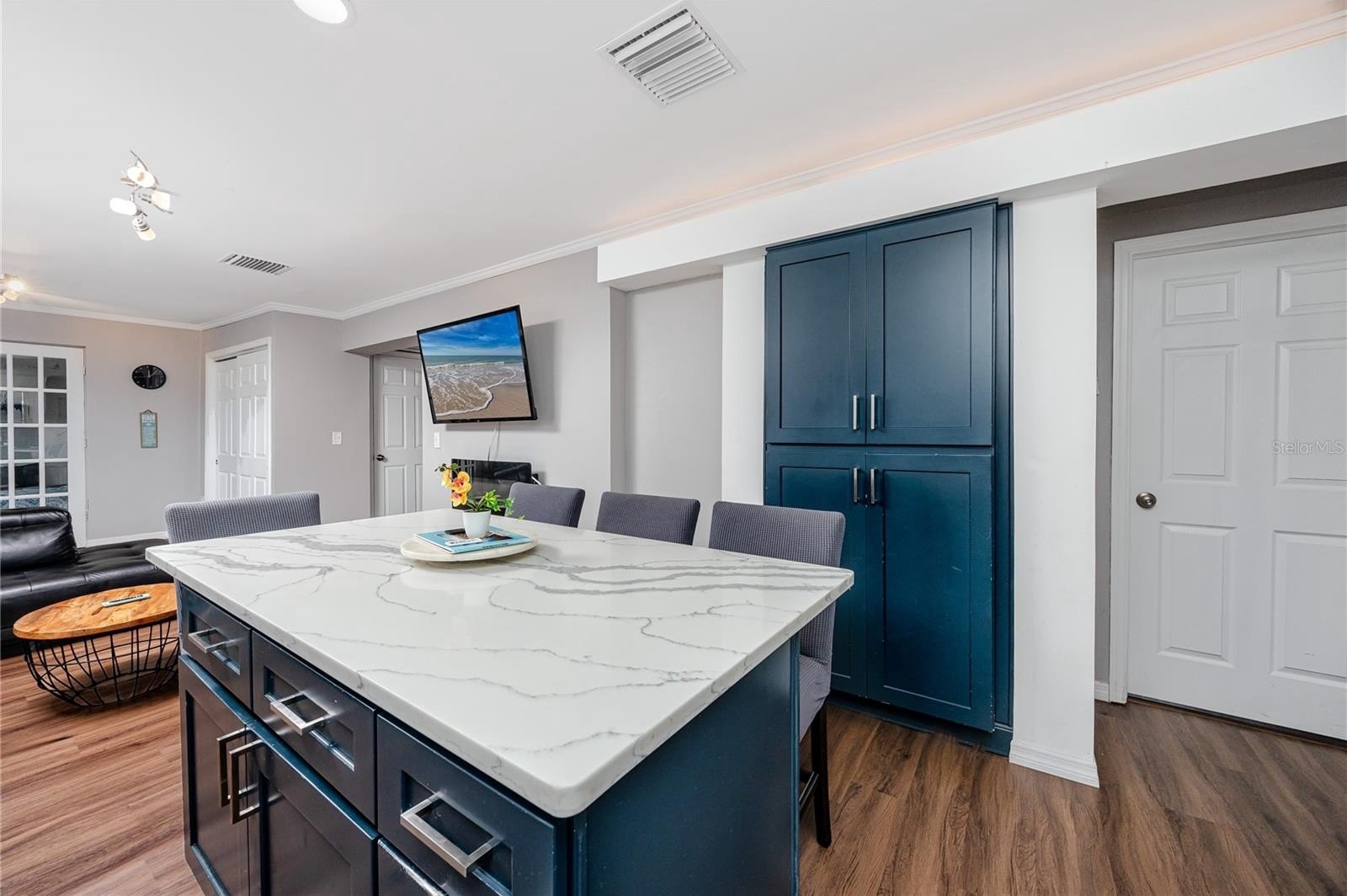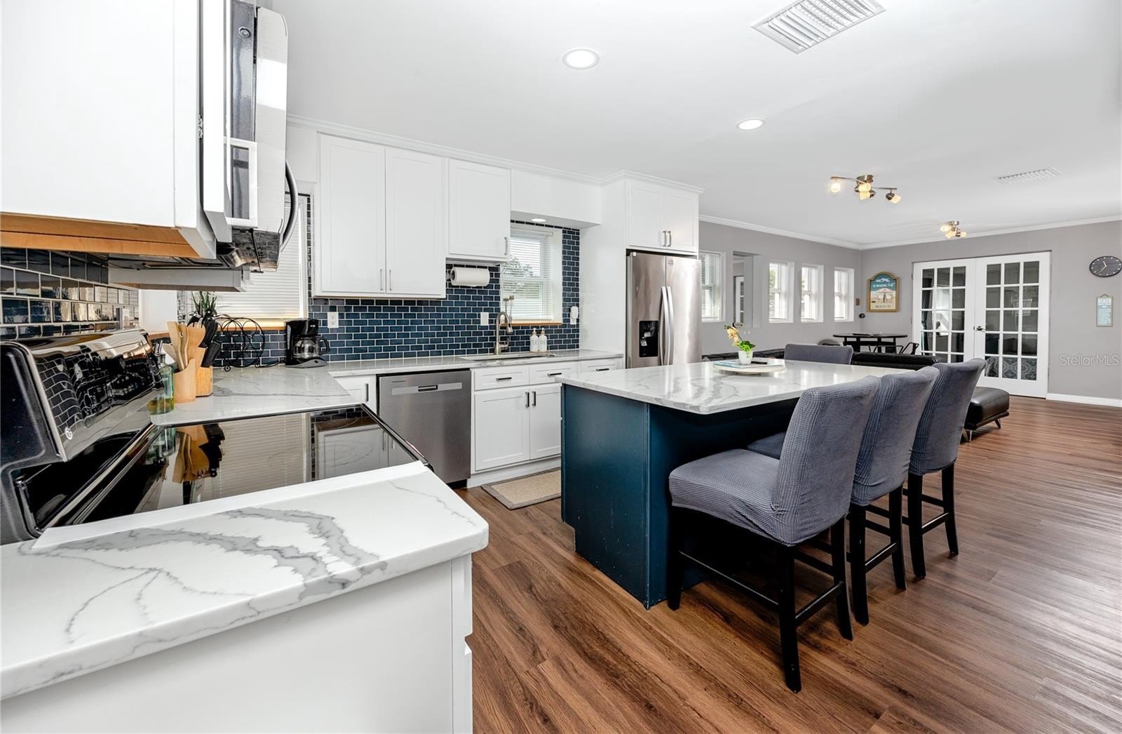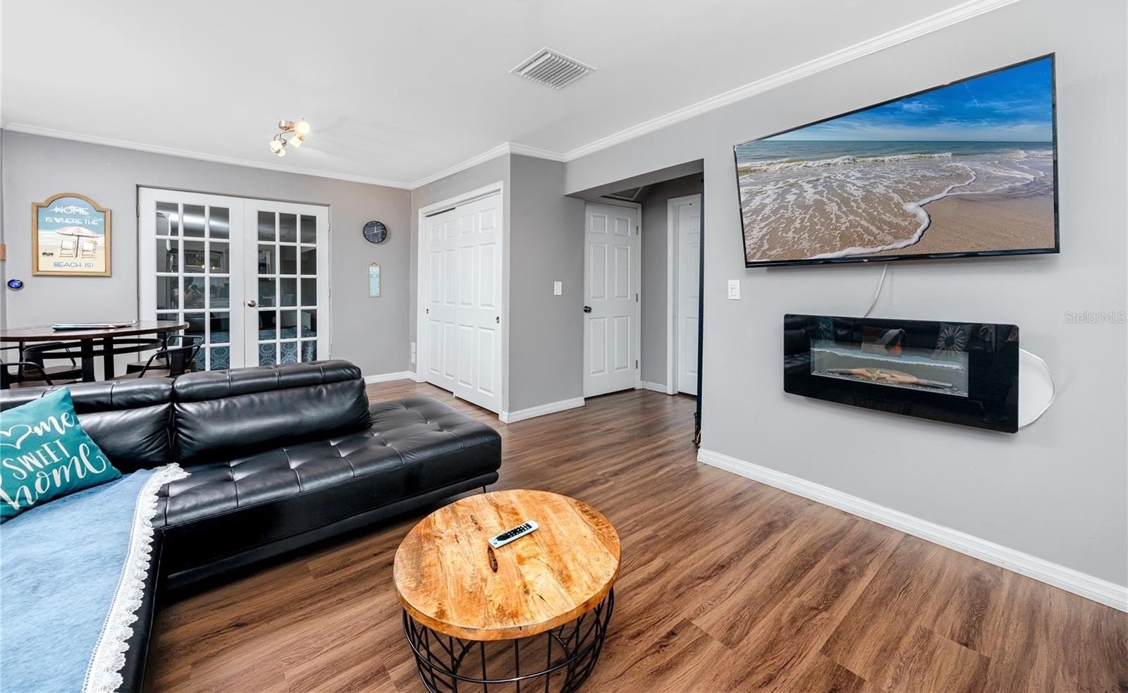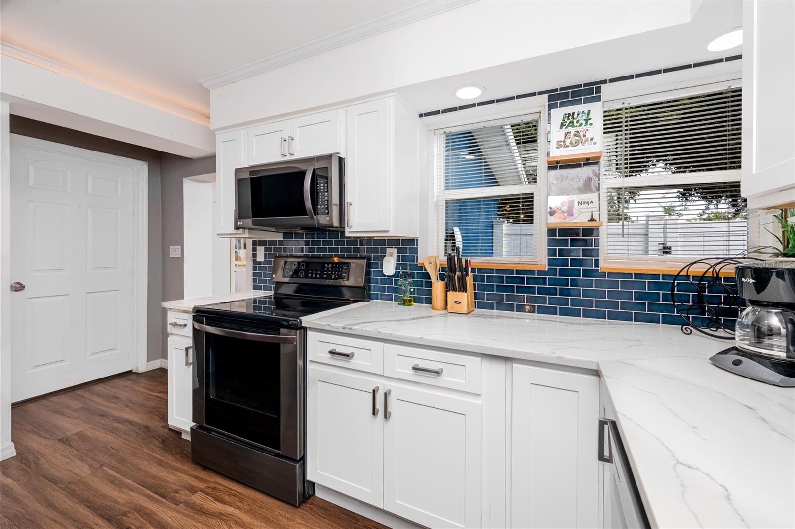 Step through the tiled foyer into a bright, open-concept living space where modern recessed lighting, crown molding, and newer luxury vinyl plank flooring set the tone for everyday elegance. The spacious living area centers around a sleek electric fireplace, complemented by LED uplighting that highlights the home’s contemporary design. The kitchen is both functional and refined, showcasing quartz countertops, a full backsplash, newer stainless-steel appliances, and a central island with bar seating—perfect for entertaining guests or enjoying casual dining at home.
