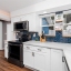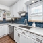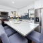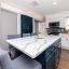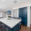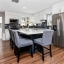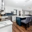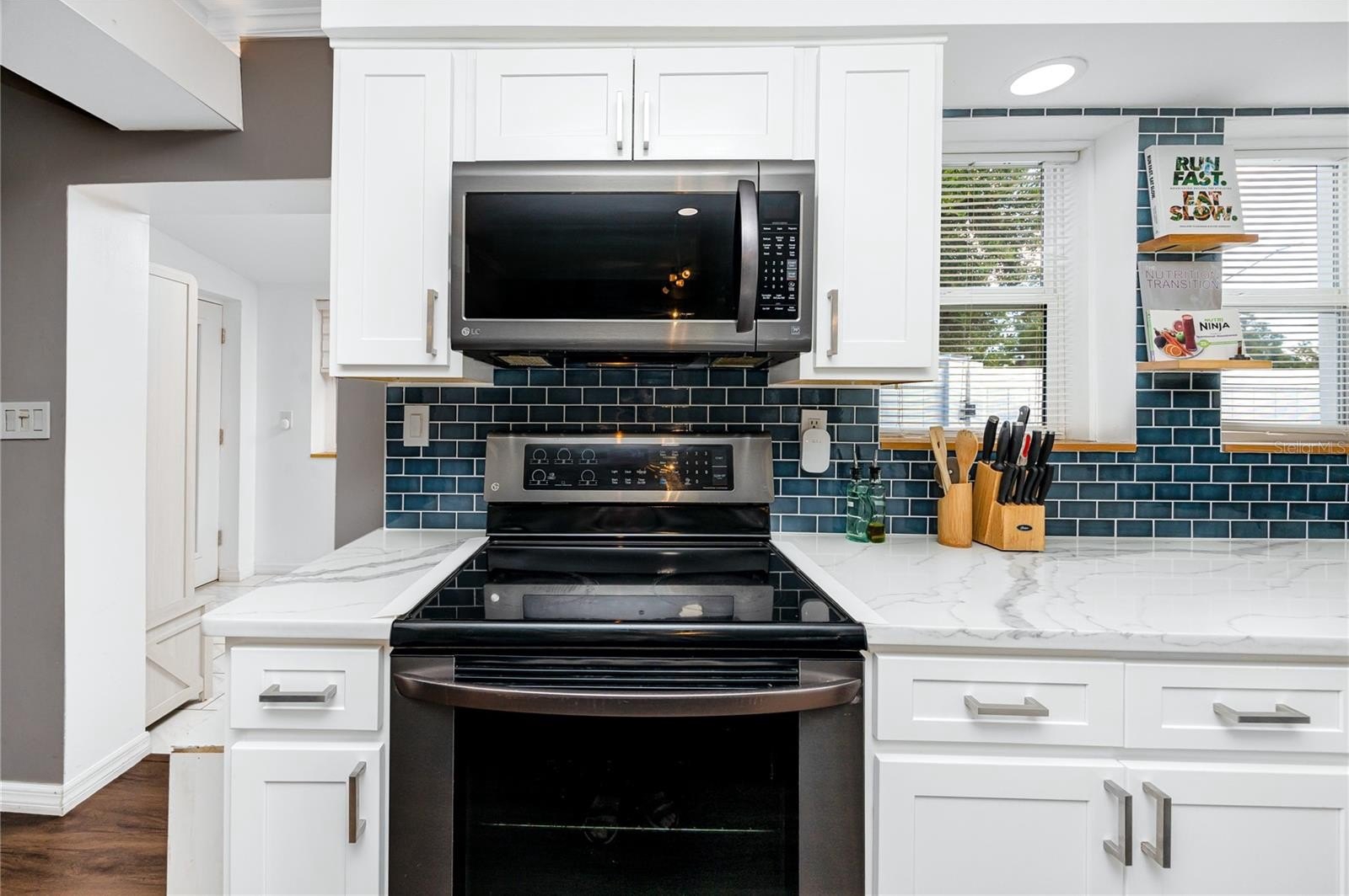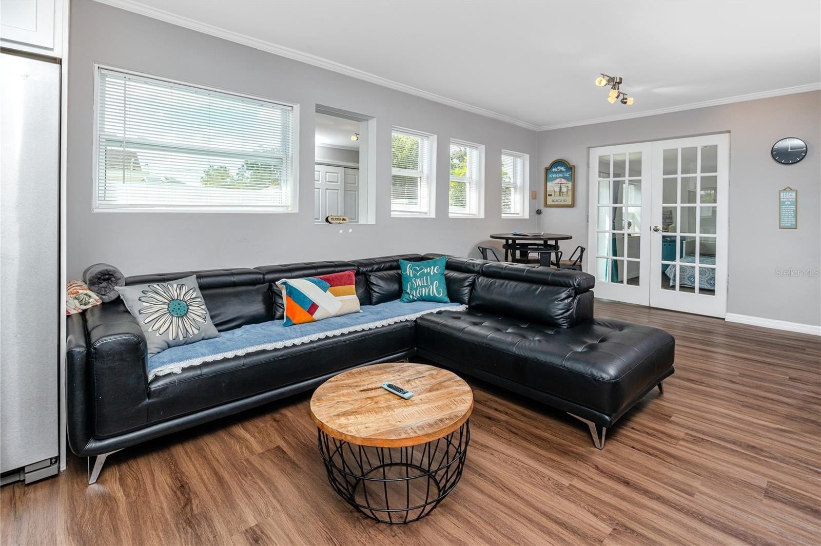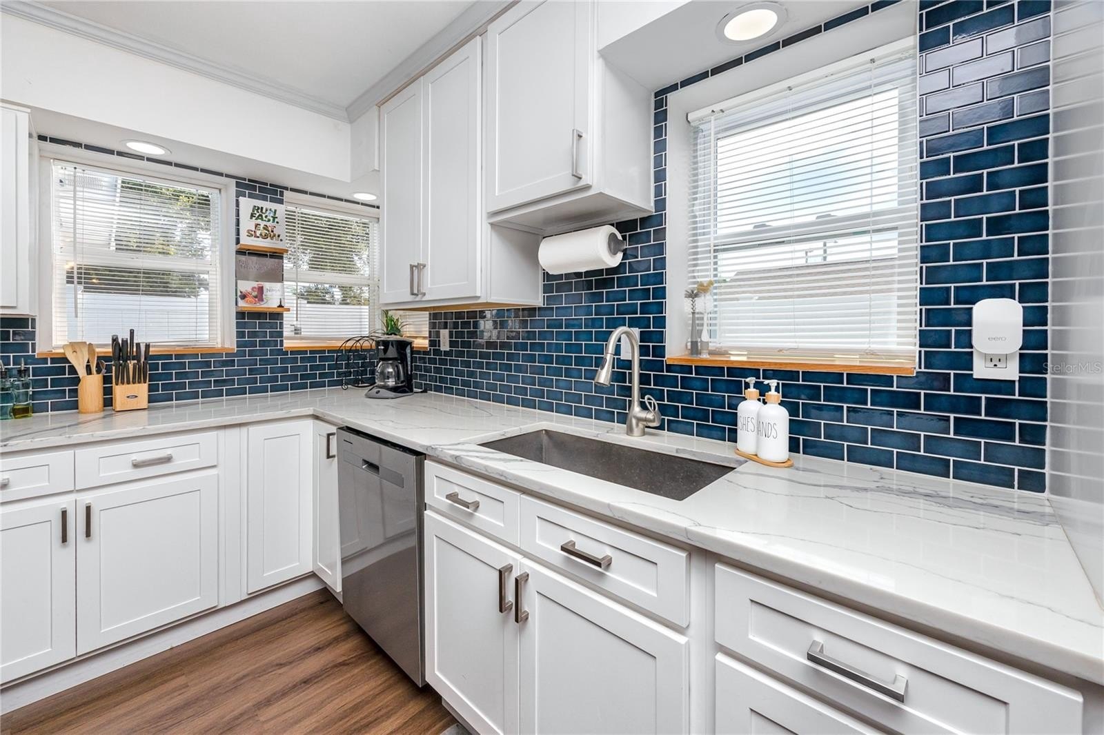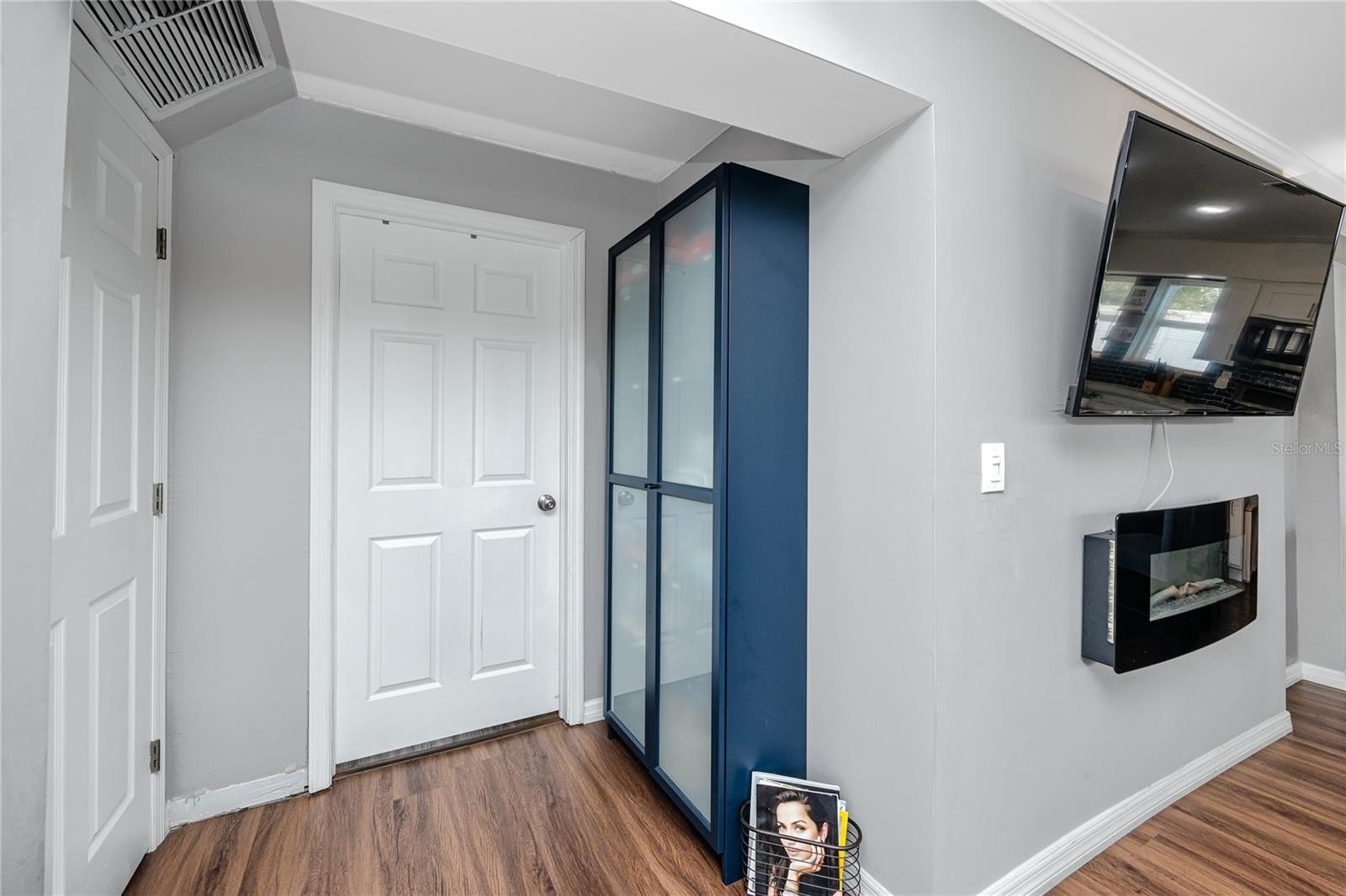 Step through the tiled foyer into a bright, open-concept living space where modern recessed lighting, crown molding, and newer luxury vinyl plank flooring set the tone for everyday elegance. The spacious living area centers around a sleek electric fireplace, complemented by LED uplighting that highlights the home’s contemporary design. The kitchen is both functional and refined, showcasing quartz countertops, a full backsplash, newer stainless-steel appliances, and a central island with bar seating—perfect for entertaining guests or enjoying casual dining at home.