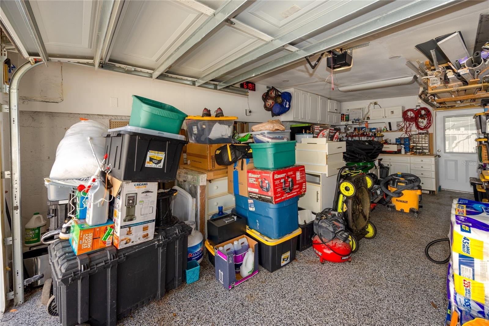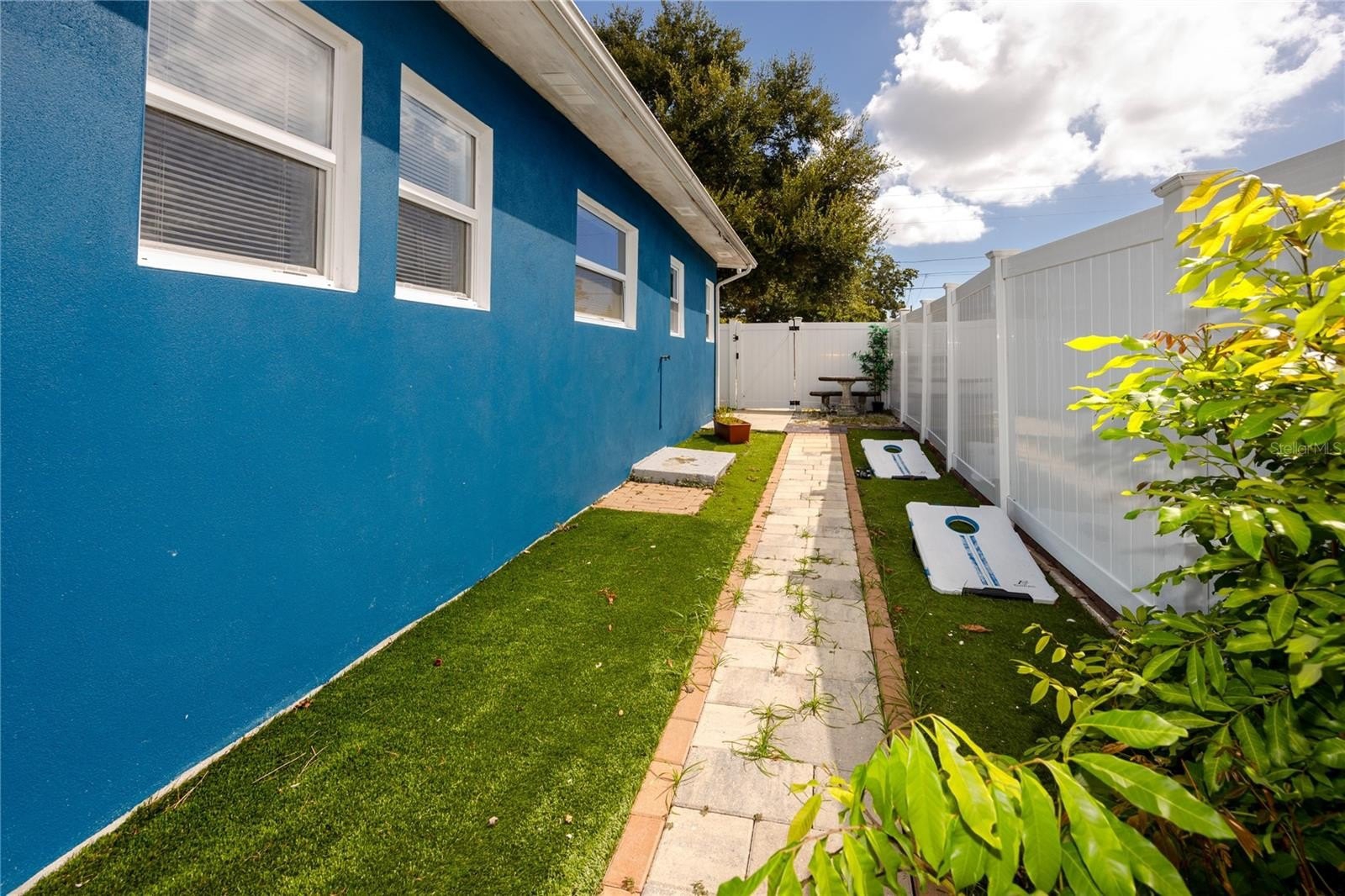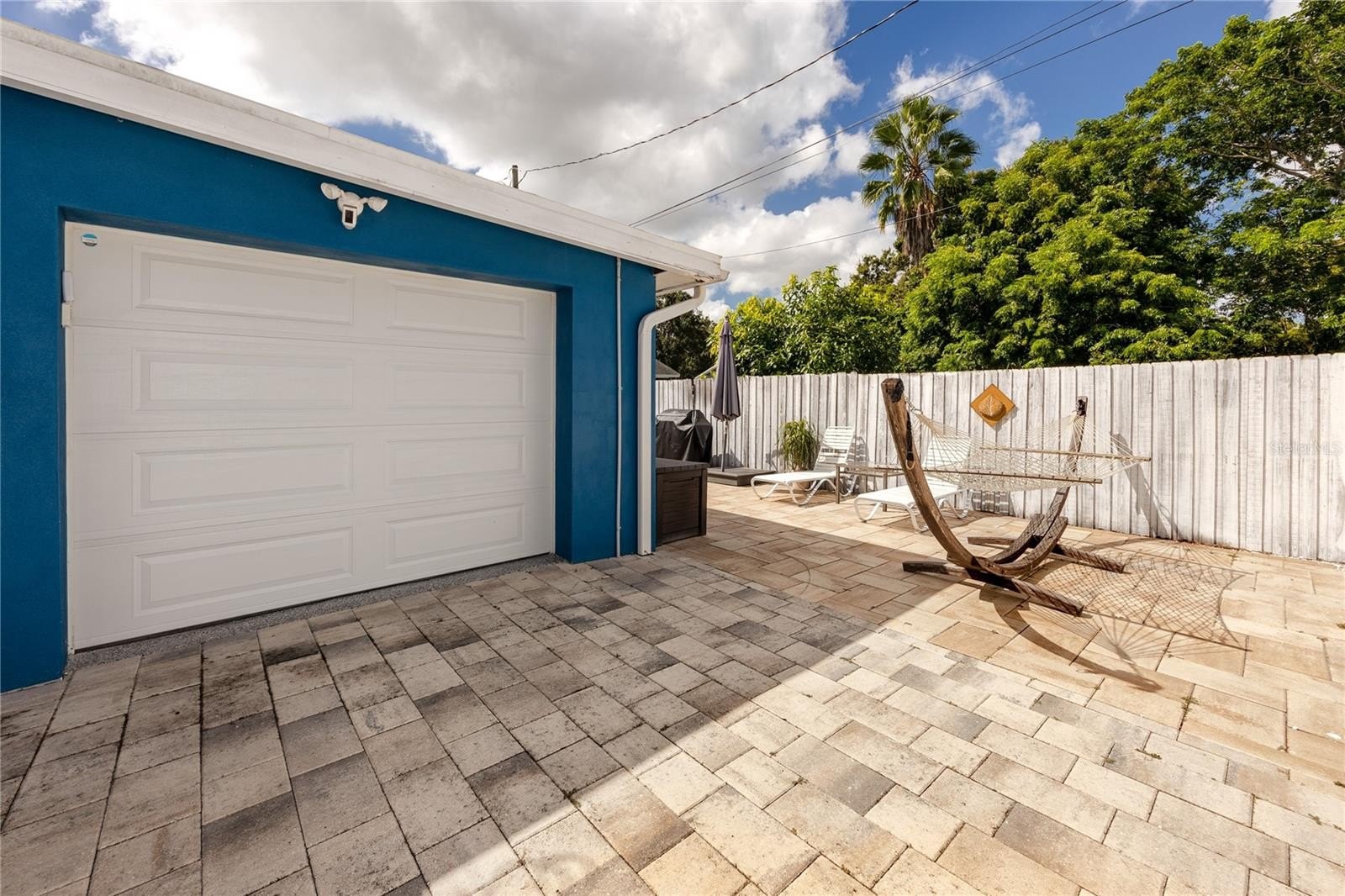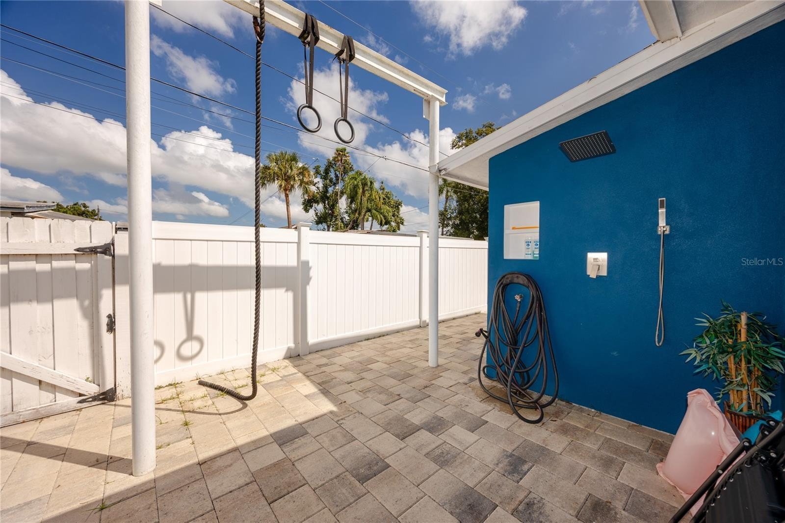 Outdoors, paver walkways wrap around the home, connecting shaded sitting areas enclosed by a white vinyl privacy fence. A custom gym ring bay offers a convenient fitness option, located just steps from the outdoor shower with a rain showerhead. The oversized garage and extended driveway provide ample parking, workshop potential, and additional storage, complete with a pre-installed Tesla charger. The low-maintenance xeriscaped front yard enhances curb appeal while keeping upkeep to a minimum.