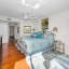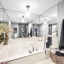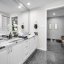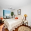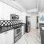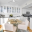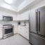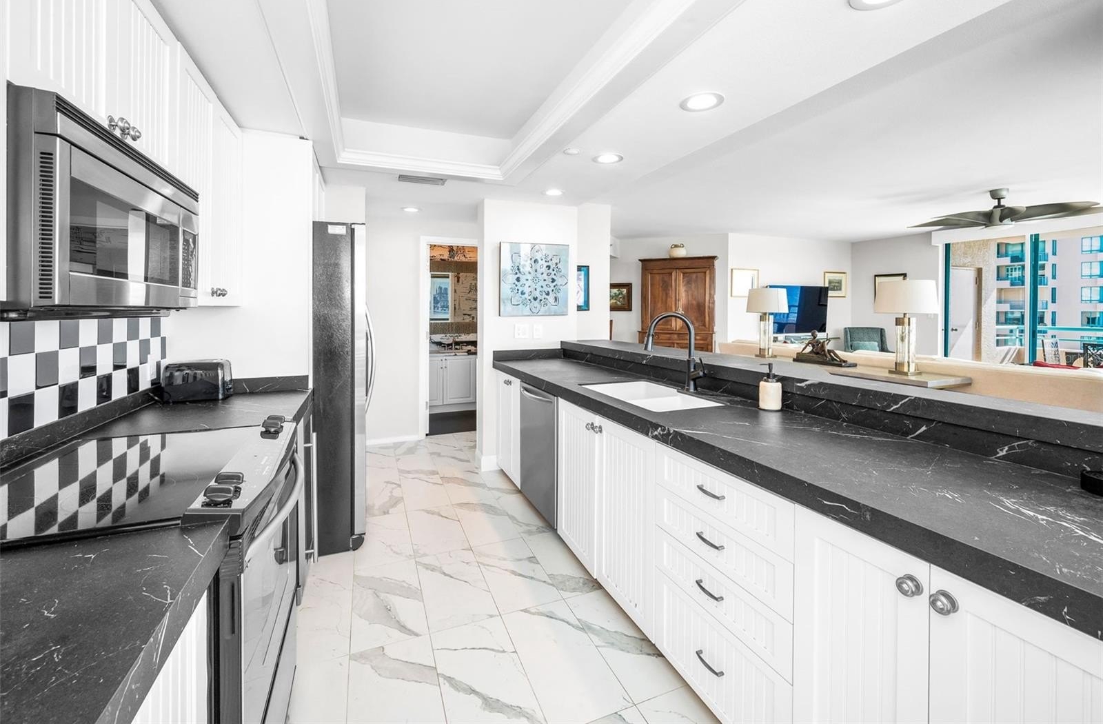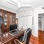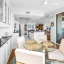 The modern kitchen features white cabinetry, sleek porcelain countertops, and stainless-steel appliances — perfect for the home chef. Elegant wood floors flow throughout, complemented by automatic custom solar shades for comfort and privacy.