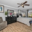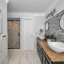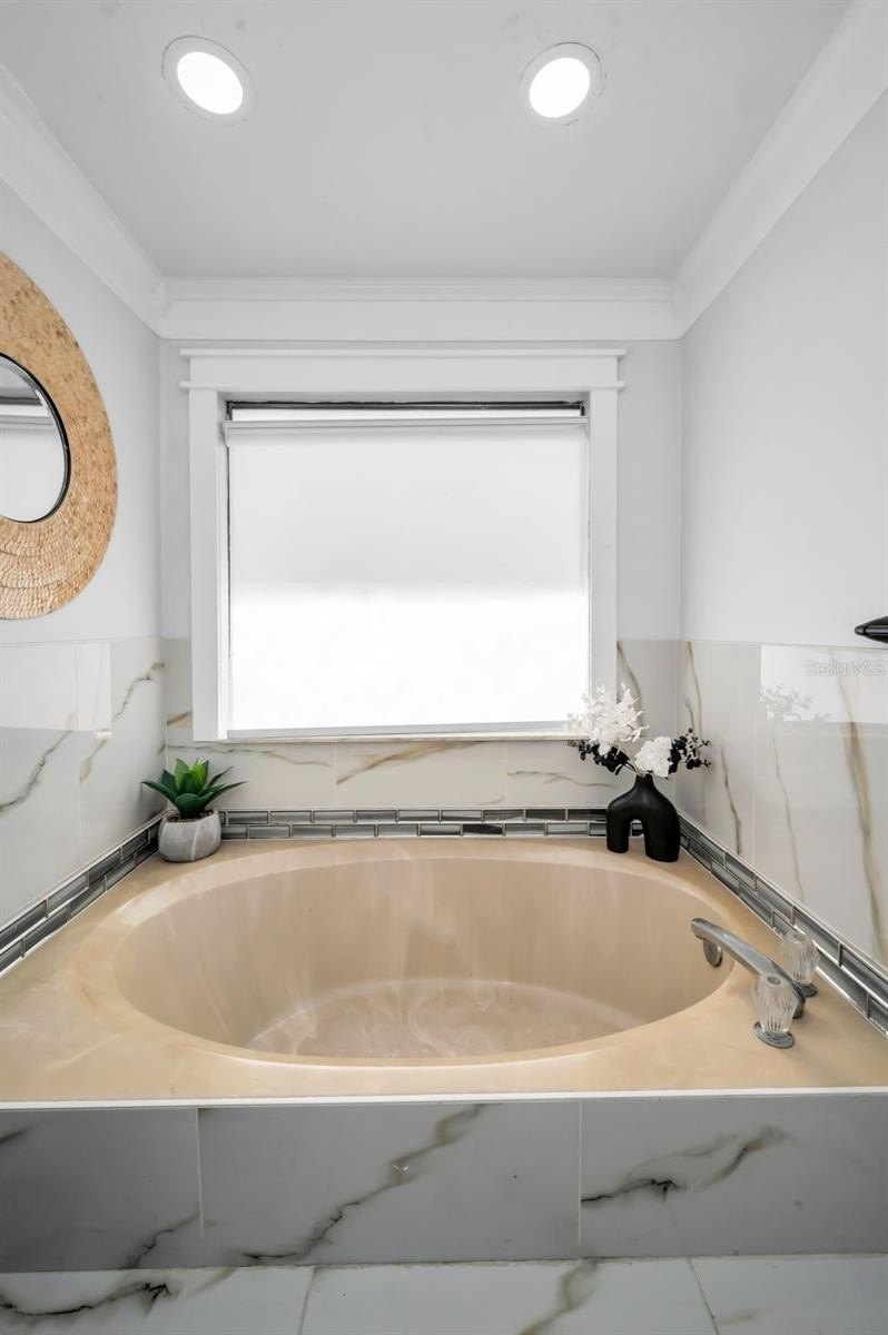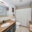 The spacious primary suite offers a peaceful escape with a spa-like ensuite bath featuring dual vanities, a soaking tub, modern sinks, and a walk-in tiled shower. Two additional guest bedrooms are located on the main level, conveniently situated near a beautifully updated guest bath—perfect for family or visitors.