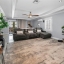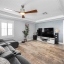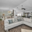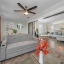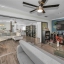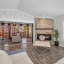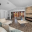 Step inside to a grand two-story entrance and an elegant staircase with modern iron balusters leading to the main living area. The open floor plan seamlessly connects the living, dining, and kitchen spaces—perfect for entertaining or relaxing. The living room features a gorgeous stone accent wall with a fireplace and sliding doors that open to a versatile flex space with access to a balcony overlooking the water.