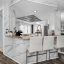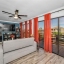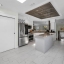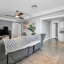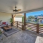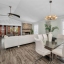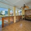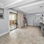 The updated modern kitchen is a true showstopper, featuring a center island with a granite waterfall edge, marble backsplash, stainless steel appliances, a breakfast bar, tile flooring, and a large closet pantry. A second set of sliding doors leads to a private covered patio, ideal for morning coffee or evening gatherings.