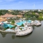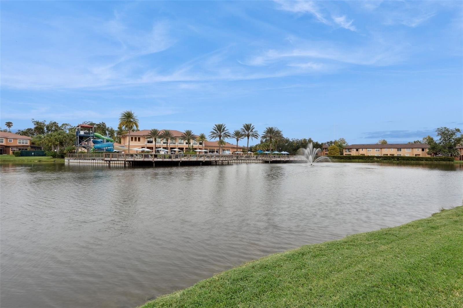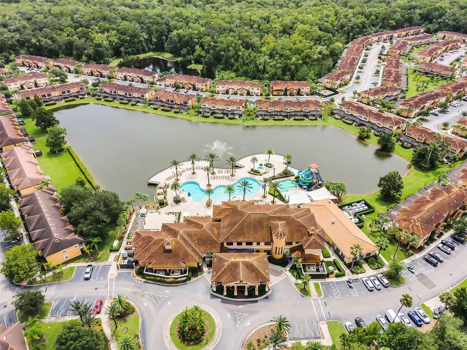 Resort living at it's finest located just 4 miles to Disney, and just blocks from the famous Old Town & Fun Spot Park! Sitting on one of the most desirable lots in the neighborhood, you'll have a non-obstructed, waterfront, back yard view of the community amenities, including water park, pool, outside bar, and clubhouse! No more wondering if the pool is packed, just look out of your back window before you head down! The units with this view have always held more value in both resale and short term rental rates. So whether you're looking for a 2nd home, an AirBnb investment, or full time resort living, you'll have piece of mind knowing that you own one of the best views in this gated community! Community includes an on-site restaurant, mini market, fitness center, tennis, pool, water slide, and a pool side bar. This home is in great condition and comes fully furnished for a turn key experience! Kitchen includes granite countertops and stainless steel appliances. Both bedrooms are upstairs and each come with a full bathroom. One of the bathrooms have been fully renovated with a modern design! The large lanai includes a private hot tub; perfect for relaxing while enjoying the amazing views this unit offers! Great rental history with positive cash flow. Others are for sale, but THIS one "takes the cake"!