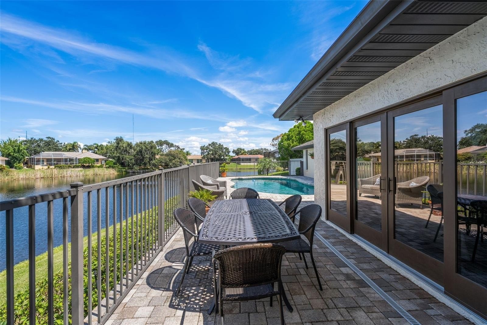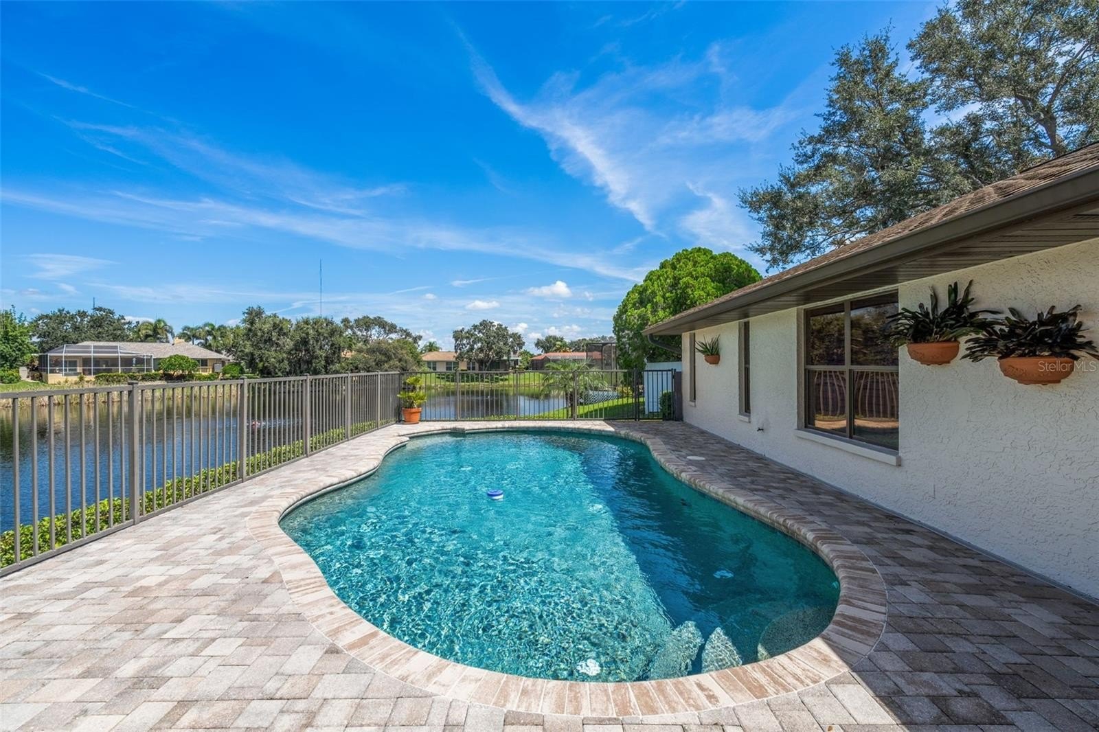 Discover the elegance of Riviera Bay, an established waterfront community, with this meticulously maintained lakefront pool home—a true rarity. Important to note: this home has never flooded! As you approach, you'll be impressed by the mature landscape, paver driveway, and inviting entry that set the tone for this unique property. Step inside to a welcoming foyer adorned with travertine tile floors, leading you to rooms that boast beautiful water views. Enjoy the warmth of the sunroom's wood-burning fireplace or entertain in the beautiful dining and living rooms. For dining al fresco, the tranquil poolside setting by the quiet lake offers the perfect ambiance, day or night.