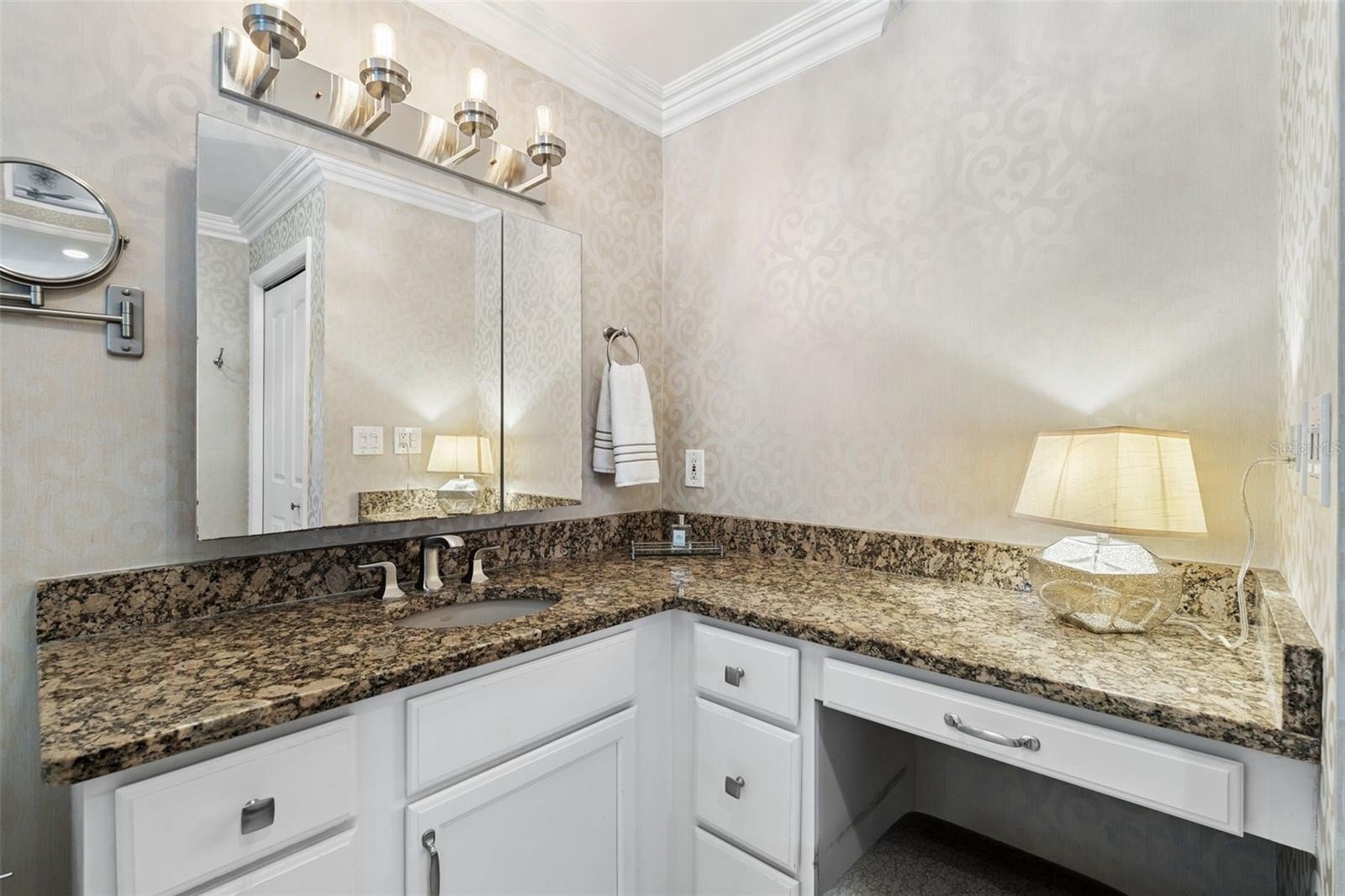 Inside, the kitchen stands out with white Kraftmaid cabinets, some featuring glass fronts for displaying your cherished items. It is complemented by granite countertops, stainless steel appliances, and a spacious breakfast bar. Adjacent, the large family room, enhanced by custom cabinetry, provides a cozy space for gatherings or TV time. Retreat to the primary bedroom, a serene space with an en suite bath, walk-in shower, and custom vanity. The generously sized second bedroom also features an en suite full bath, while the versatile third bedroom can serve as a home office, workout space, nursery, or playroom, conveniently located near the third full bath with a jacuzzi tub.