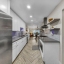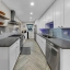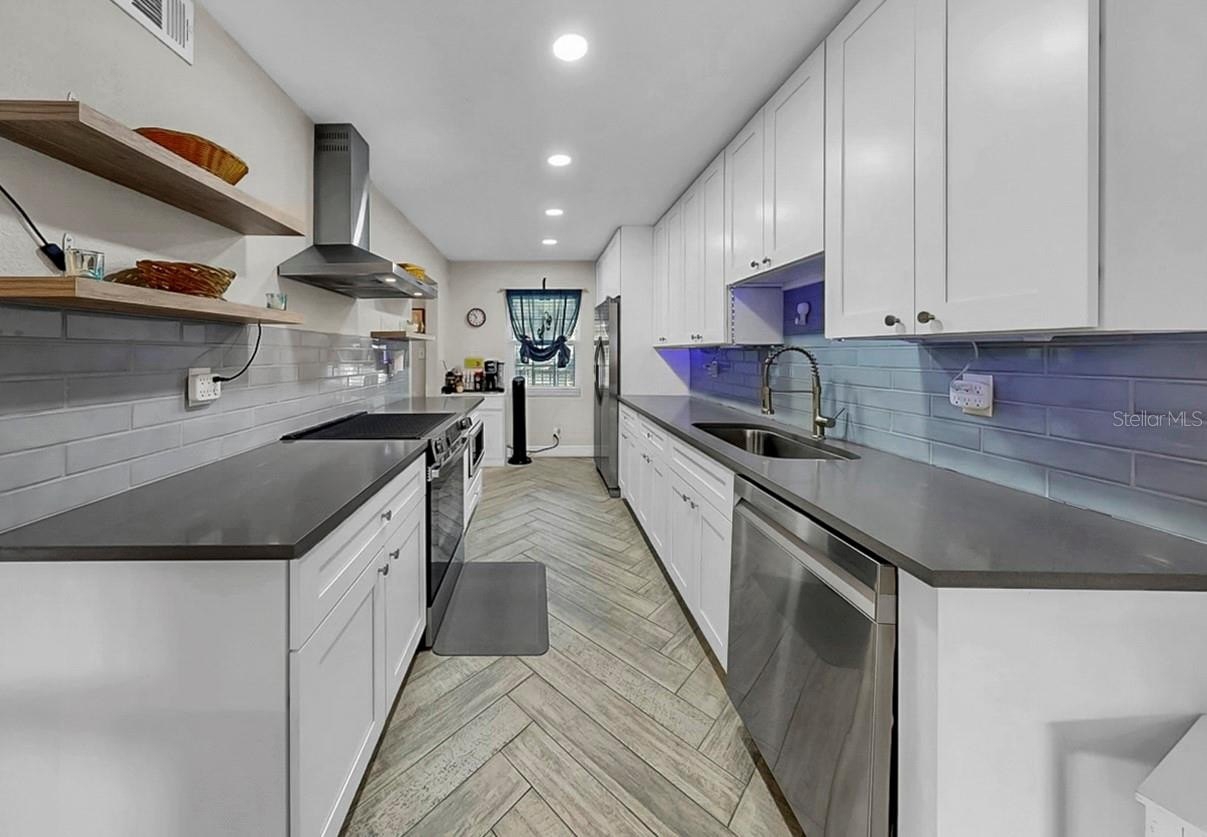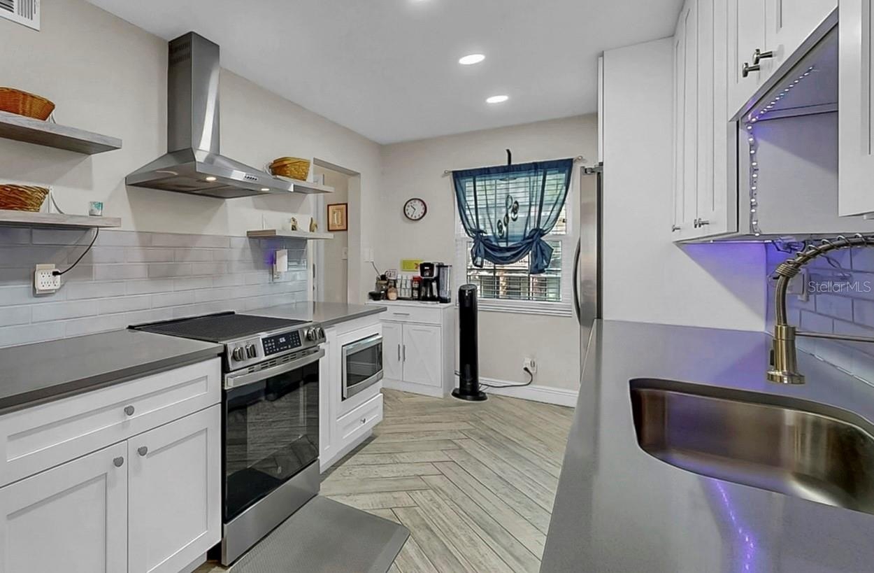 The fully updated kitchen is a showstopper with new white shaker cabinets, quartz countertops, stainless steel appliances, and custom open shelving that adds warmth and character.