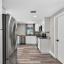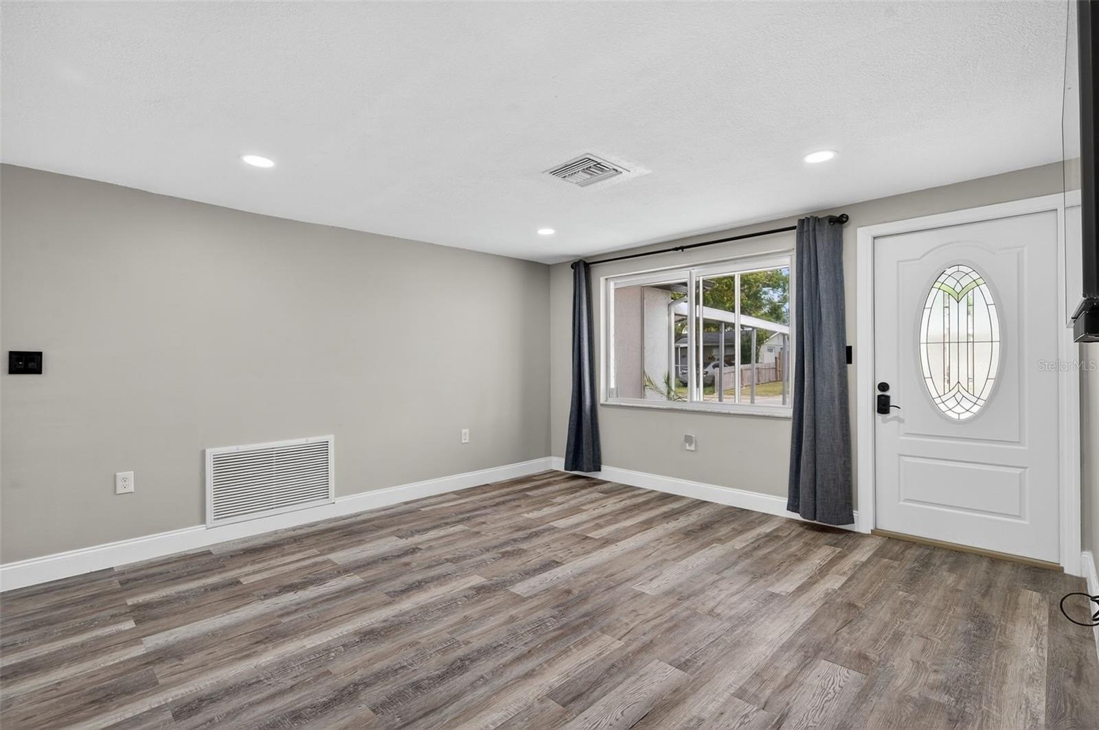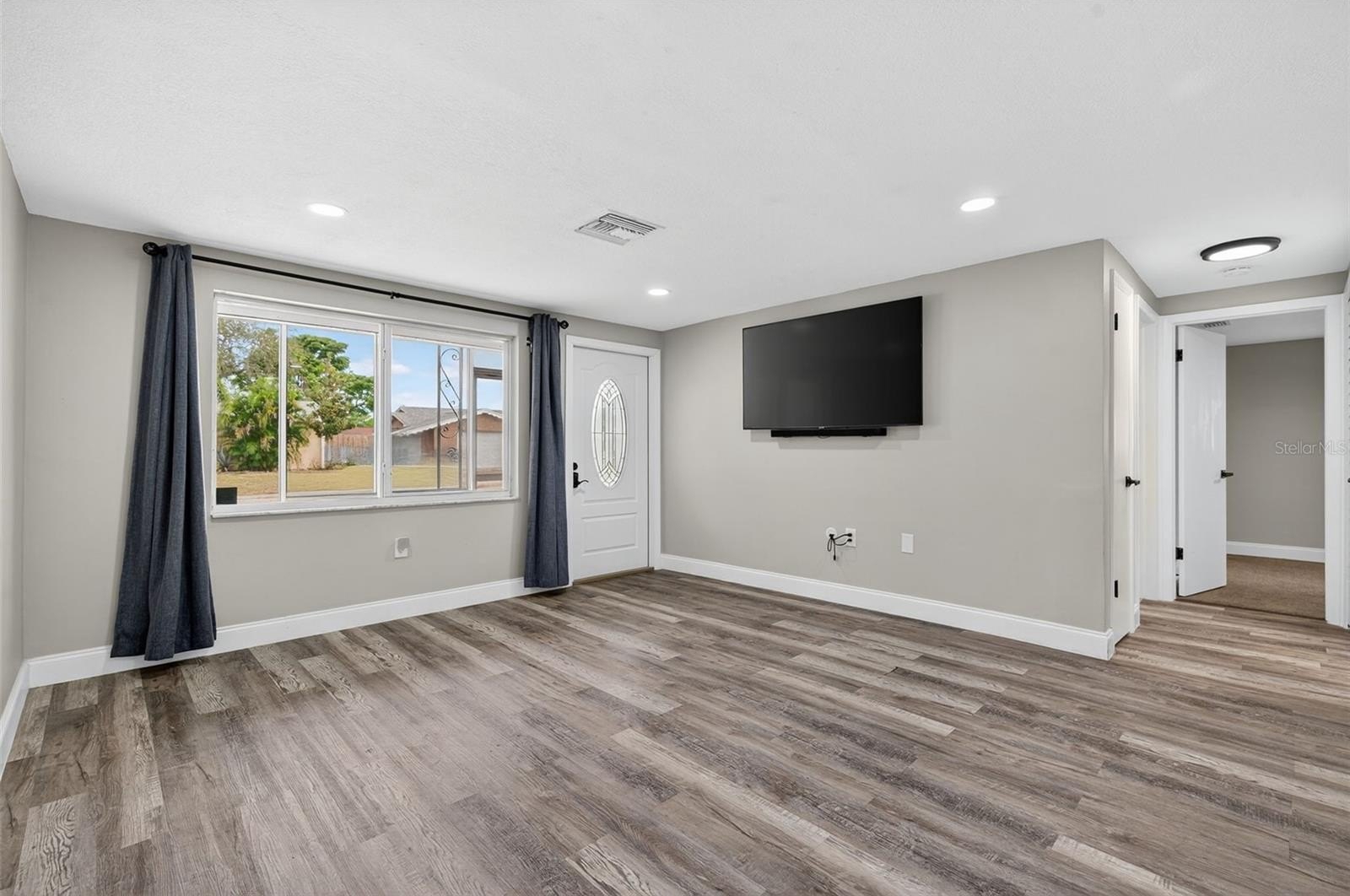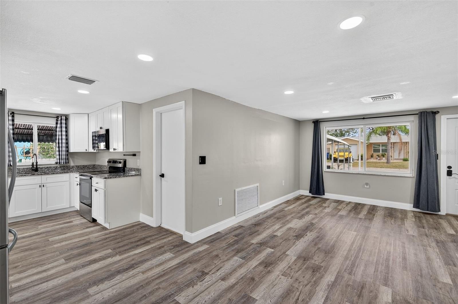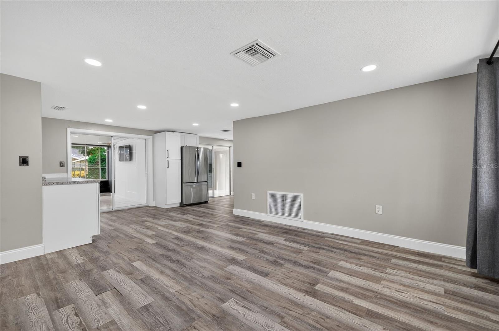 As you arrive, you’re greeted by a screened front porch, the perfect spot for morning coffee or relaxing evenings. Step inside and you’ll immediately notice the wide-open floor plan, where the living room, dining area, and kitchen flow seamlessly together—all highlighted by modern luxury vinyl flooring.