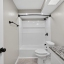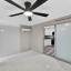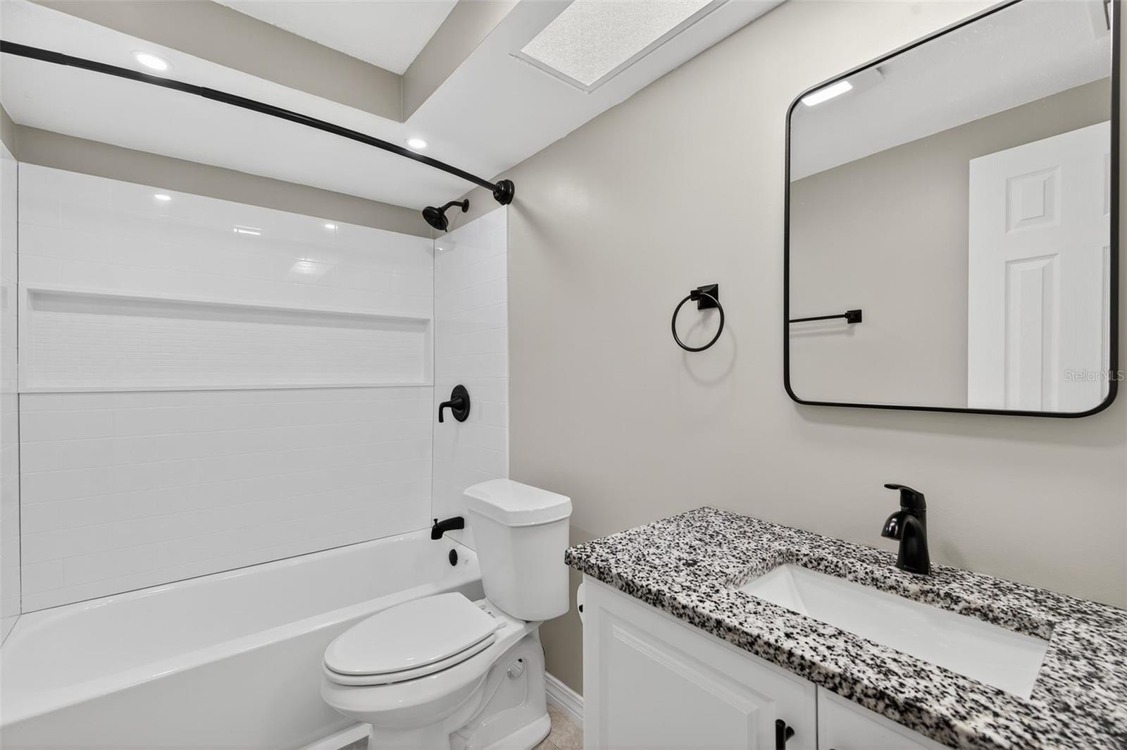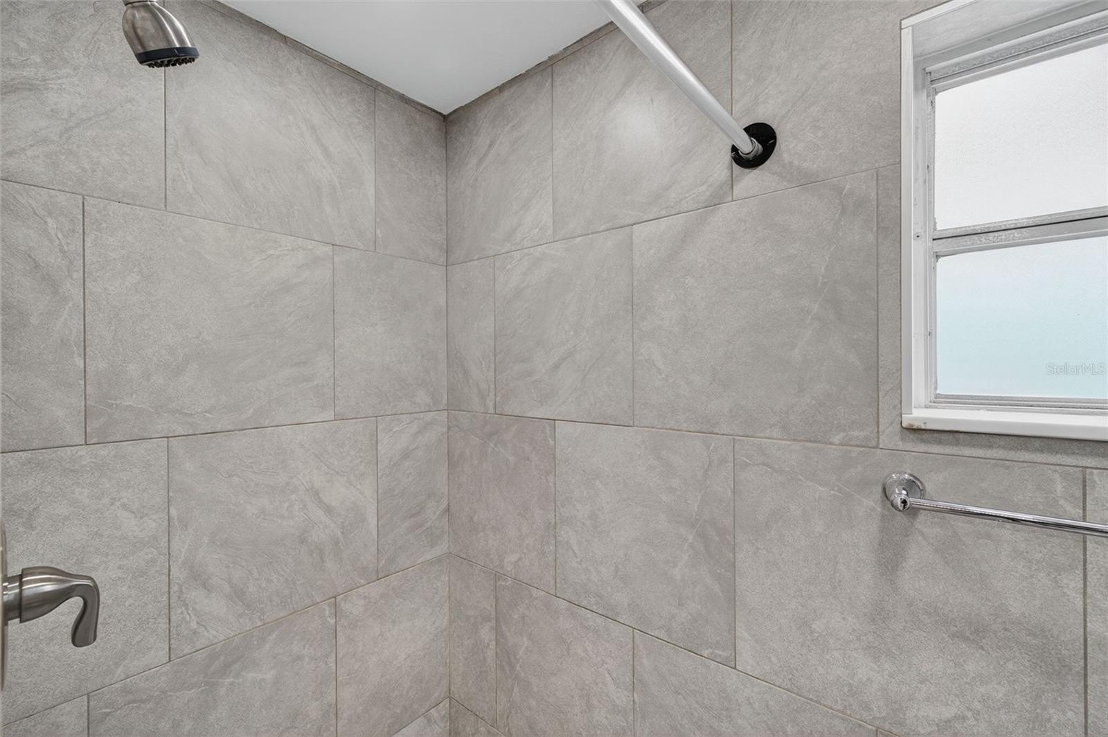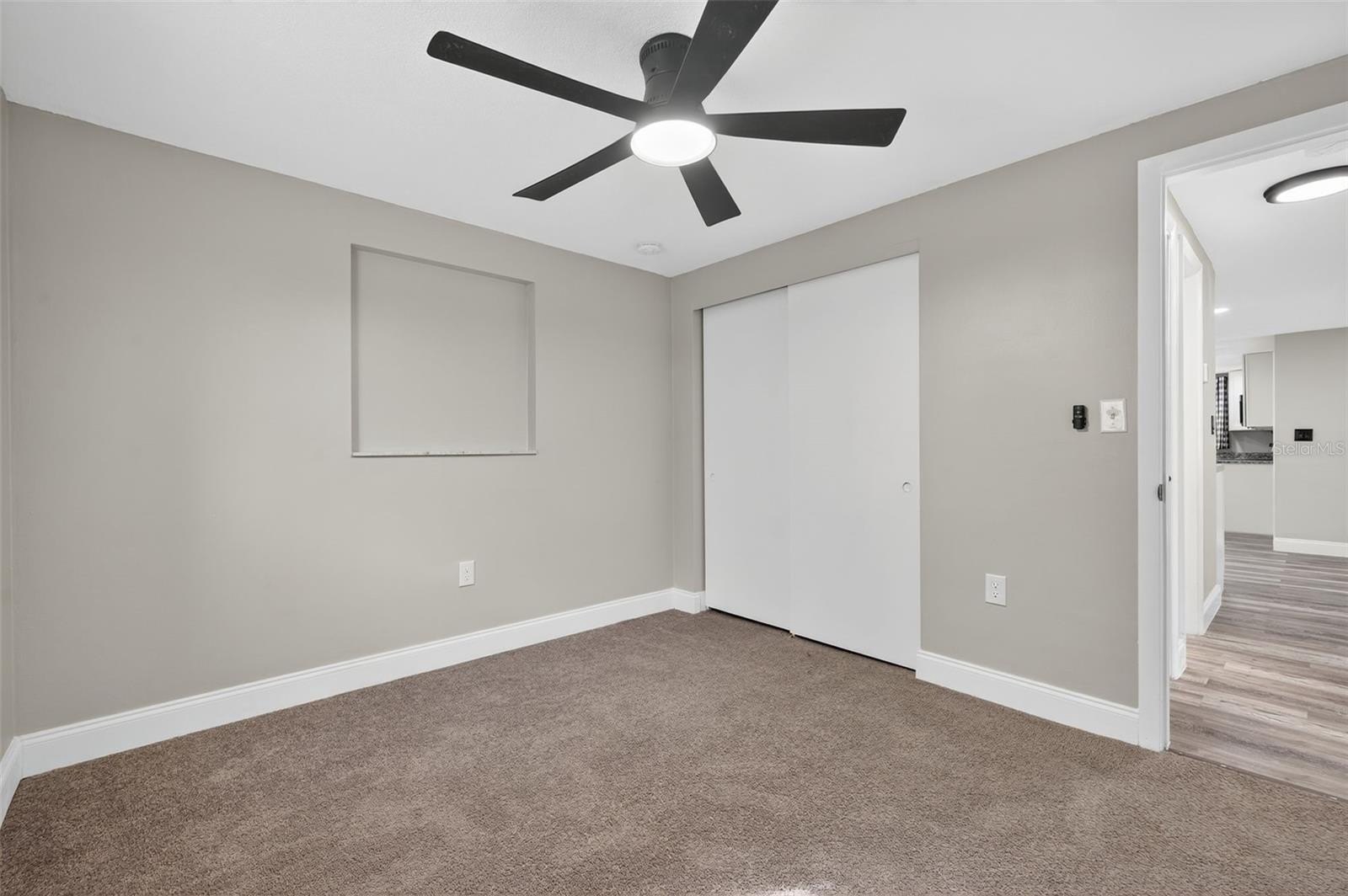 The bedroom wing to the left of the main living space, includes two generously sized bedrooms with cedar-lined closets and a beautifully renovated full bathroom featuring a modern tile shower, updated flooring, and a shaker-style vanity.